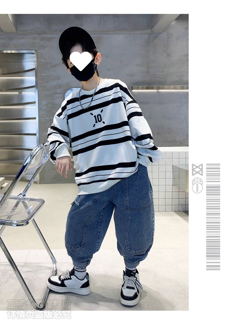 소년 가을 스트라이프 땀 2023 새로운 멋진 잘 생긴 소년 느슨한 라운드 넥 긴 소매 티셔츠 한국 얇은 탑