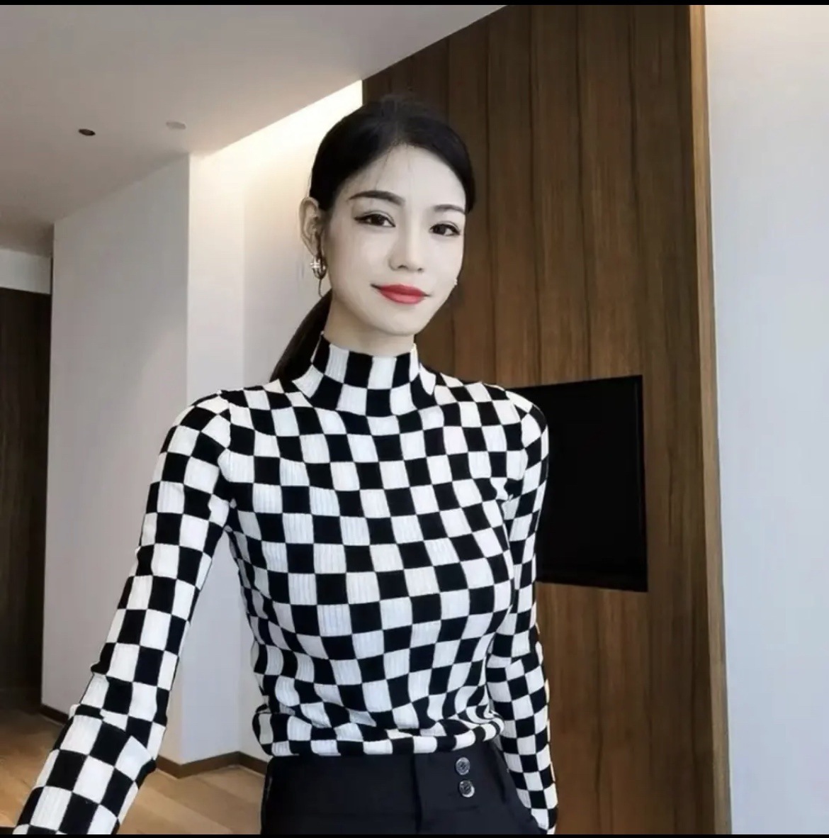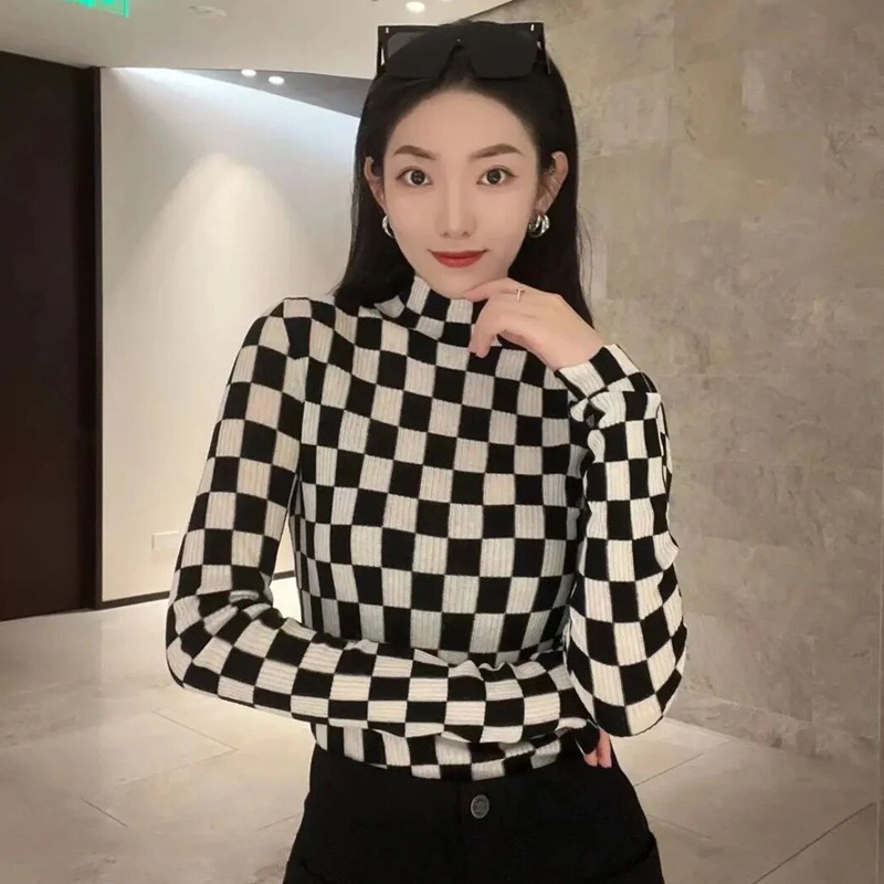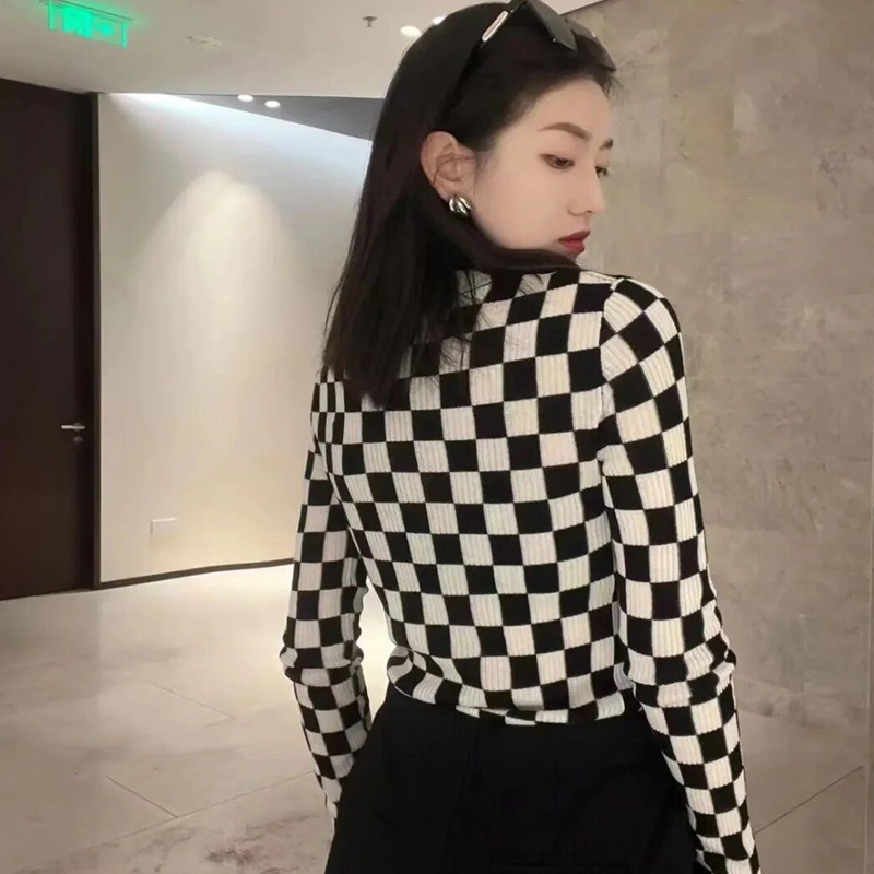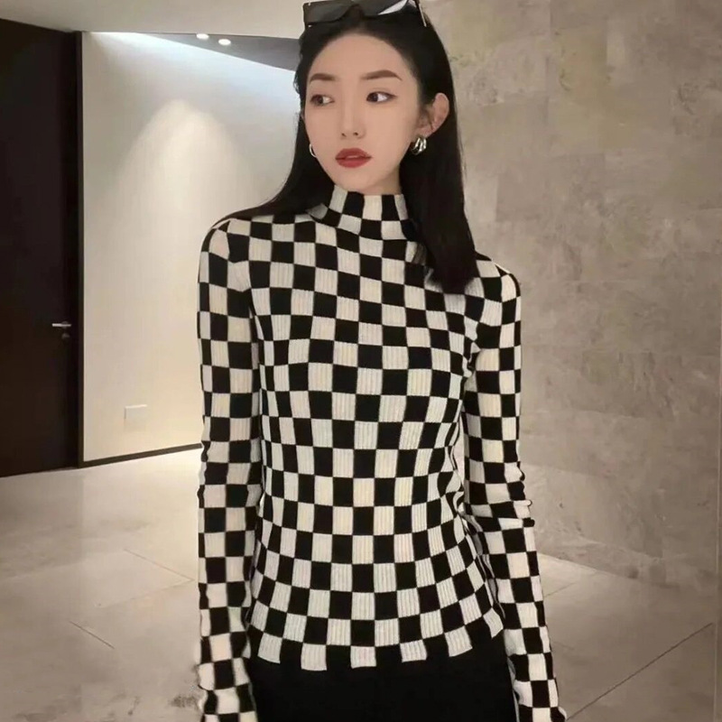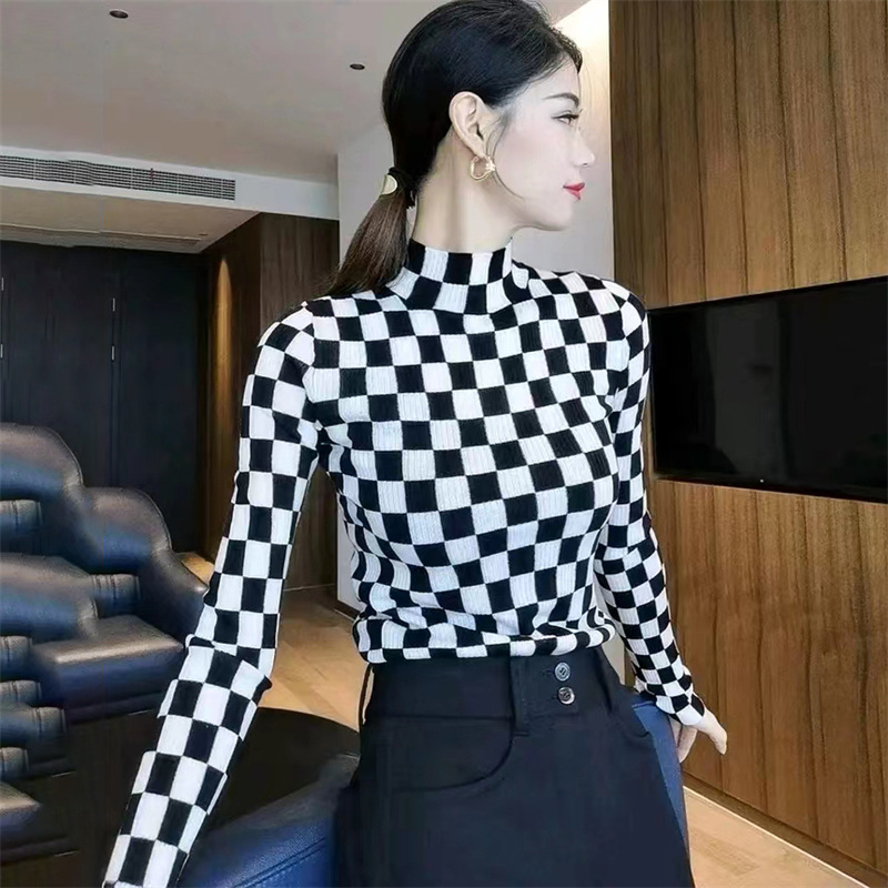 형의 새로운 여성 의류 2023 가을 새로운 체스 판 격자 무늬 하프 하이 칼라 스웨터 캐시미어 스웨터 기본 셔츠 여성스토어 가기