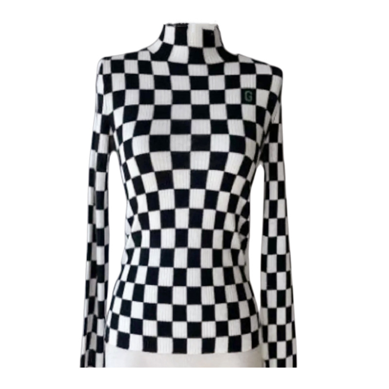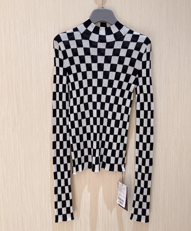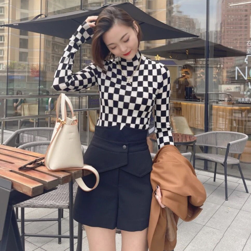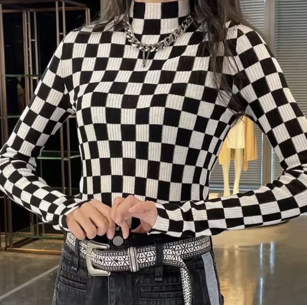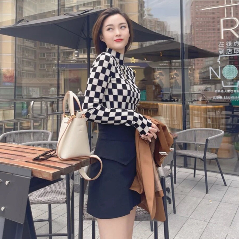 형의 새로운 여성 의류 2023 가을 새로운 체스 판 격자 무늬 하프 하이 칼라 스웨터 캐시미어 스웨터 기본 셔츠 여성스토어 가기