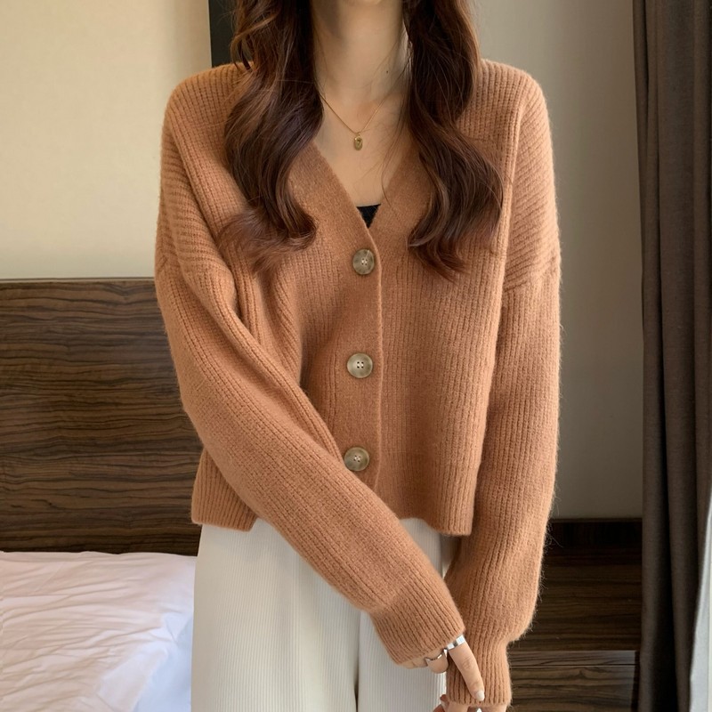 한국 스타일 젠틀 스타일 솔리드 컬러 심플 만능 스웨터 여성 코트 봄과 가을 새로운 슬림핏 슬리밍 짧은 니트 가디건