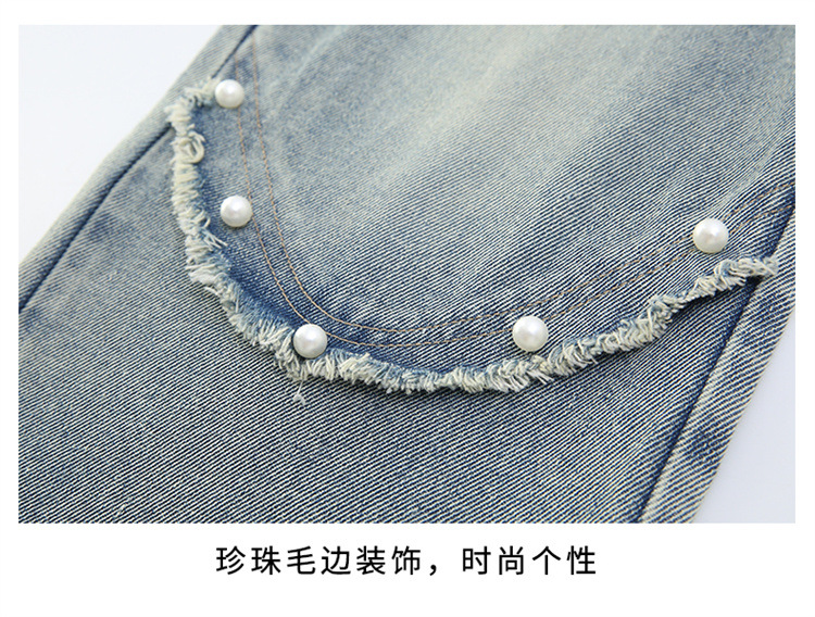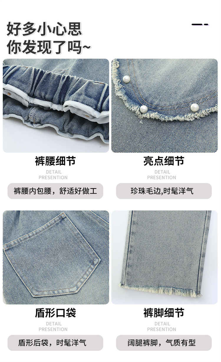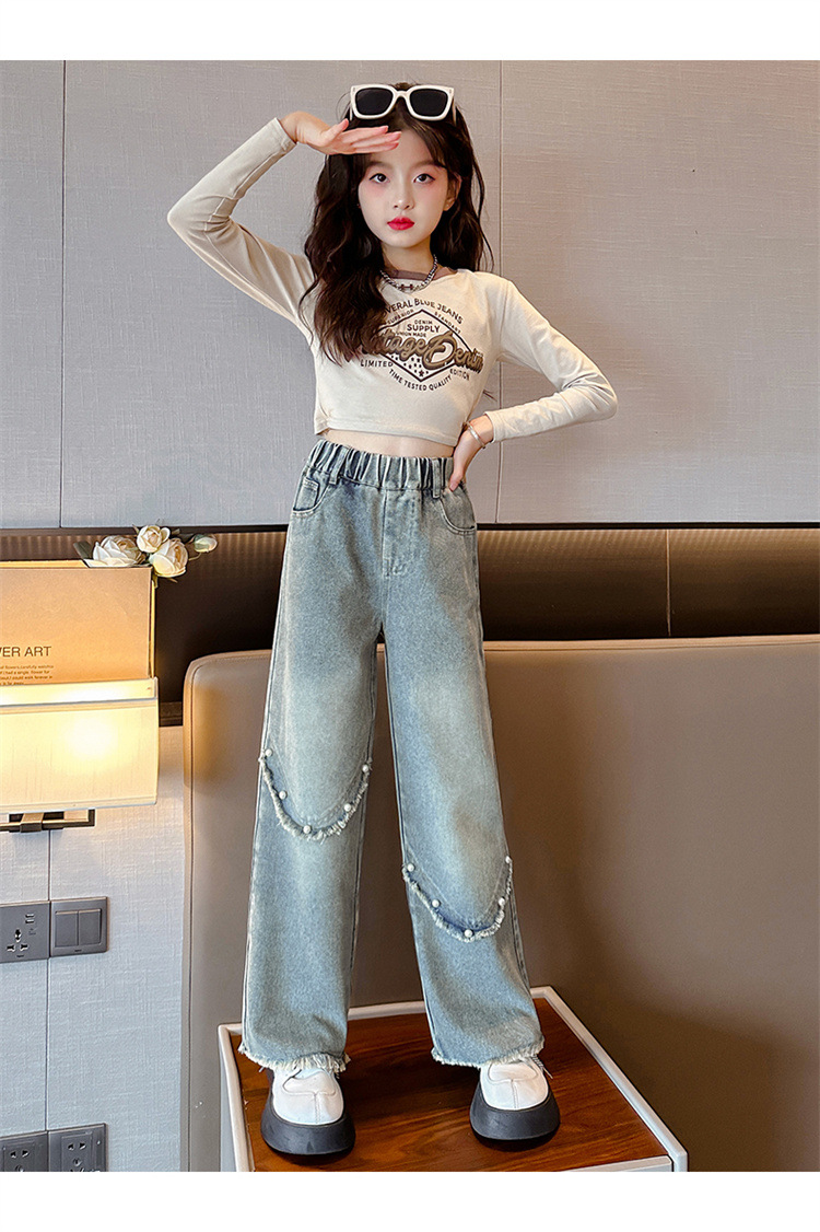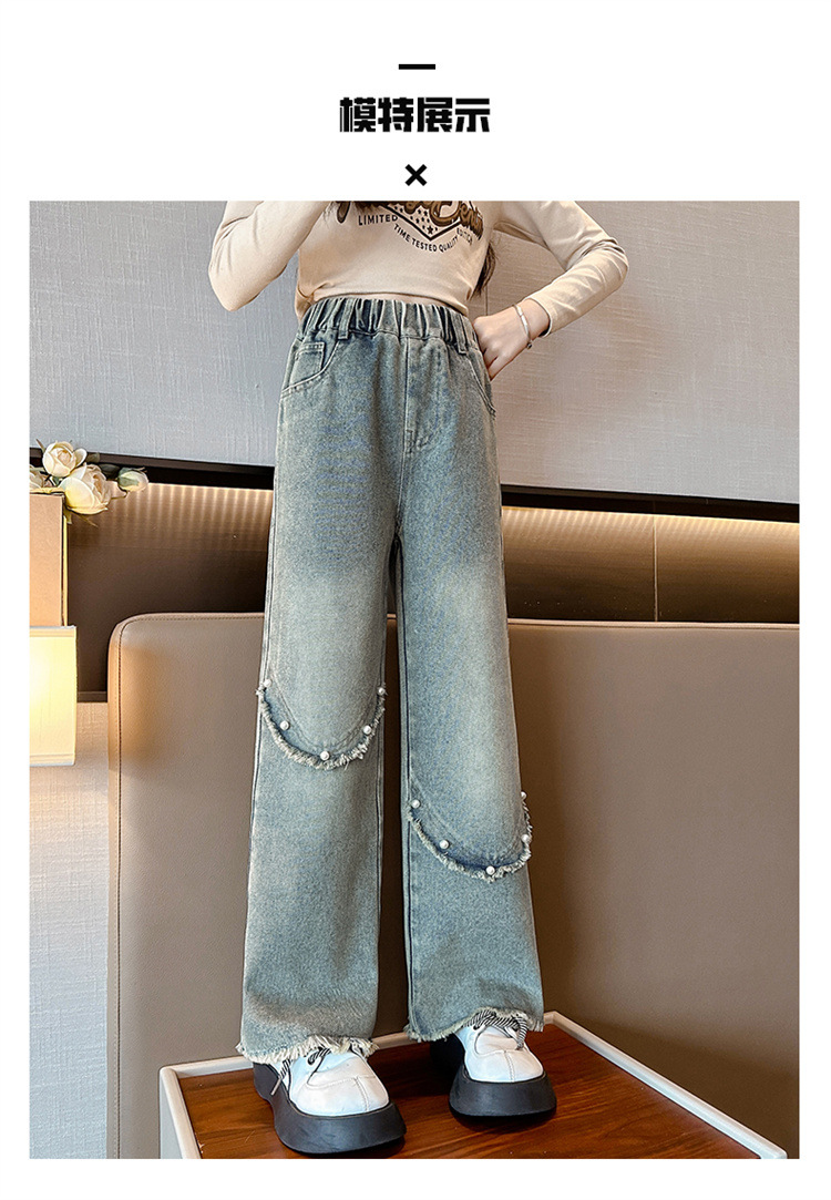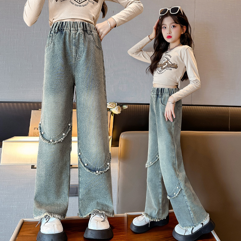 여아 레트로 루즈 청바지 가을 새로운 한국 스타일 세트 진주 와이드 레그 팬츠 겉옷 어린이 바지 크로스 보더 도매 조수스토어 가기