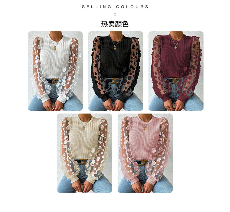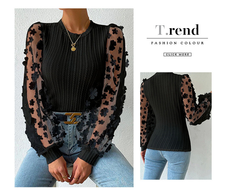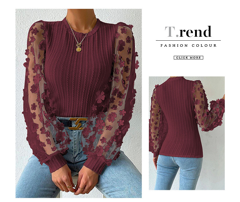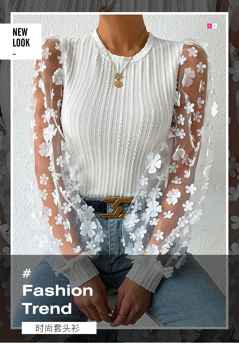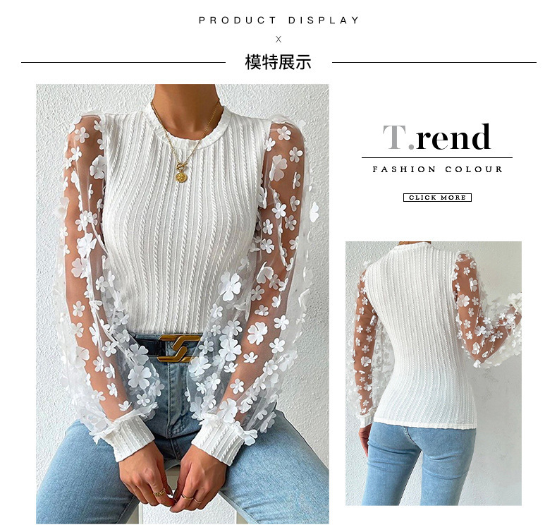 유럽과 미국의 국경 여성 메쉬 꽃 쉬폰 셔츠 여성 2024 봄, 여름 라운드 넥 슬림 풀오버 긴팔 탑스토어 가기