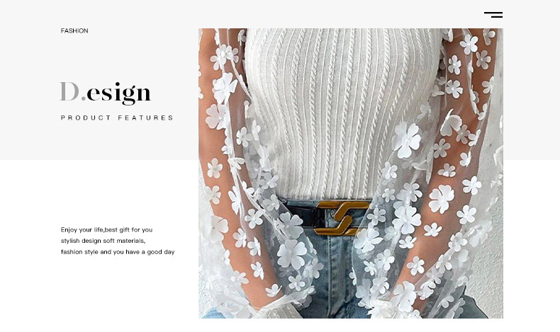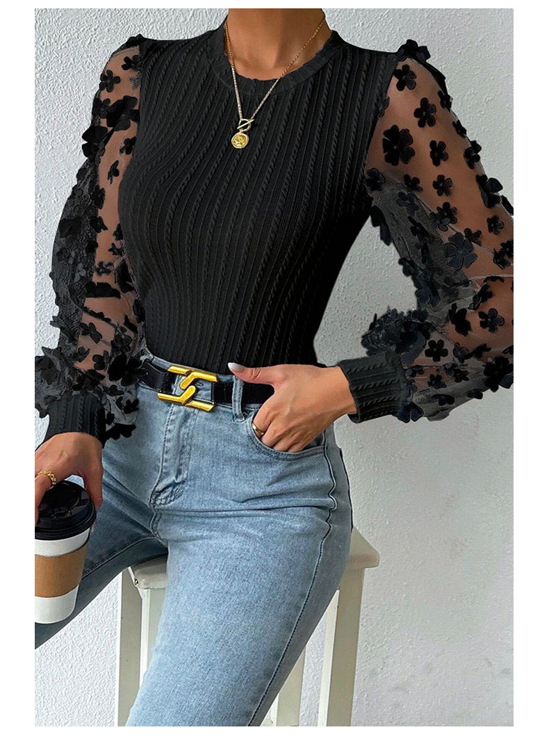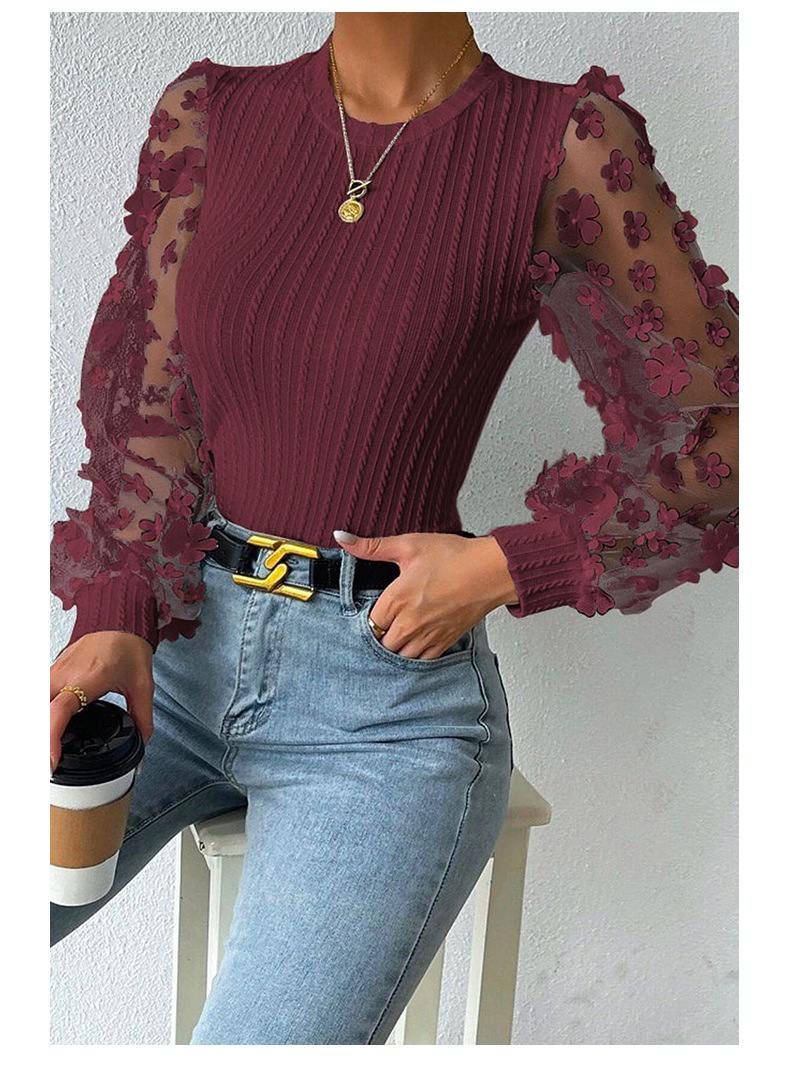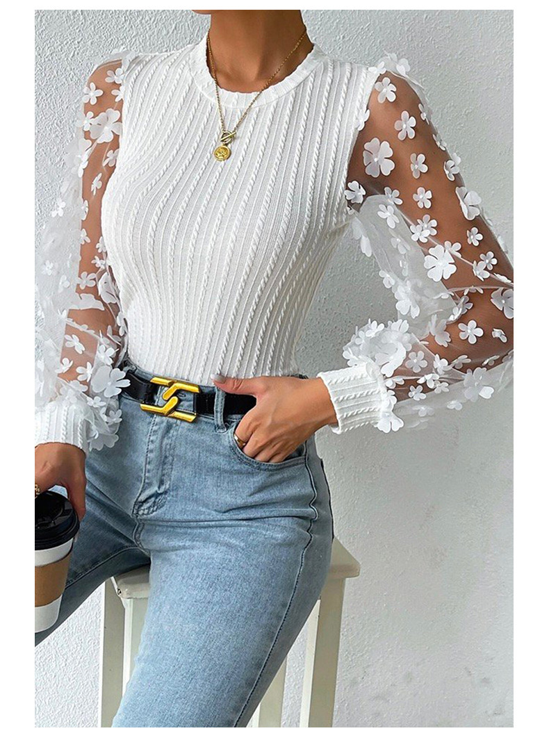 유럽과 미국의 국경 여성 메쉬 꽃 쉬폰 셔츠 여성 2024 봄, 여름 라운드 넥 슬림 풀오버 긴팔 탑