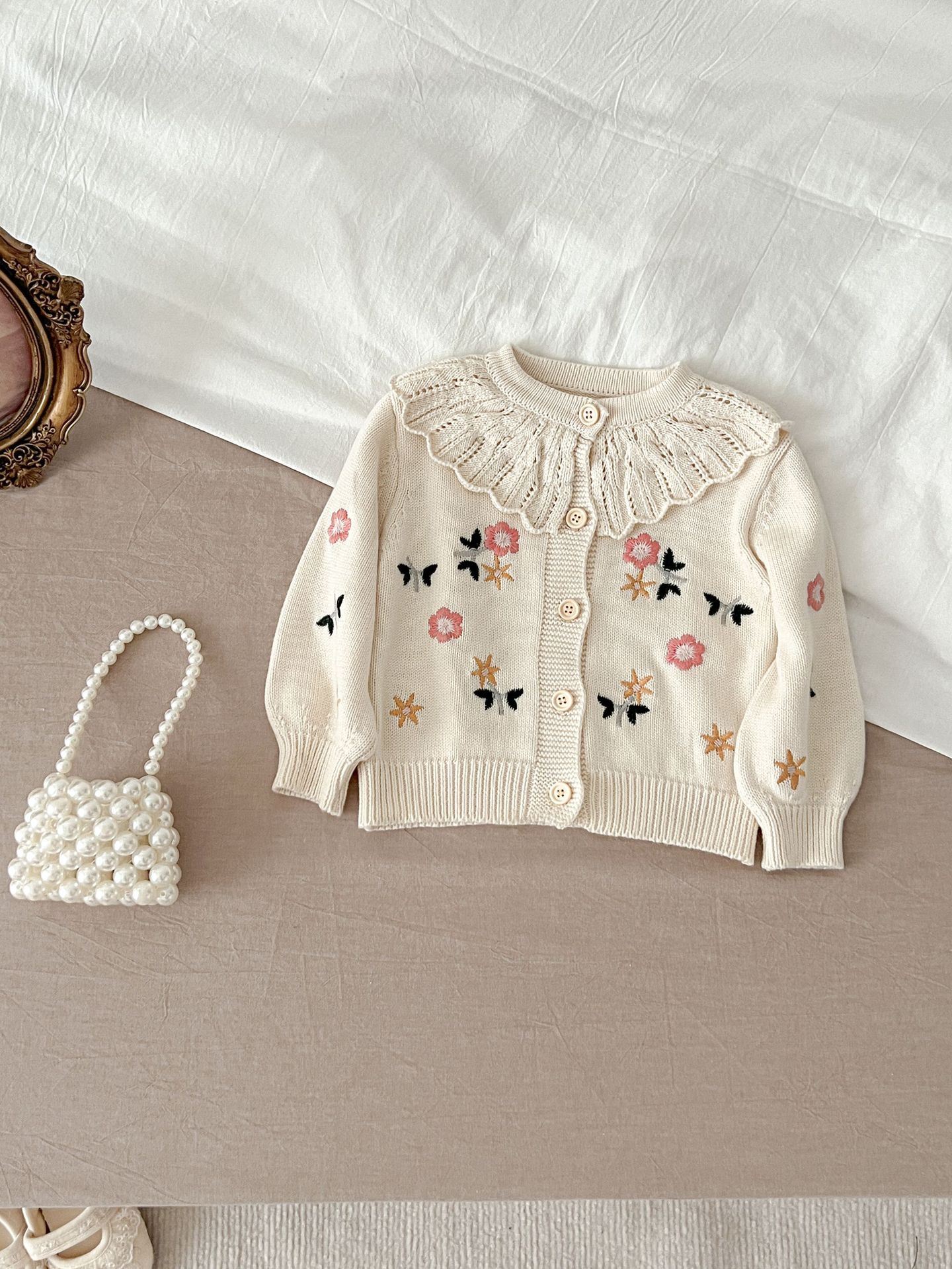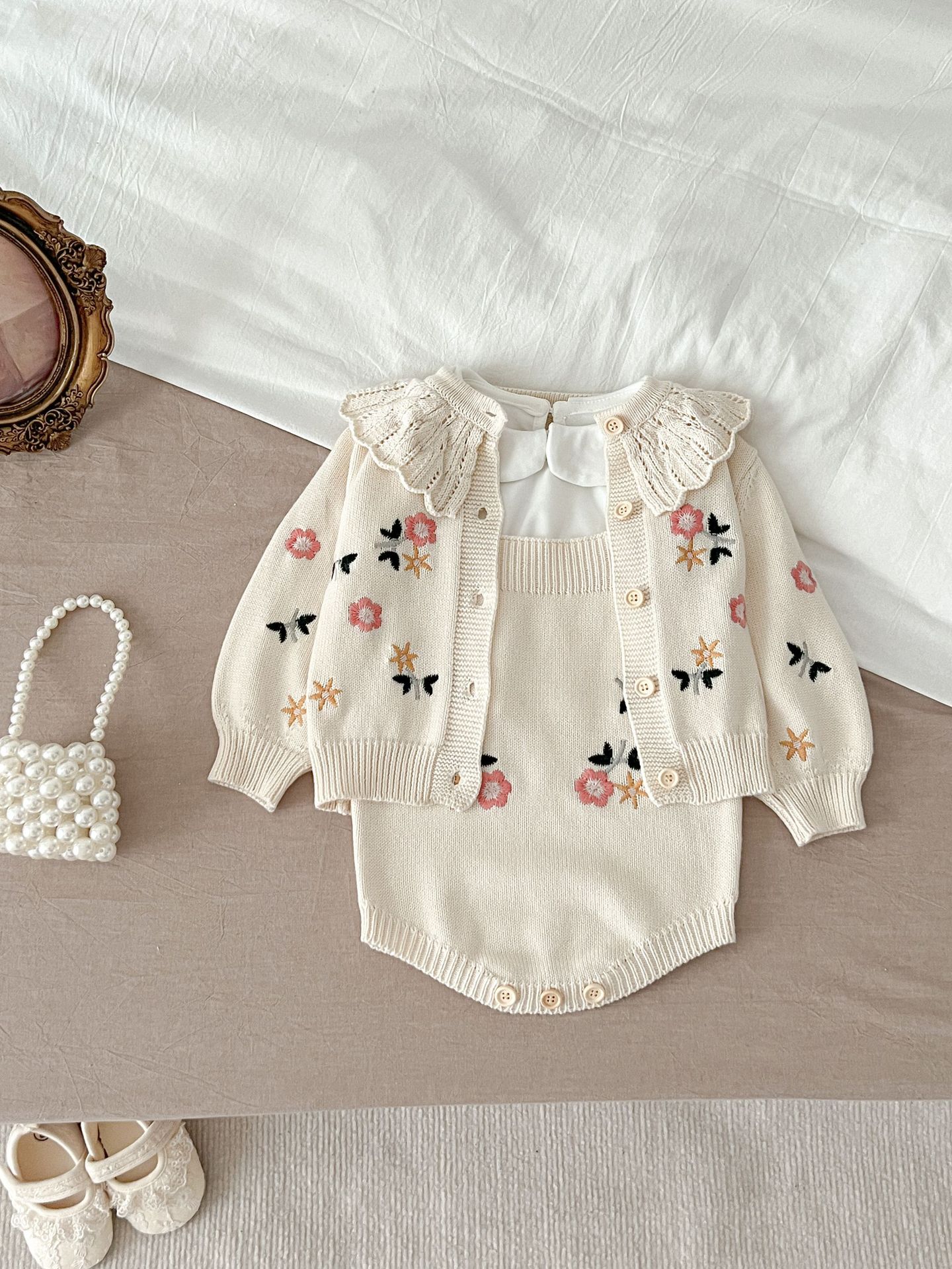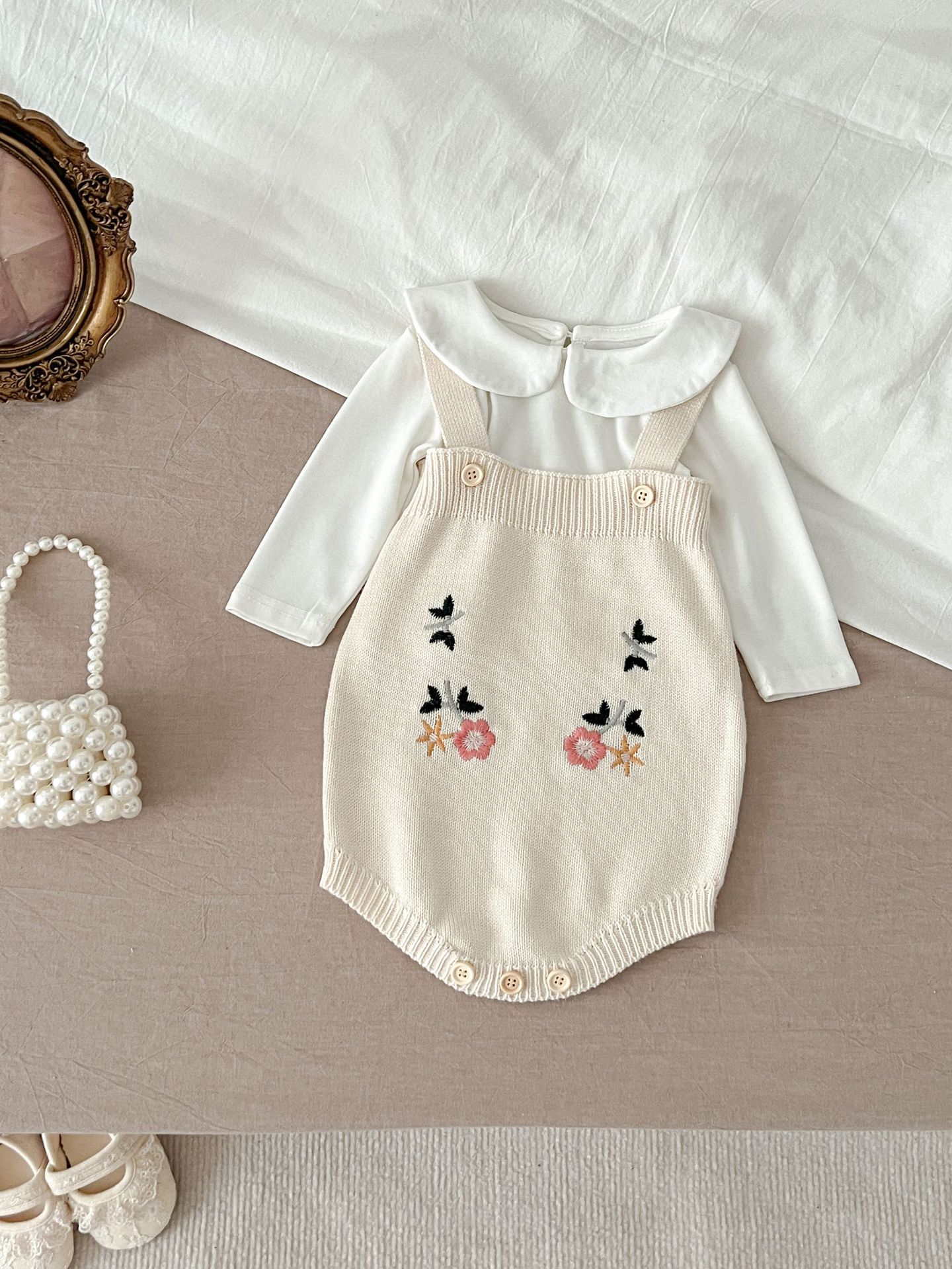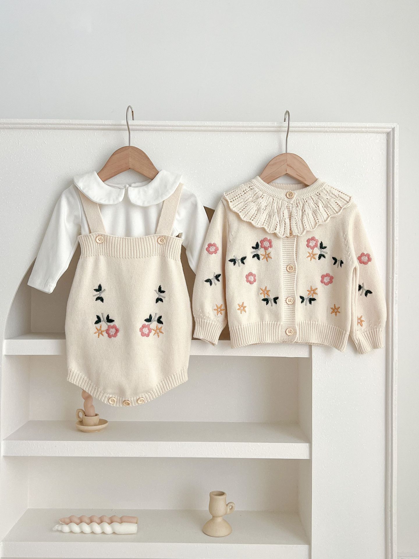2025 가을 의류 유아 및 아동 여아 정장 자수 연꽃 잎 칼라 니트 탑 + 서스펜더 2피스 정장스토어 가기
