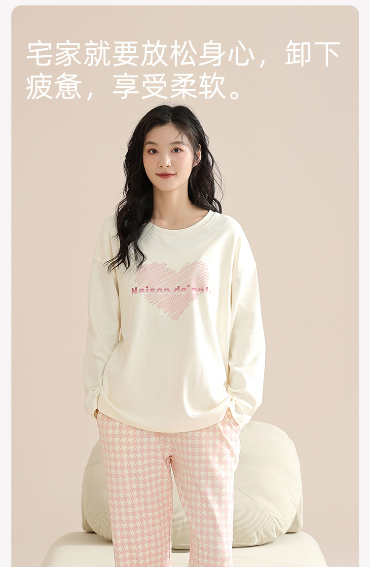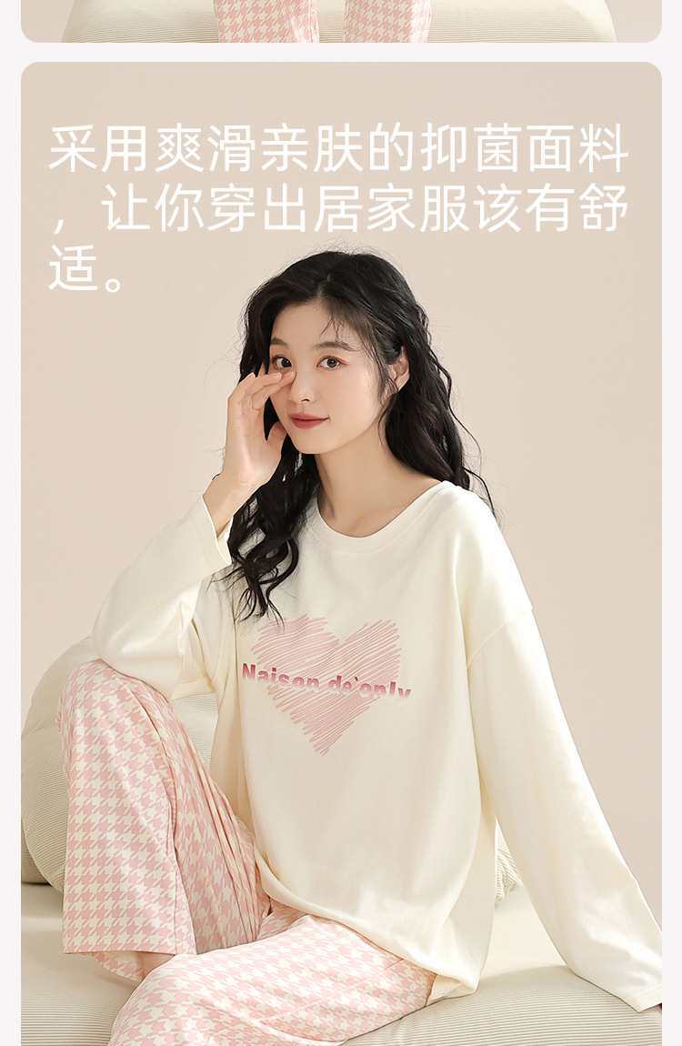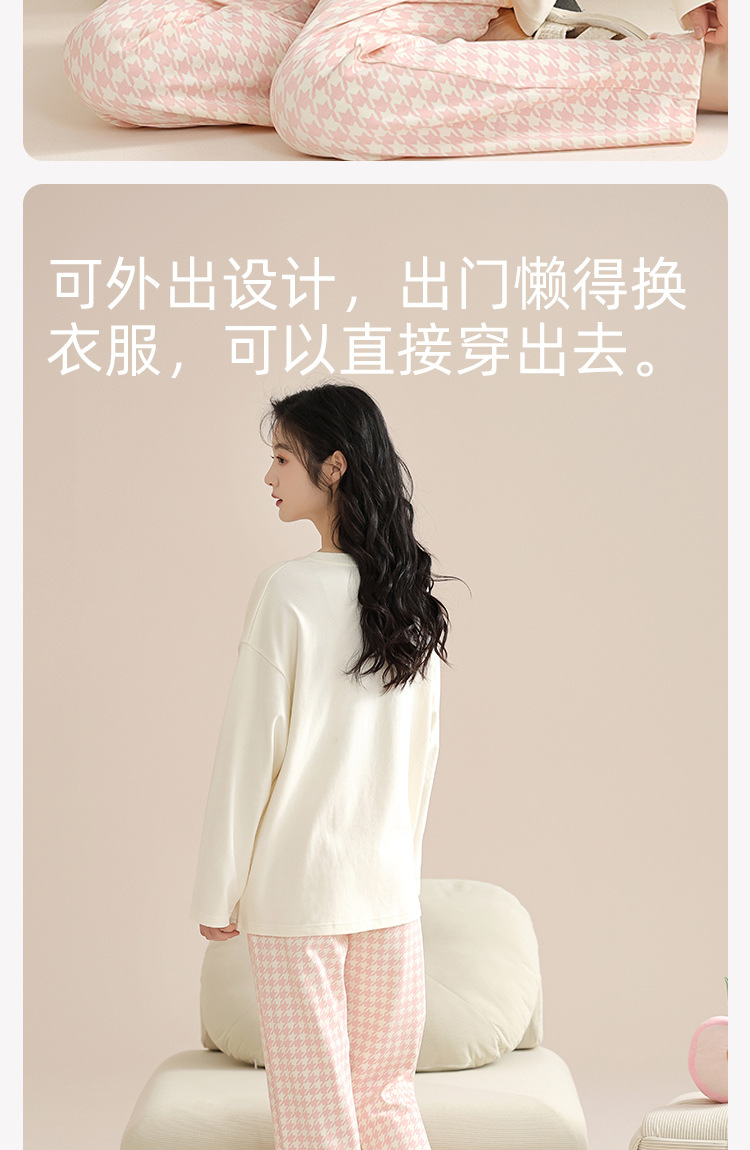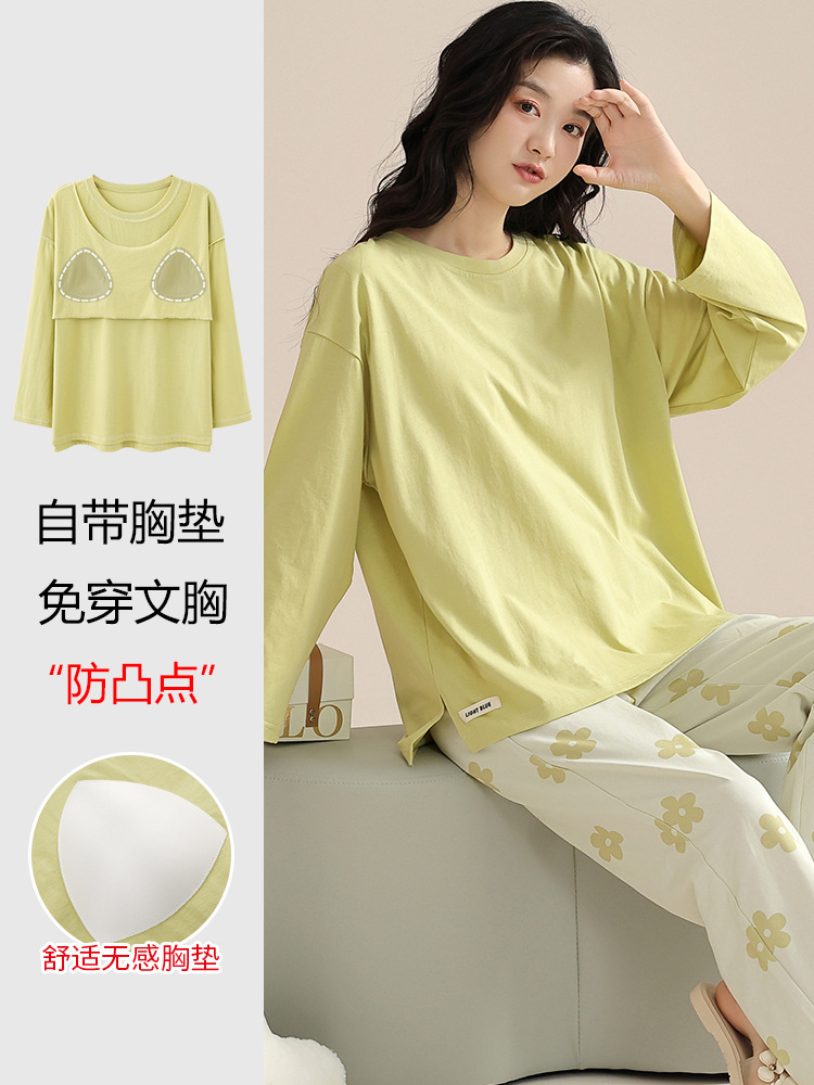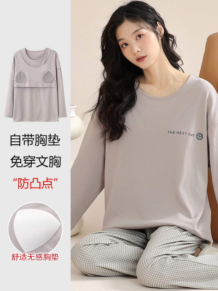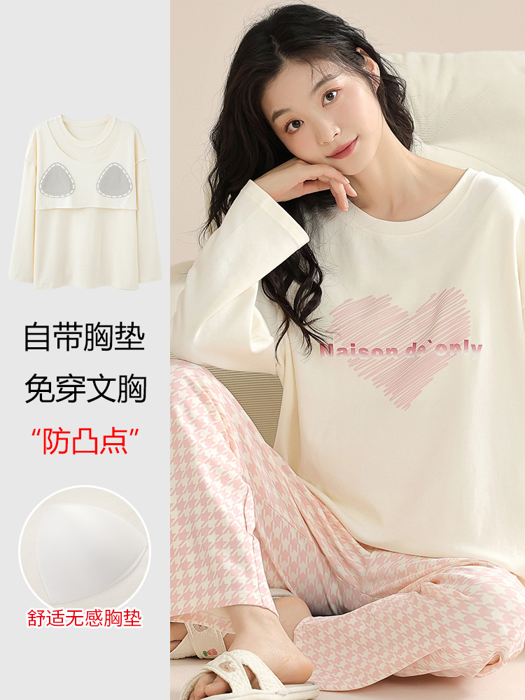 가슴 패드가있는 다양한 잠옷 여성용 가을과 겨울 라운드 넥 코튼 긴 소매 바지 가정용 의류는 투피스 세트 밖에서 착용 할 수 있습니다