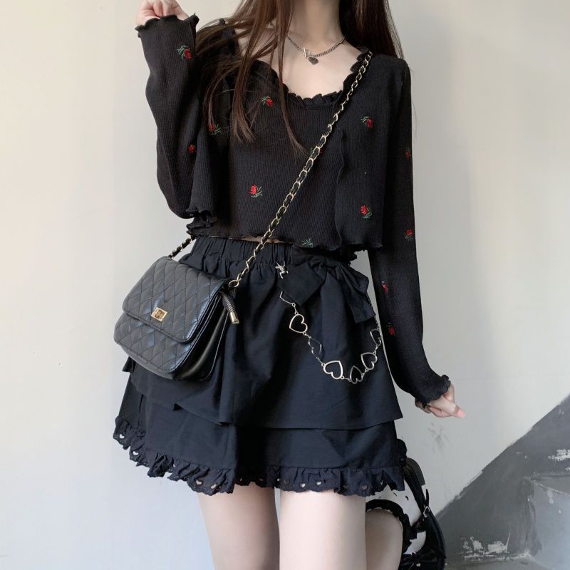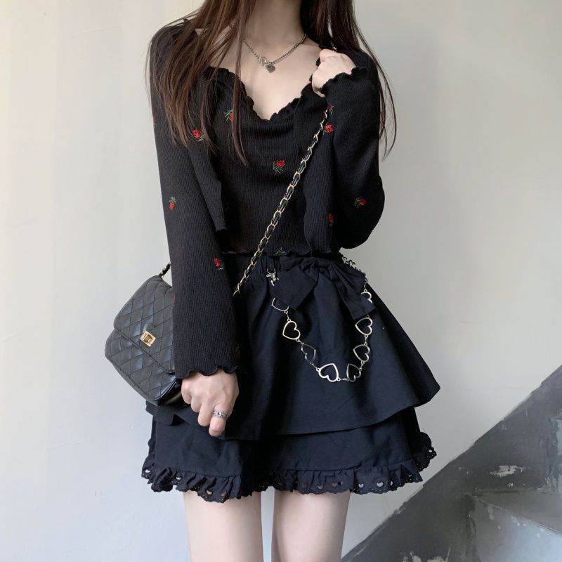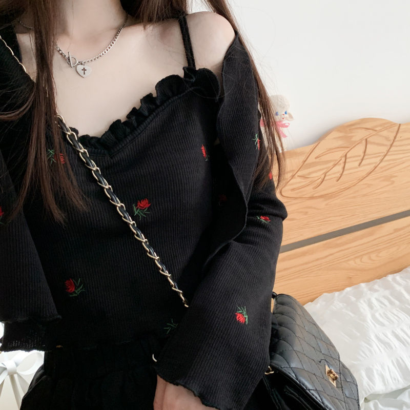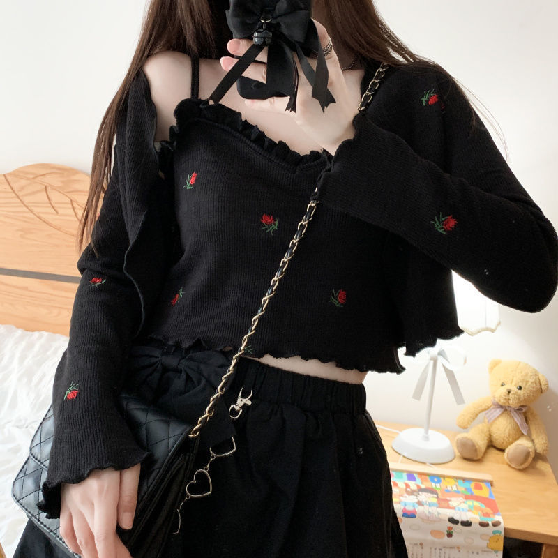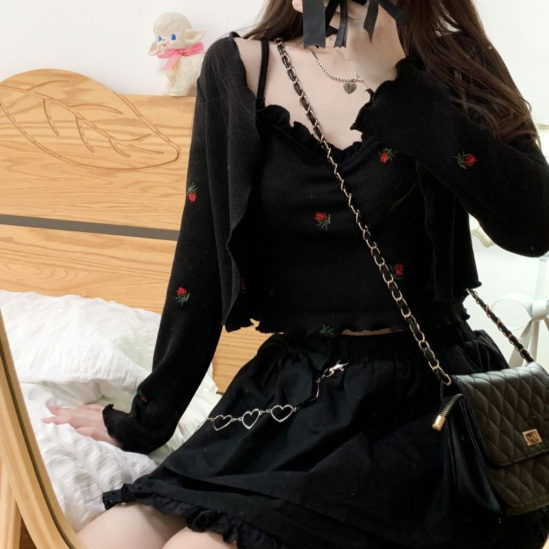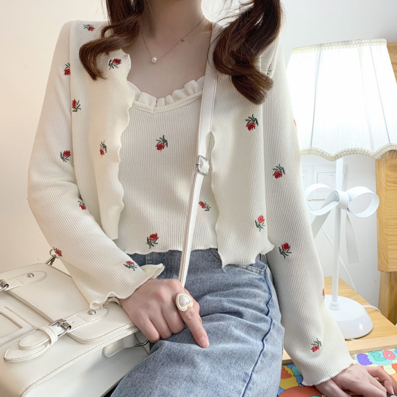 일본식 부드러운 소녀 자수 작은 슬링 봄 새로운 달콤한 소녀 느슨한 긴 소매 가디건 투피스 세트