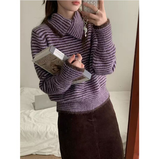 温柔韩风软糯撞色条纹翻领毛衣女2025秋冬新款气质收腰显瘦针织衫