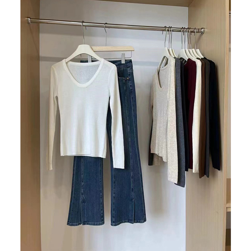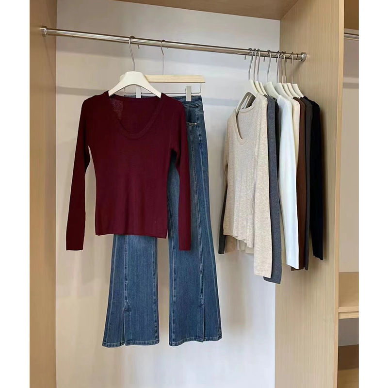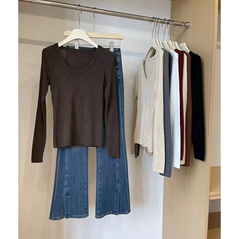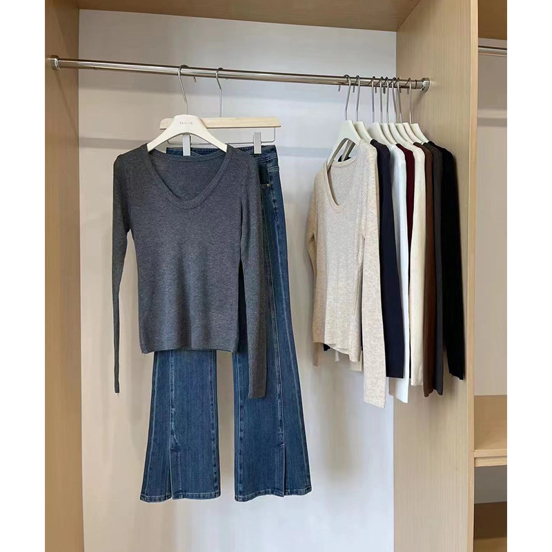 한국 심플하고 고급스러운 그레이 U넥 니트 여성용 가을 겨울 다용도 신상 슬림핏 이너웨어스토어 가기
