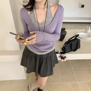 辣妹纯欲风拼接撞色假两件长袖针织打底衫女新款修身显瘦短款上衣