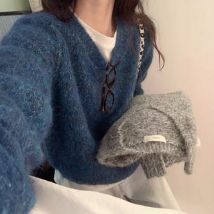 韩系复古质感混纱V领慵懒风毛衣女秋冬2025新款套头宽松针织上衣