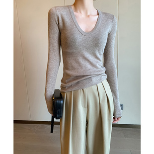 한국 심플하고 고급스러운 그레이 U넥 니트 여성용 가을 겨울 다용도 신상 슬림핏 이너웨어