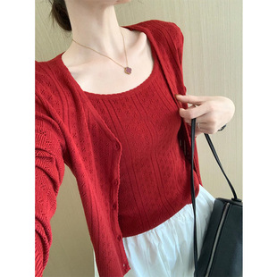 韩系简约镂空针织开衫+内搭吊带背心两件套女秋季新款细羊毛上衣