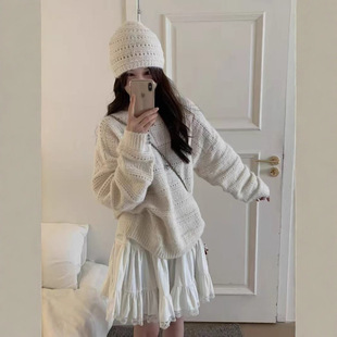十三行新款韩系镂空毛衣2025秋季女装宽松慵懒风圆领针织衫配帽子