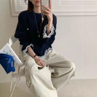 韩系超好看新品秋冬甜美蕾丝拼接短款套头毛衣女软糯圆领针织上衣