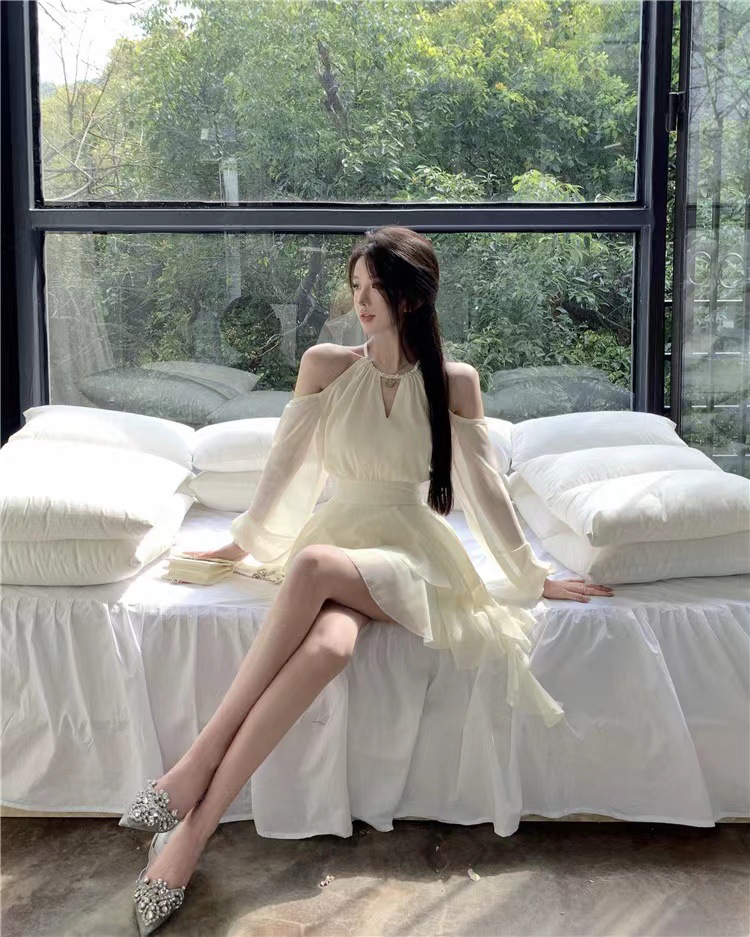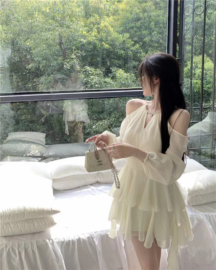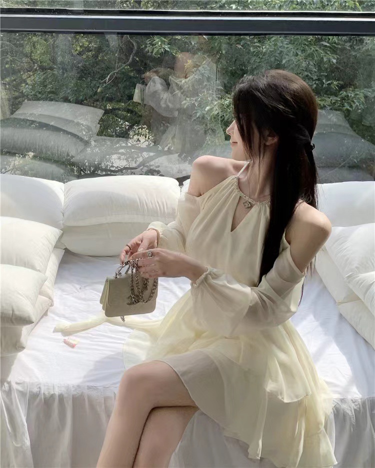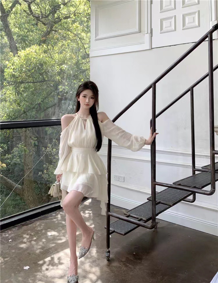 [쉬폰 + 라이닝 + 지퍼] 프랑스 스타일의 살구색 긴 소매 원피스 허리 슬리밍 슈퍼 요정 주름 케이크 스커트