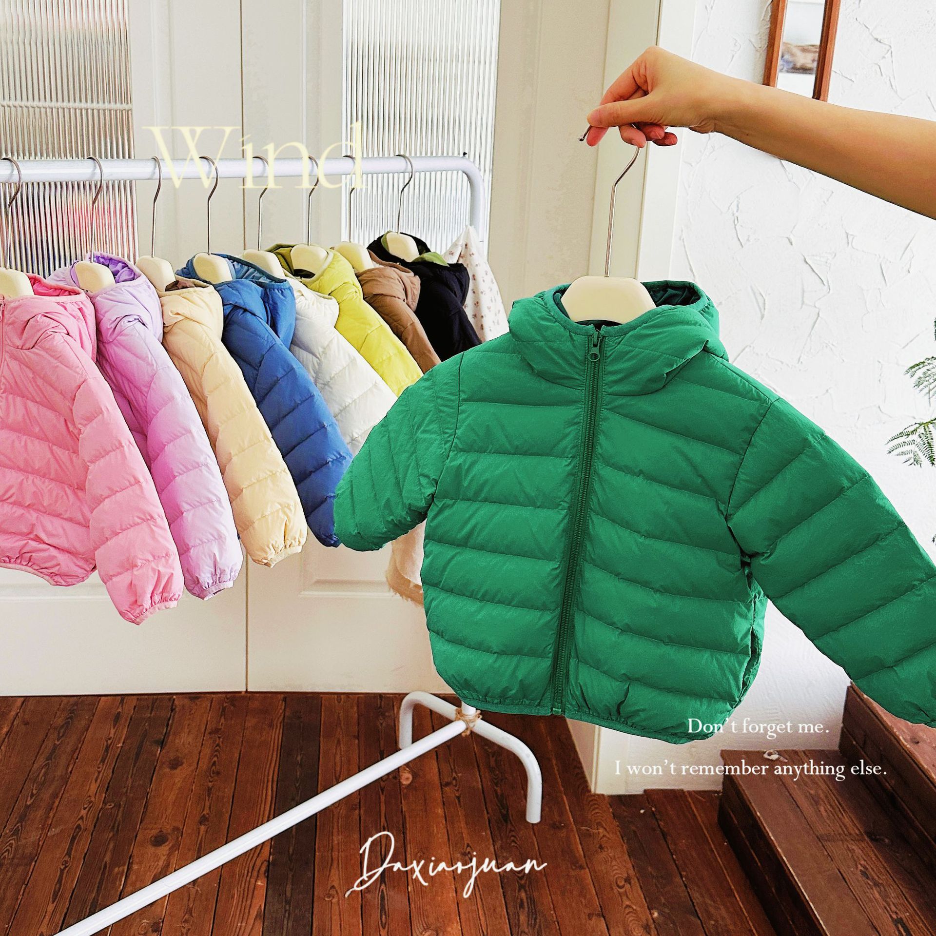 재고 사이즈 롤 23 가을/겨울 어린이 90 화이트 오리 다운 단색 경량 다운 재킷 후드 재킷 유행 아동 의류스토어 가기