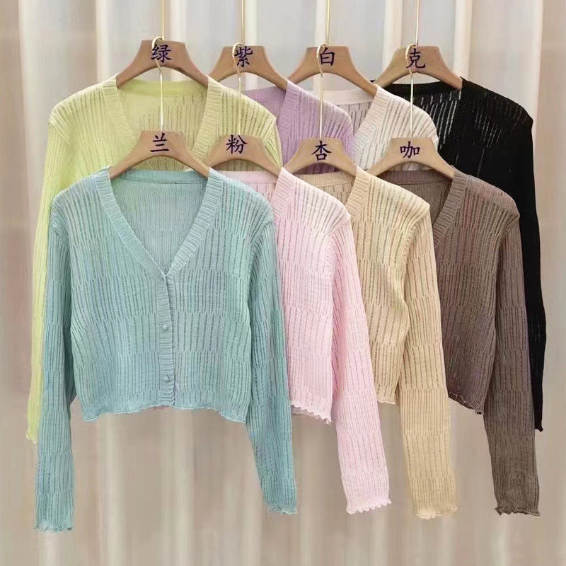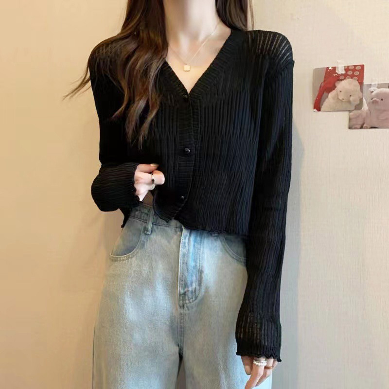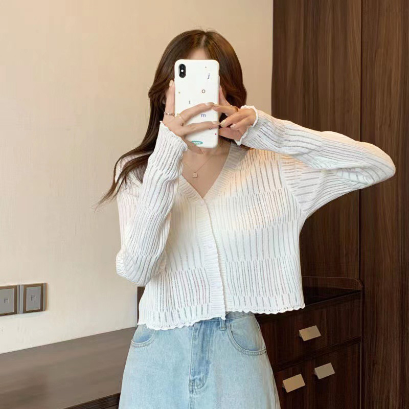 여성용 얇은 외부 카디건 가을 2023 새로운 긴팔 V-넥 탑 디자인 자외선 차단제 짧은 니트 재킷스토어 가기