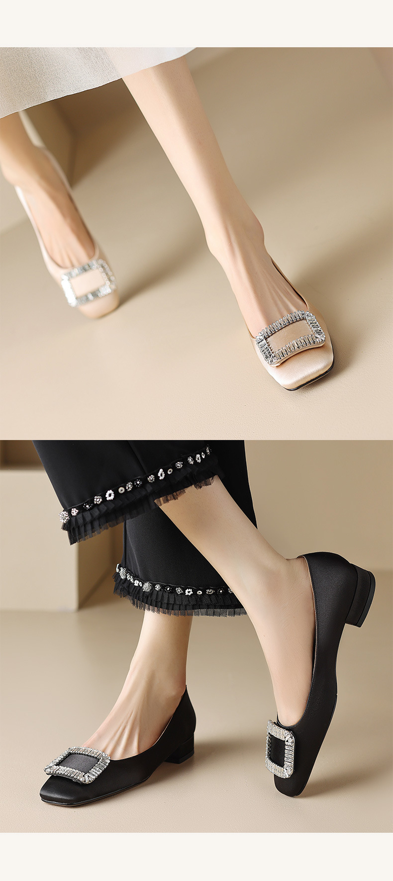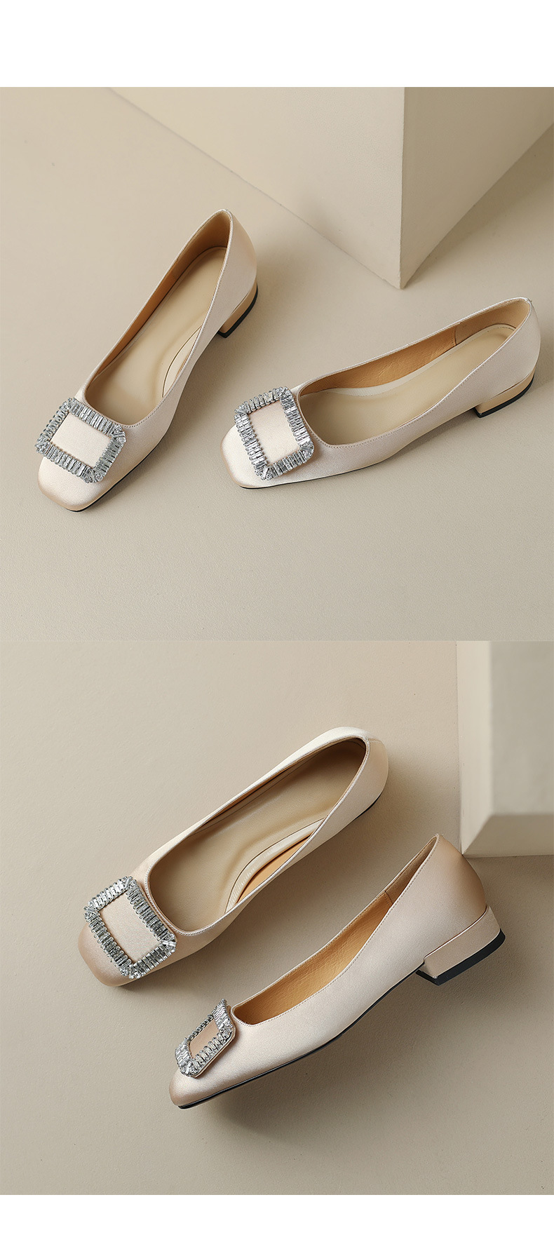 2023 새로운 봄과 가을 스퀘어 토 얕은 입 싱글 슈즈 여성용 미들 힐 두꺼운 힐 디자인 틈새 소프트 하단 스퀘어 버클 모든 매치
