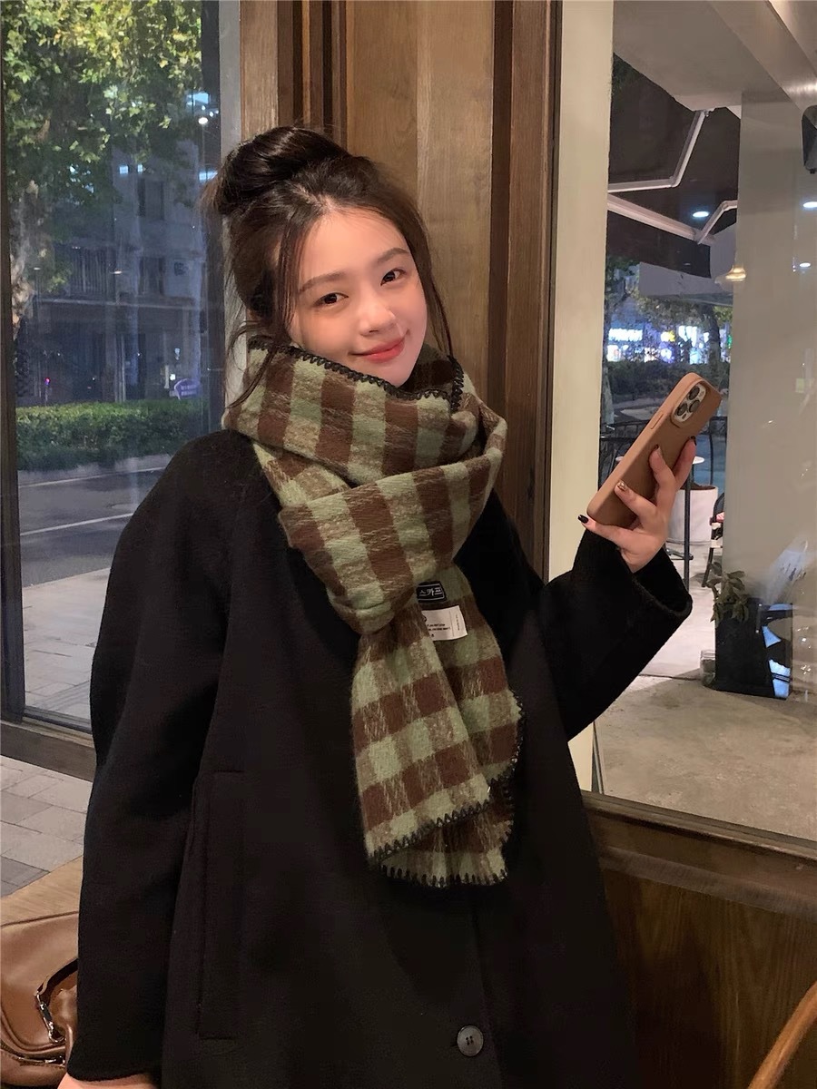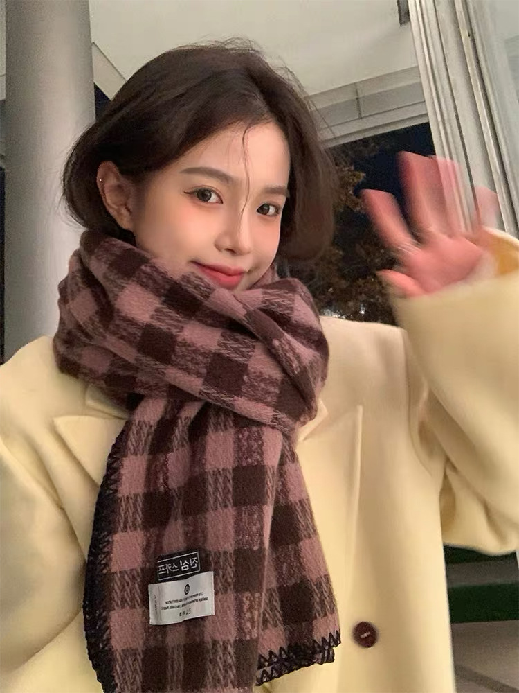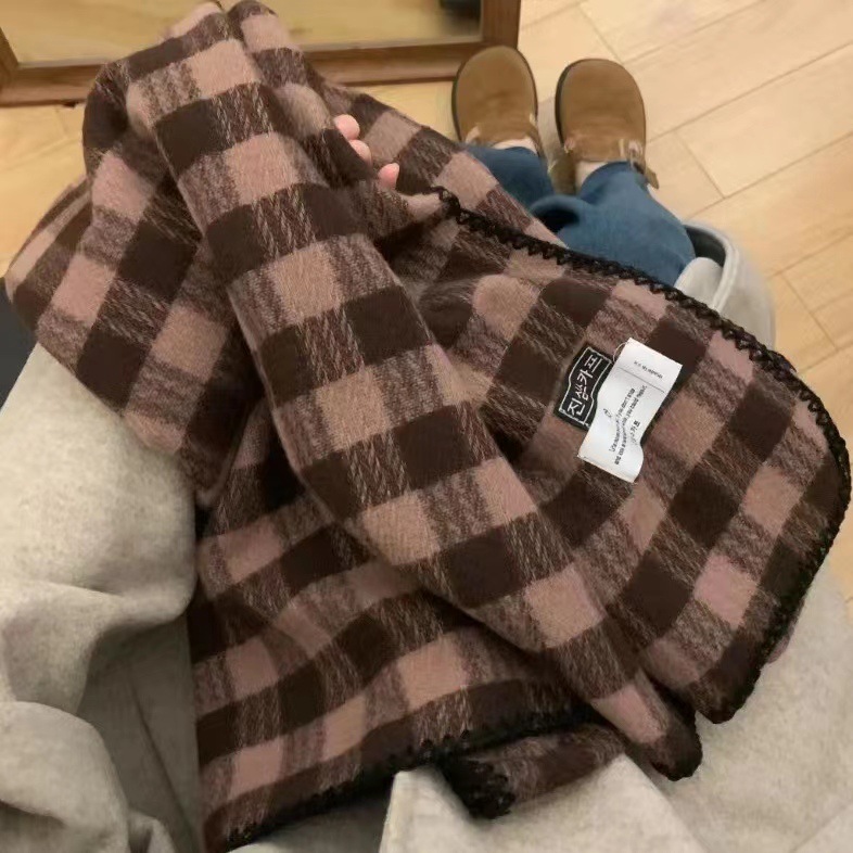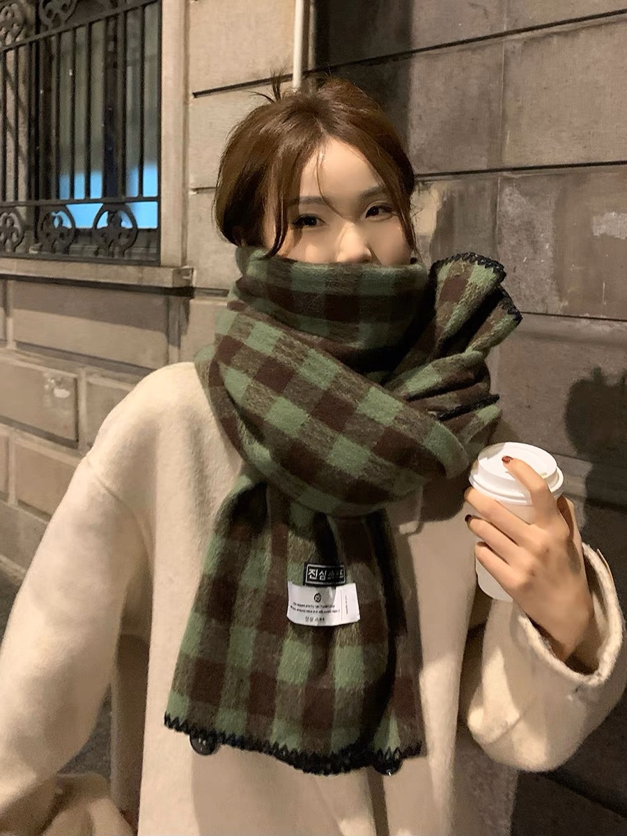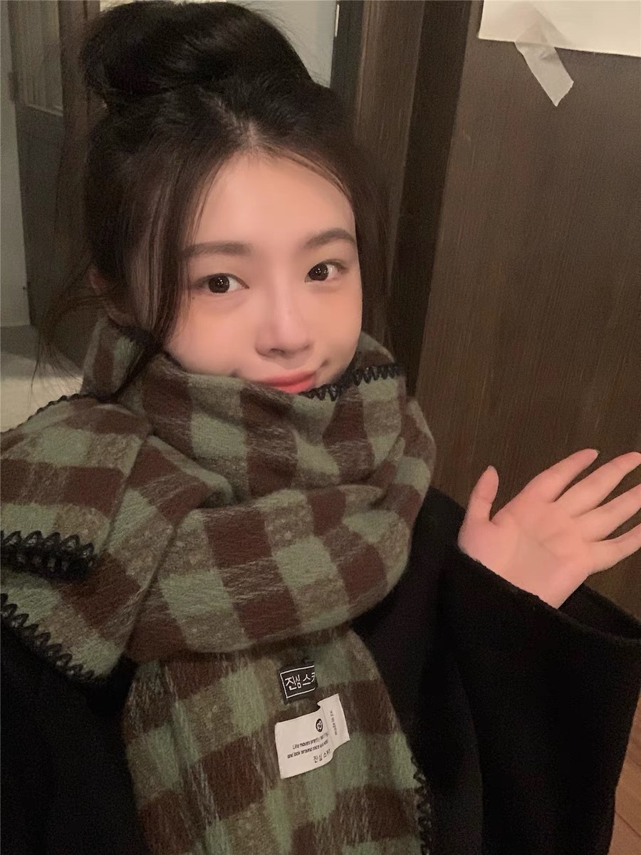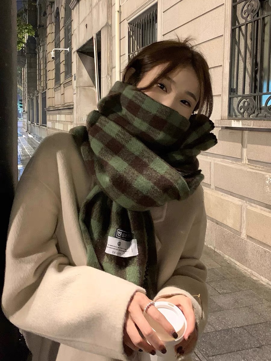 2023 새로운 빈티지 격자 무늬 스카프 여성용 겨울 두꺼운 한국식 학생 숄 화이트 분위기 따뜻한 목스토어 가기