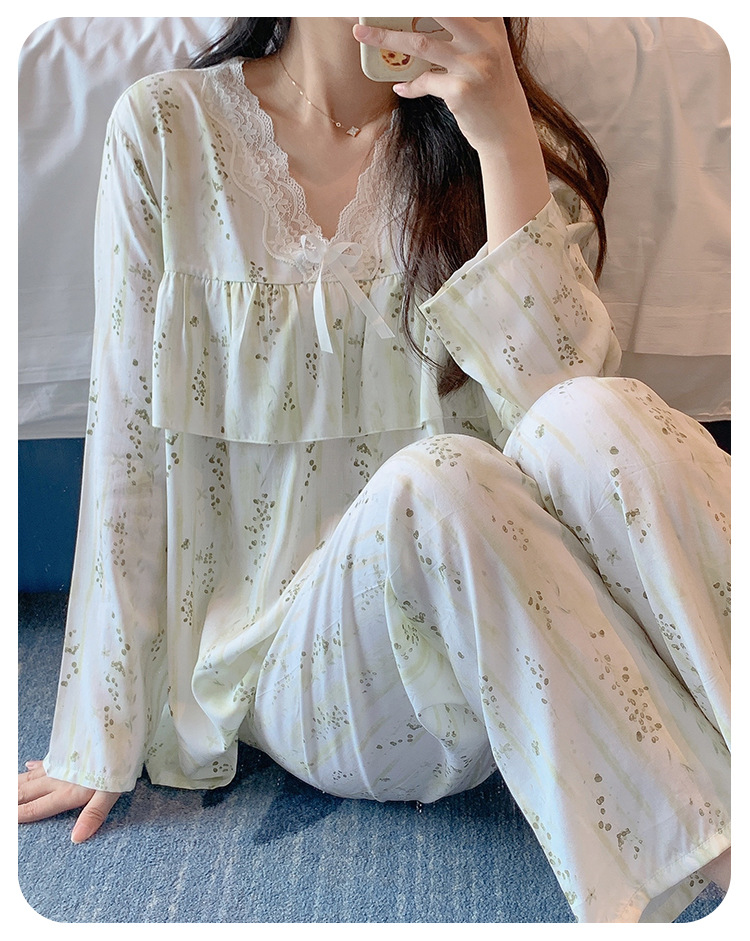 새로운 소녀의 안티 범프 풀오버 긴팔 얇은 라운드 넥 잠옷 세트 달콤한 인쇄 면 실크 가정 옷 잠옷