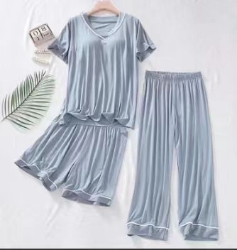 잠옷 여성 여름 2023 가슴 패드가있는 새로운 쓰리피스 세트 한국식 여성용 V넥 얇은 가정복