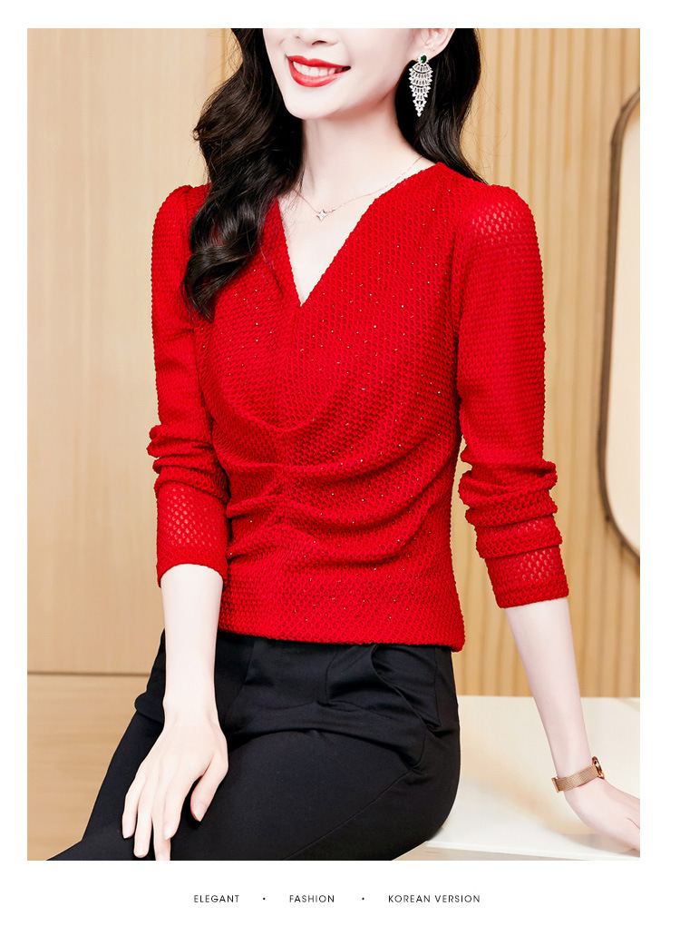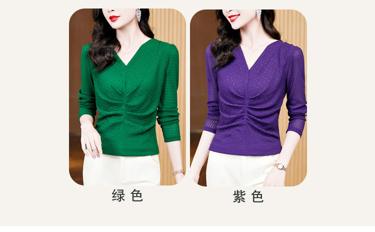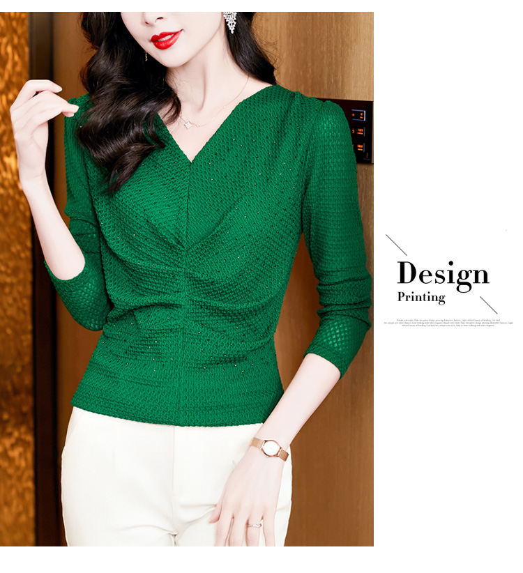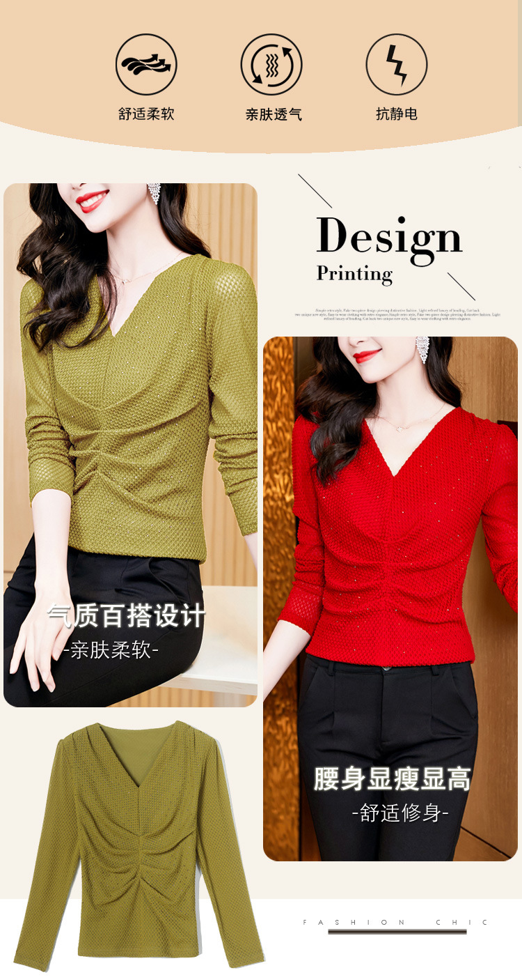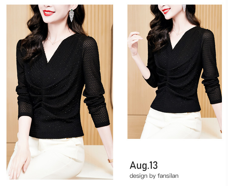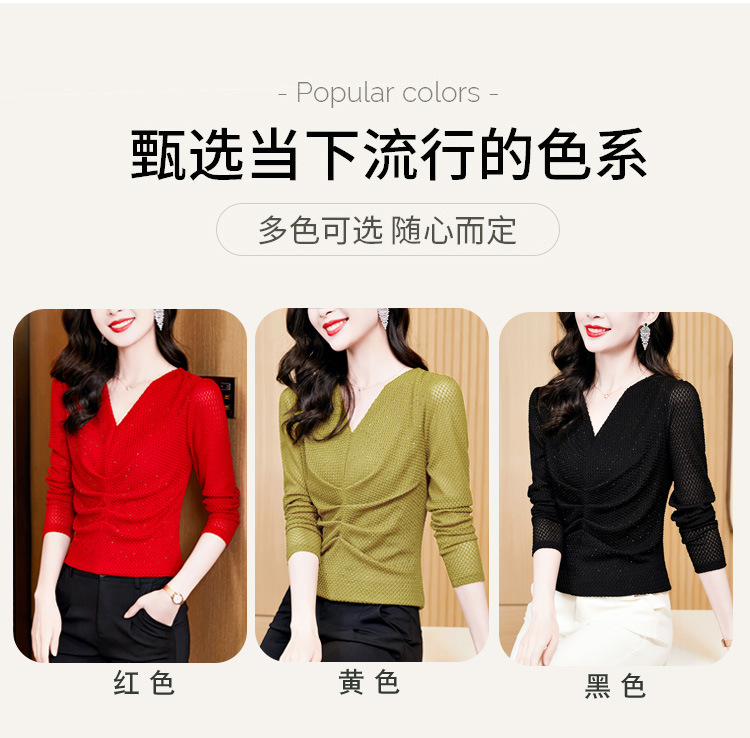 V-넥 슬림핏 주름 모조 다이아몬드 긴팔 티셔츠 보텀 셔츠 2023 여름 새로운 중간 소매 조커 티셔츠 여성 최고 도매스토어 가기