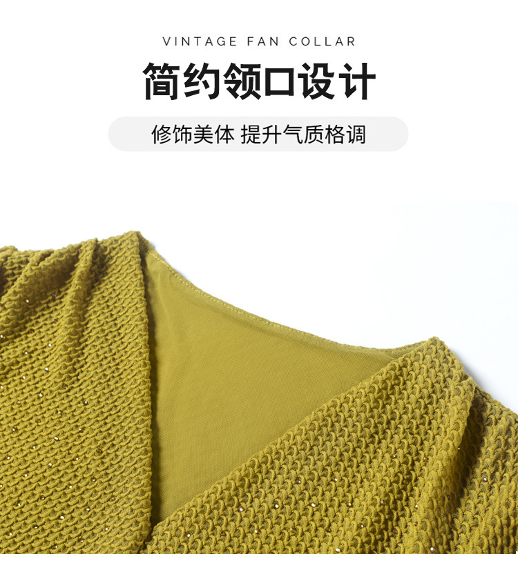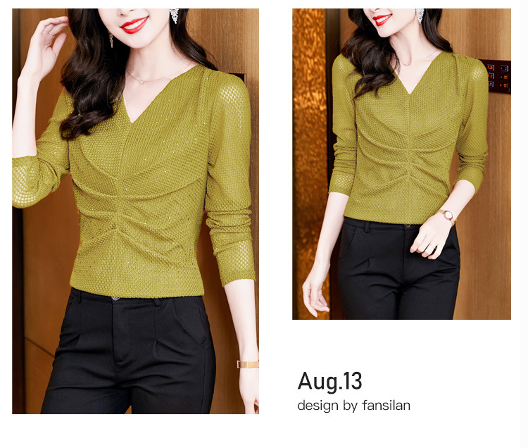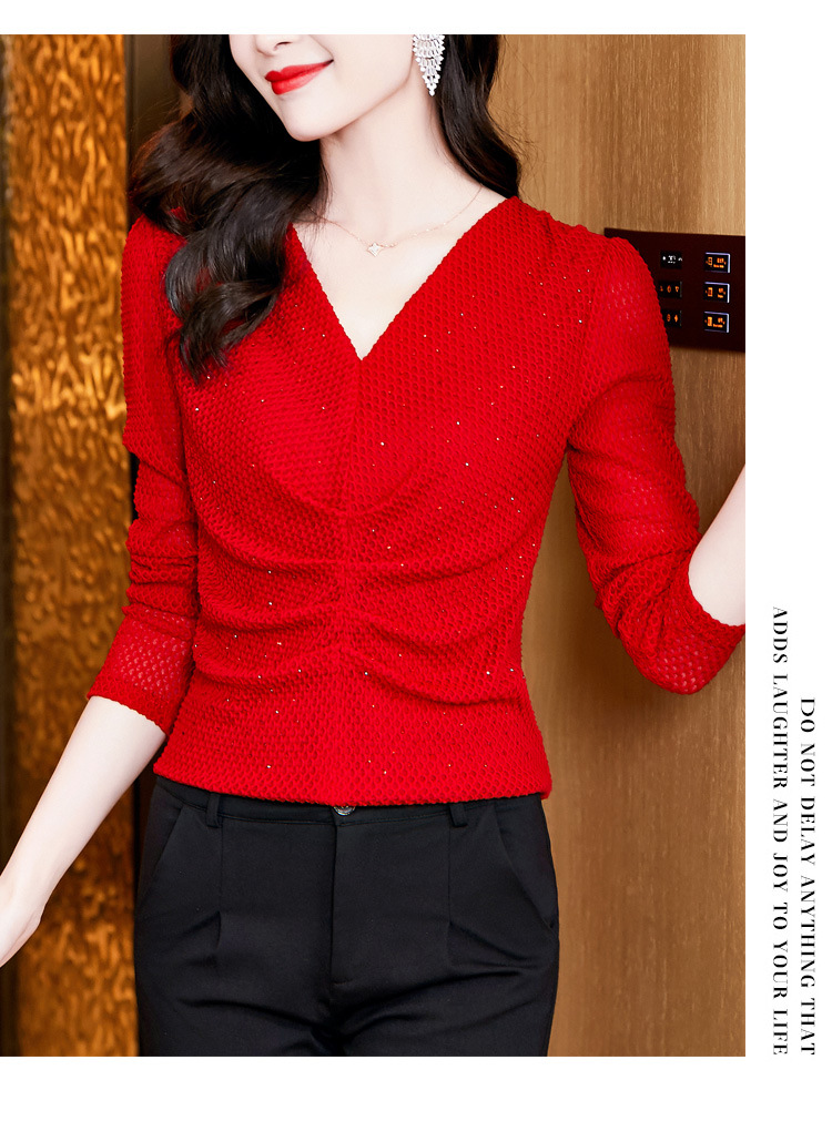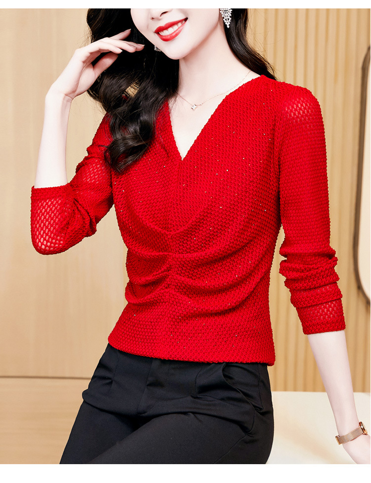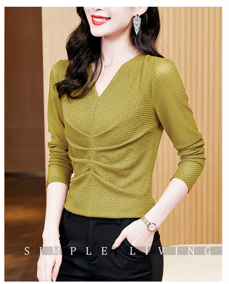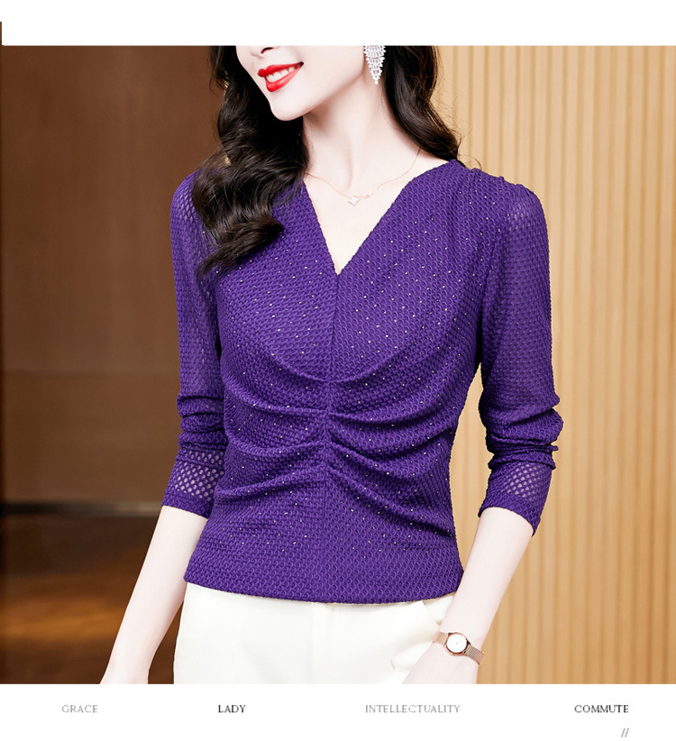 V-넥 슬림핏 주름 모조 다이아몬드 긴팔 티셔츠 보텀 셔츠 2023 여름 새로운 중간 소매 조커 티셔츠 여성 최고 도매스토어 가기