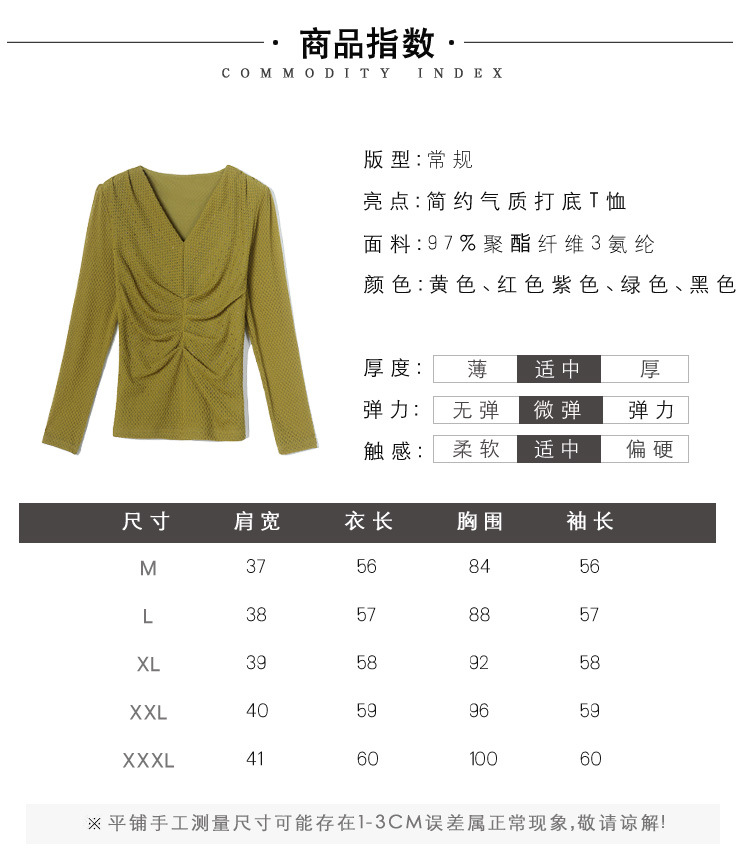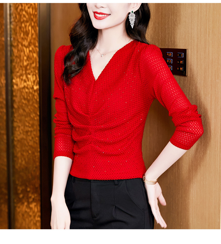 V-넥 슬림핏 주름 모조 다이아몬드 긴팔 티셔츠 보텀 셔츠 2023 여름 새로운 중간 소매 조커 티셔츠 여성 최고 도매