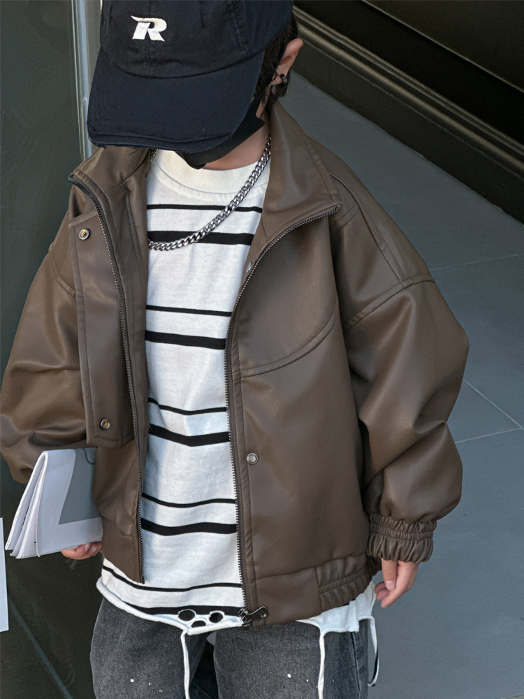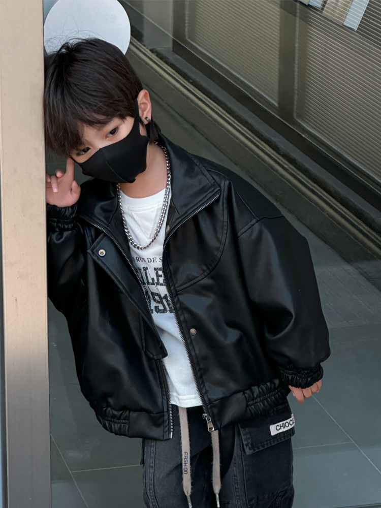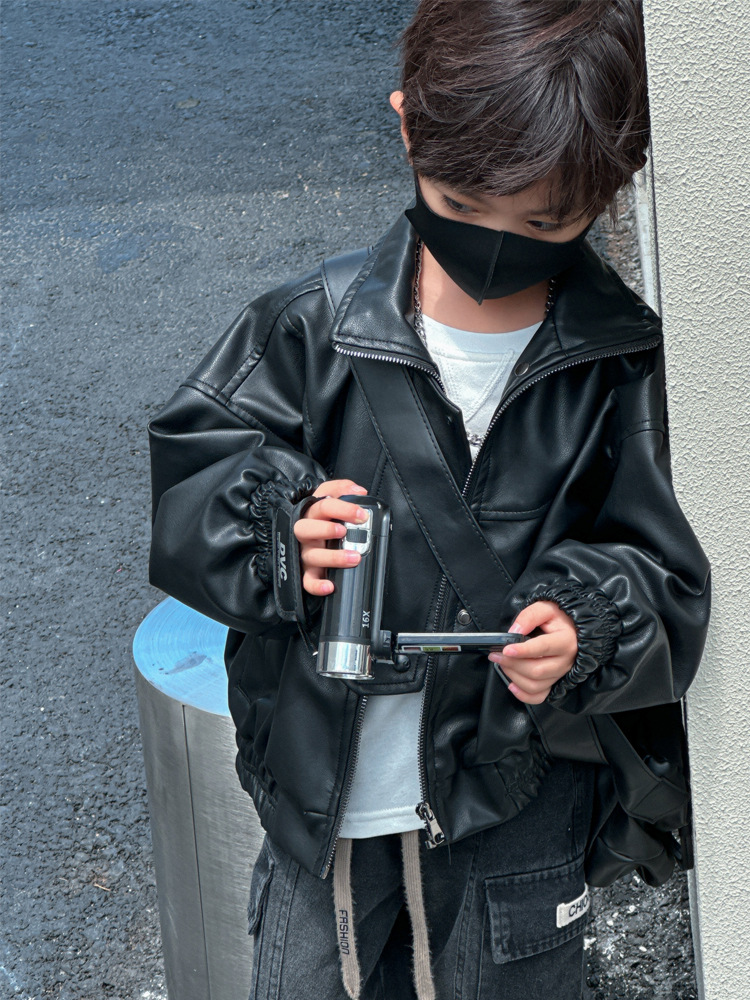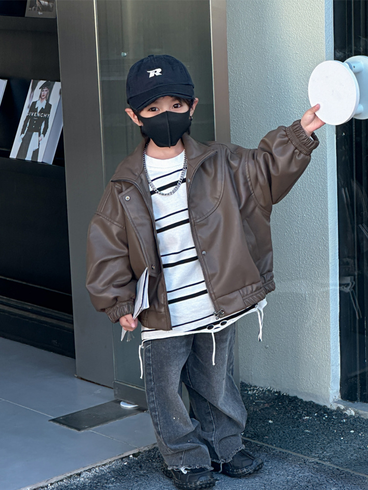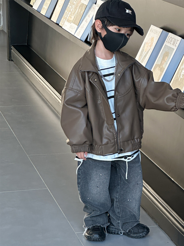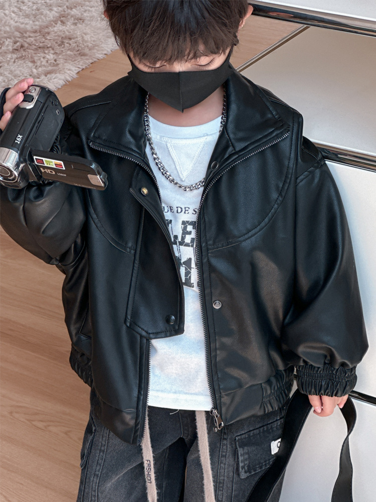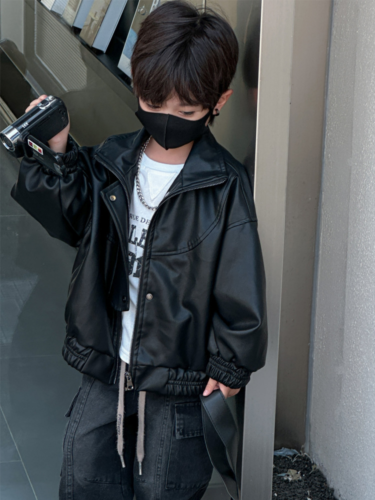 면 소재 가죽 자켓 가을옷 한국 스타일 아동복 2025 가을 신상품 남아용 짧은 앞면 여밈 가죽 자켓스토어 가기