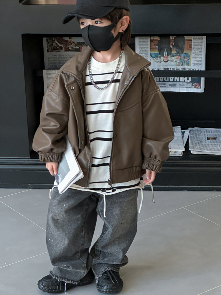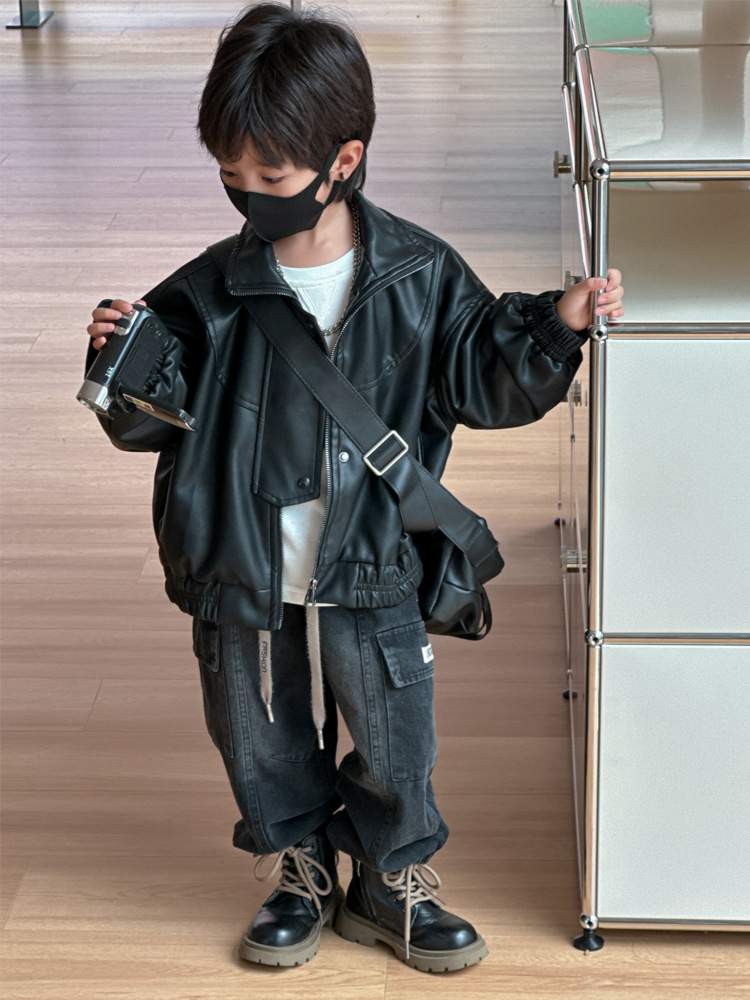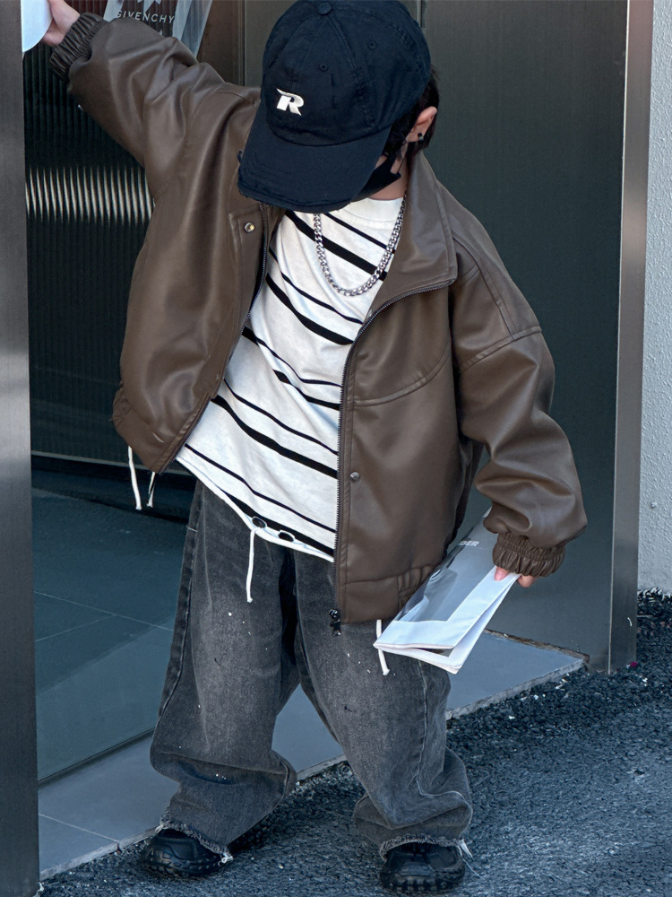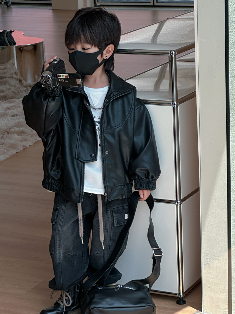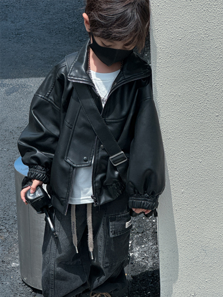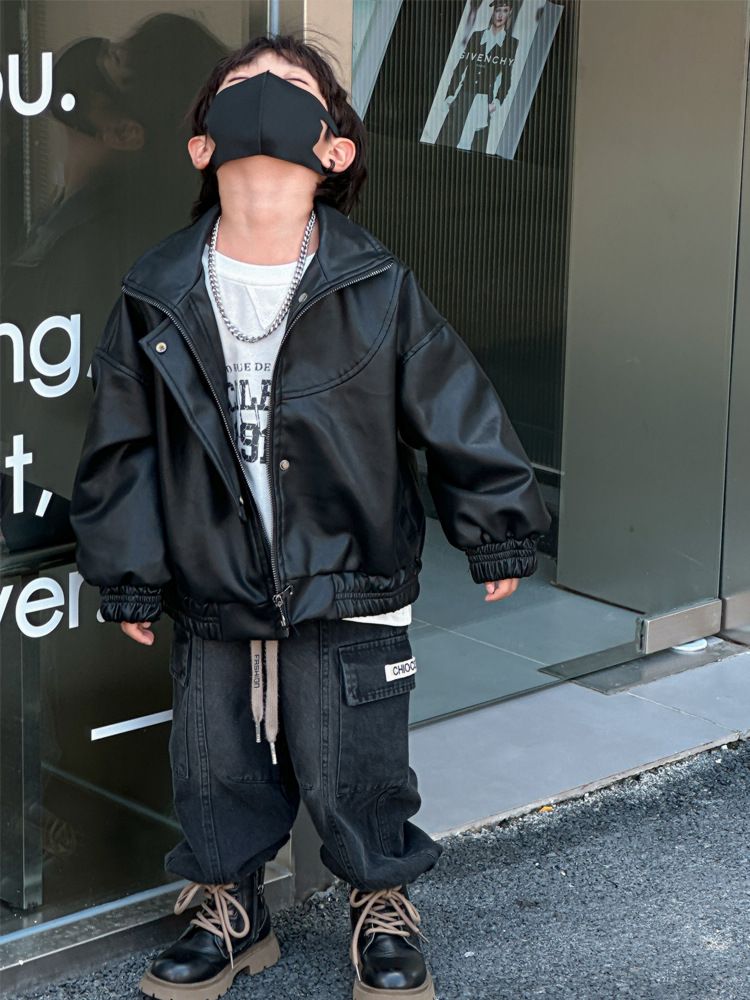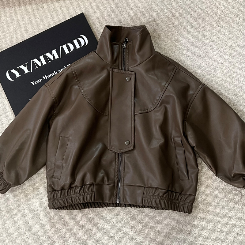 면 소재 가죽 자켓 가을옷 한국 스타일 아동복 2025 가을 신상품 남아용 짧은 앞면 여밈 가죽 자켓스토어 가기