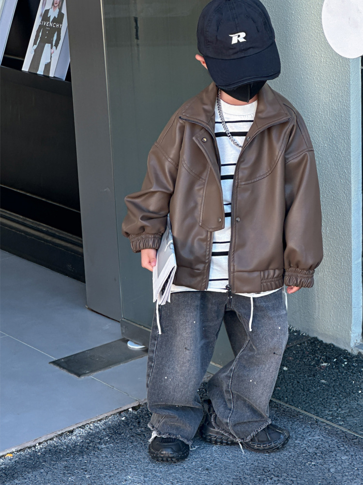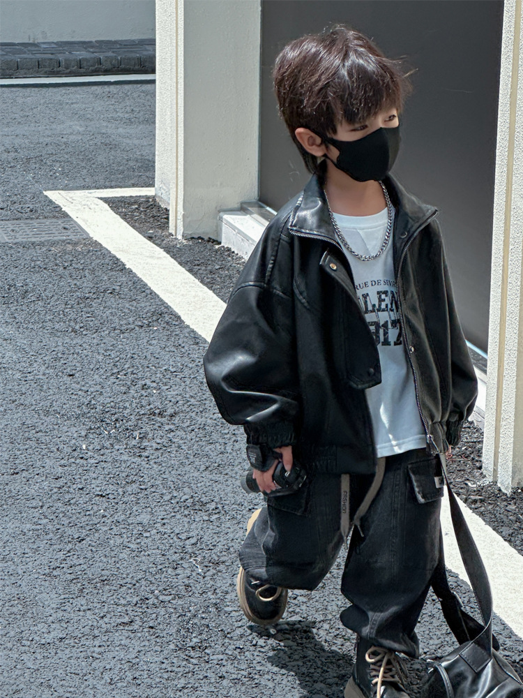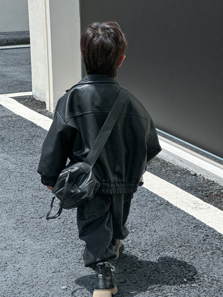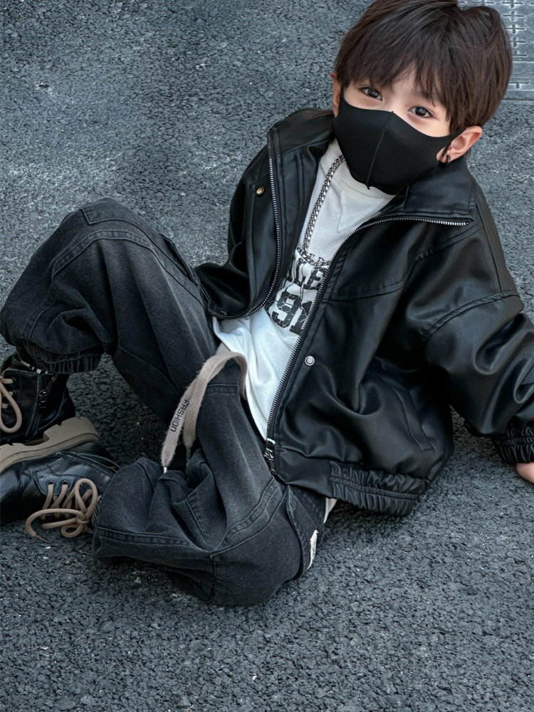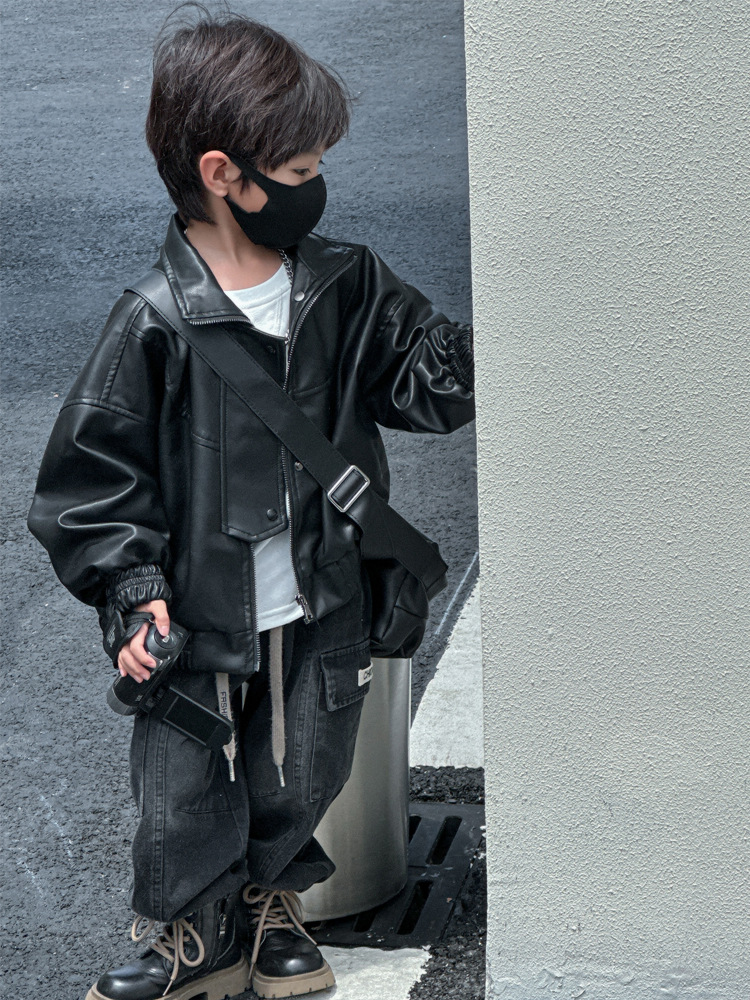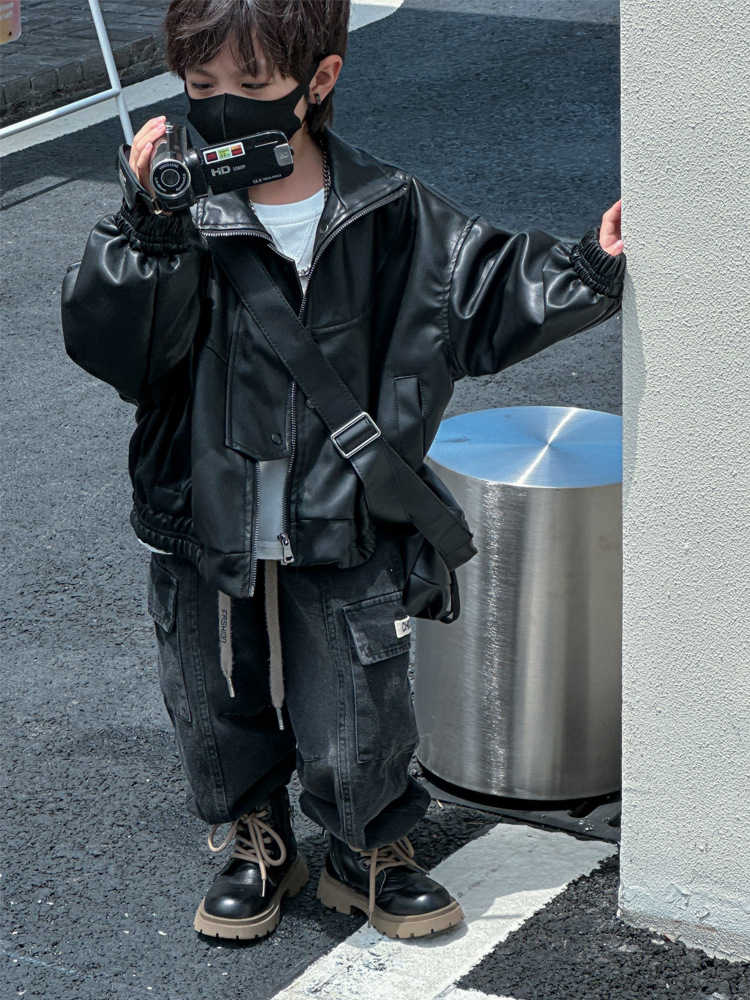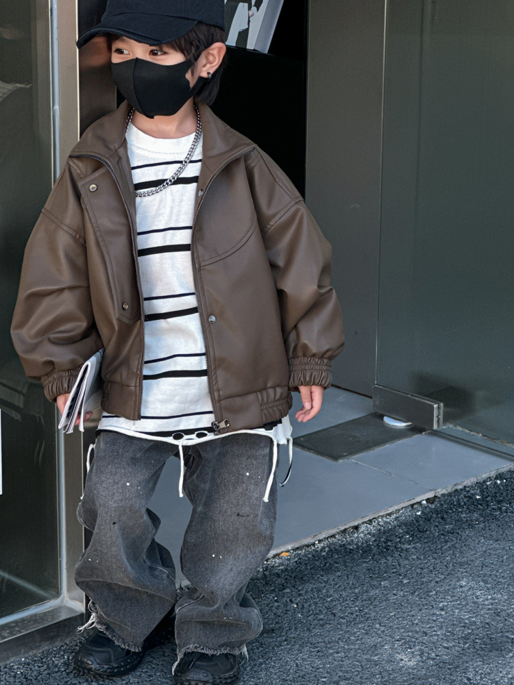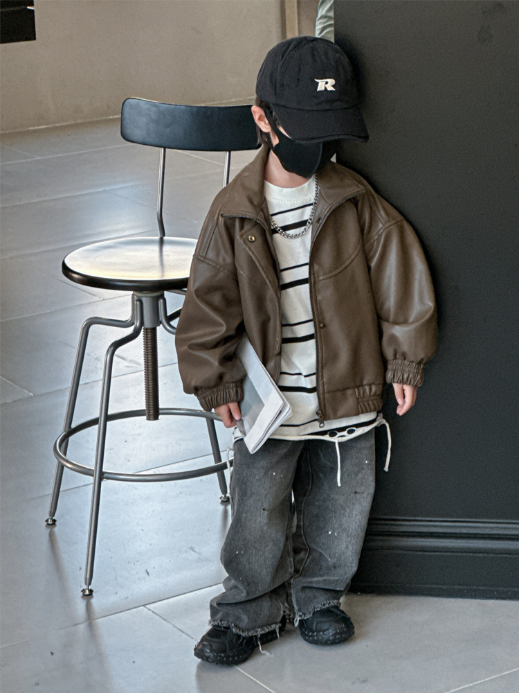 면 소재 가죽 자켓 가을옷 한국 스타일 아동복 2025 가을 신상품 남아용 짧은 앞면 여밈 가죽 자켓스토어 가기