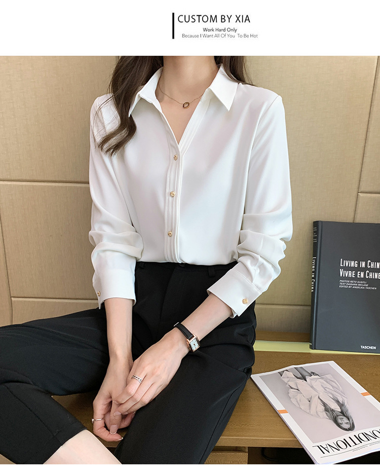 리얼 샷 재고 새틴 셔츠 여자의 느슨한 긴 소매 우아한 세로 셔츠 금속 버클 유행 슬림 쉬폰 셔츠