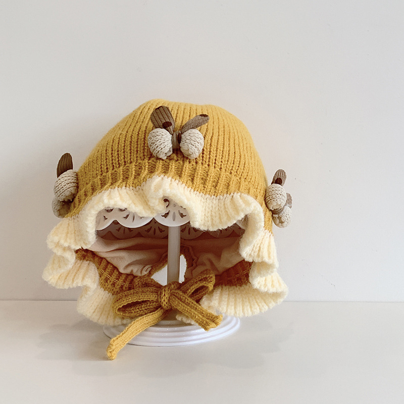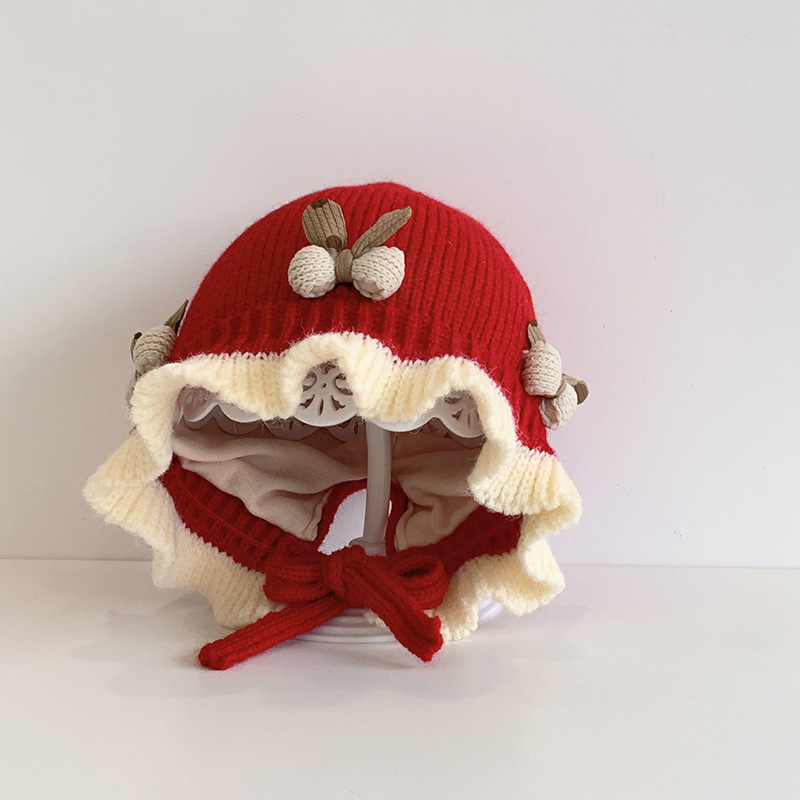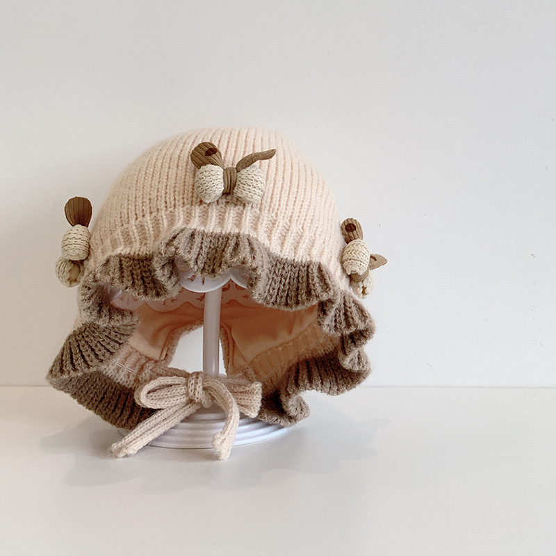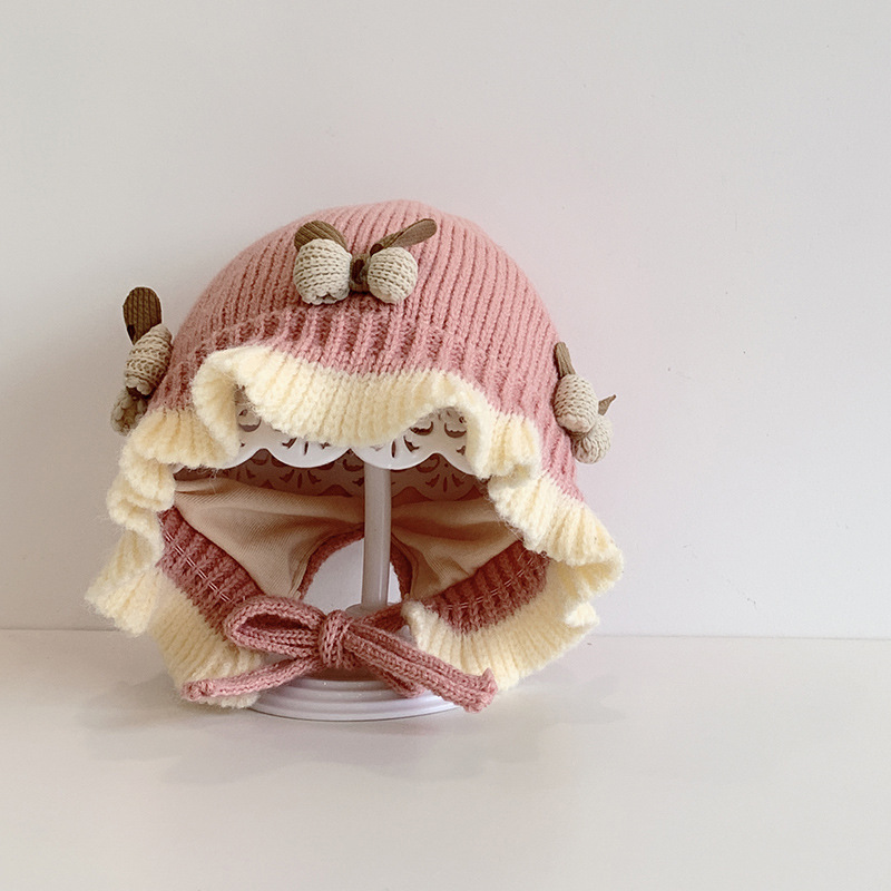 한국식 아기 모자 겨울 더블 레이어 두꺼운 따뜻한 여아 공주 귀 보호 모자 귀여운 활 레이스 울 모자