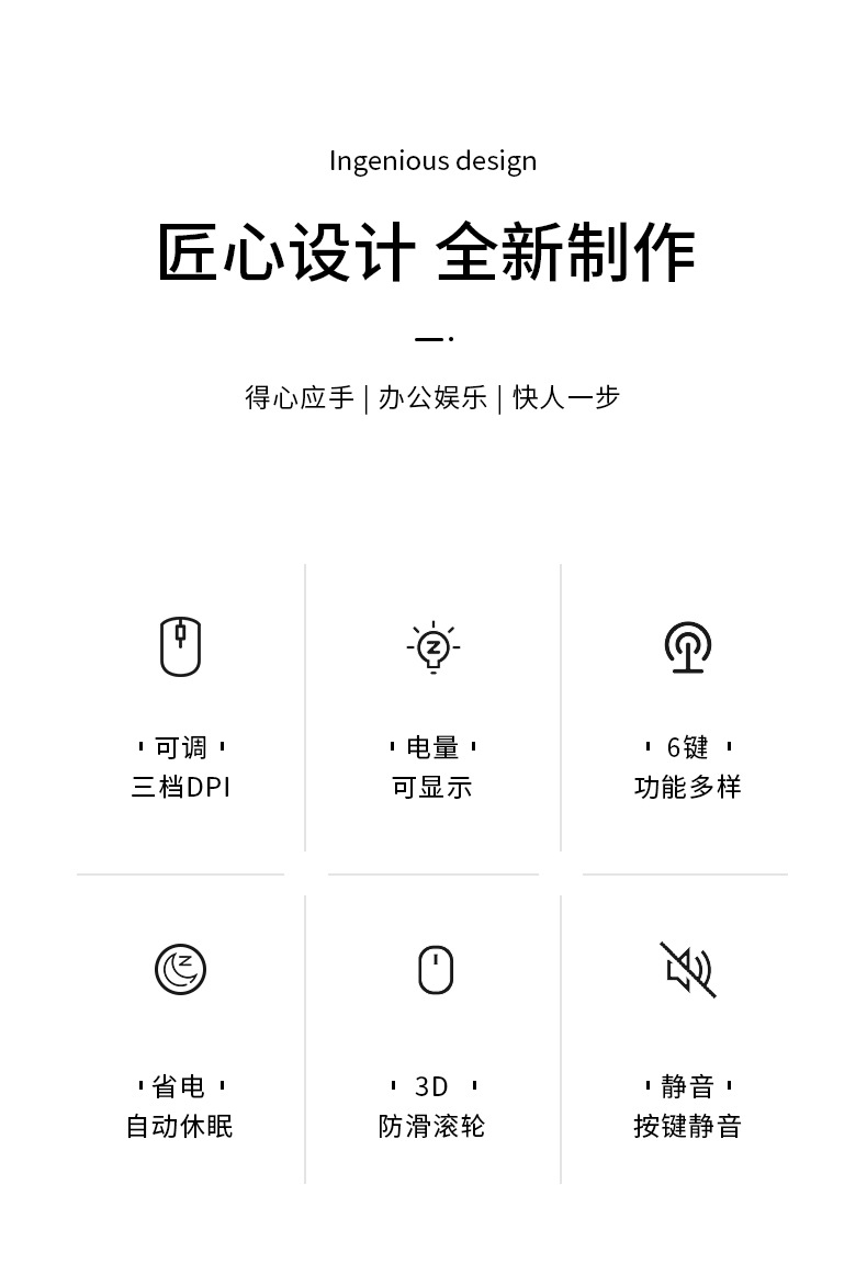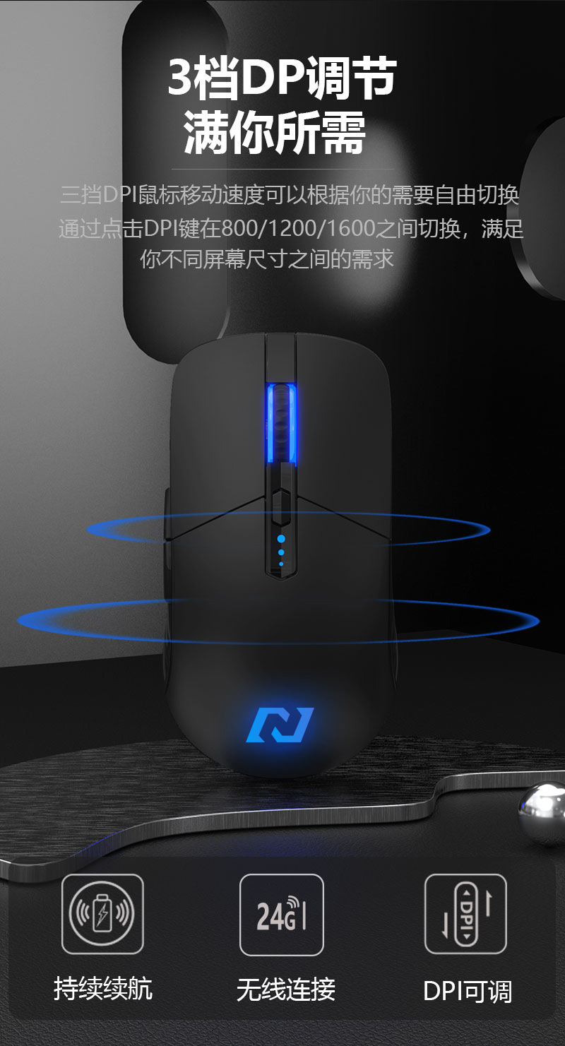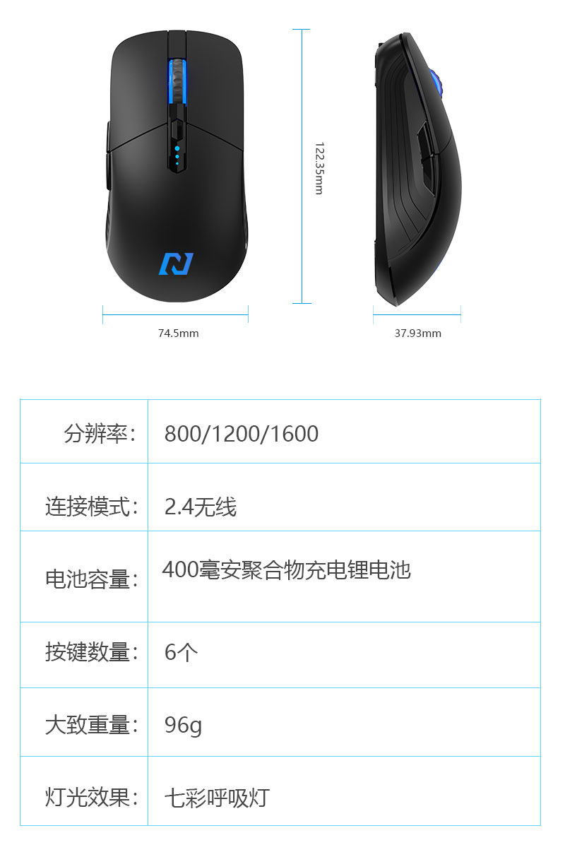 型号G12连接方式USB无线按键数量6D类型2.4g无线鼠标(充电)裸机尺寸123*75*38mm裸机重量96g材质ABS包装尺寸150*95*50mm电池内置500毫安锂电池带包重量140gDPI800/1200/1600装箱数量100pcs灯效7色呼吸灯装箱尺寸530*510*330mm颜色黑,灰,粉色、蓝色装箱重量15kg