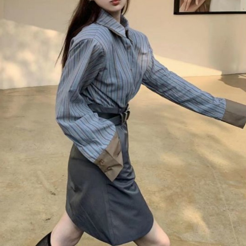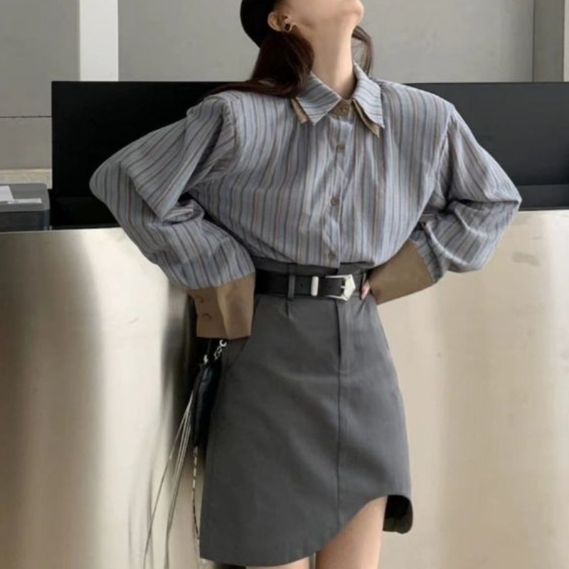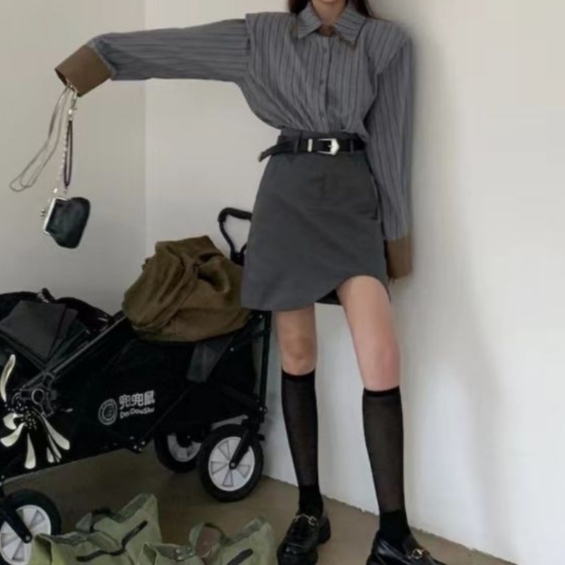 고급 감각 느슨한 세로 스트라이프 셔츠 + 회색 반 길이 스커트 여성 2023 봄과 가을 새로운 한국 패션 세트스토어 가기