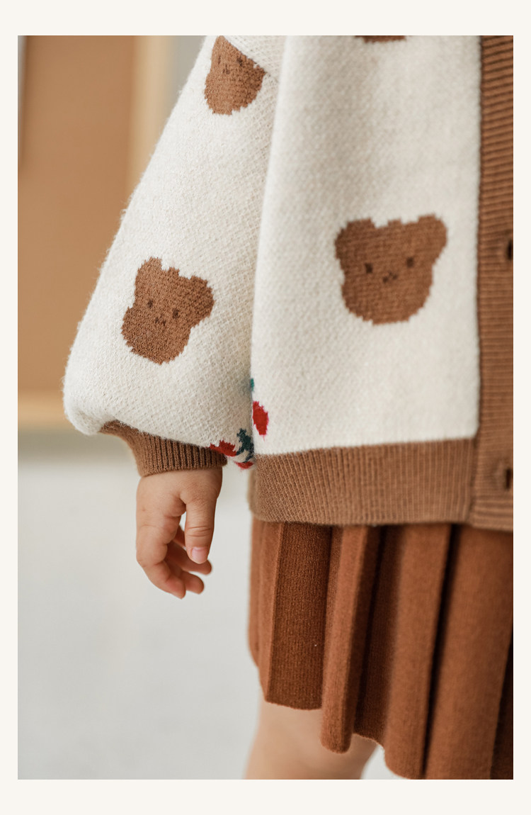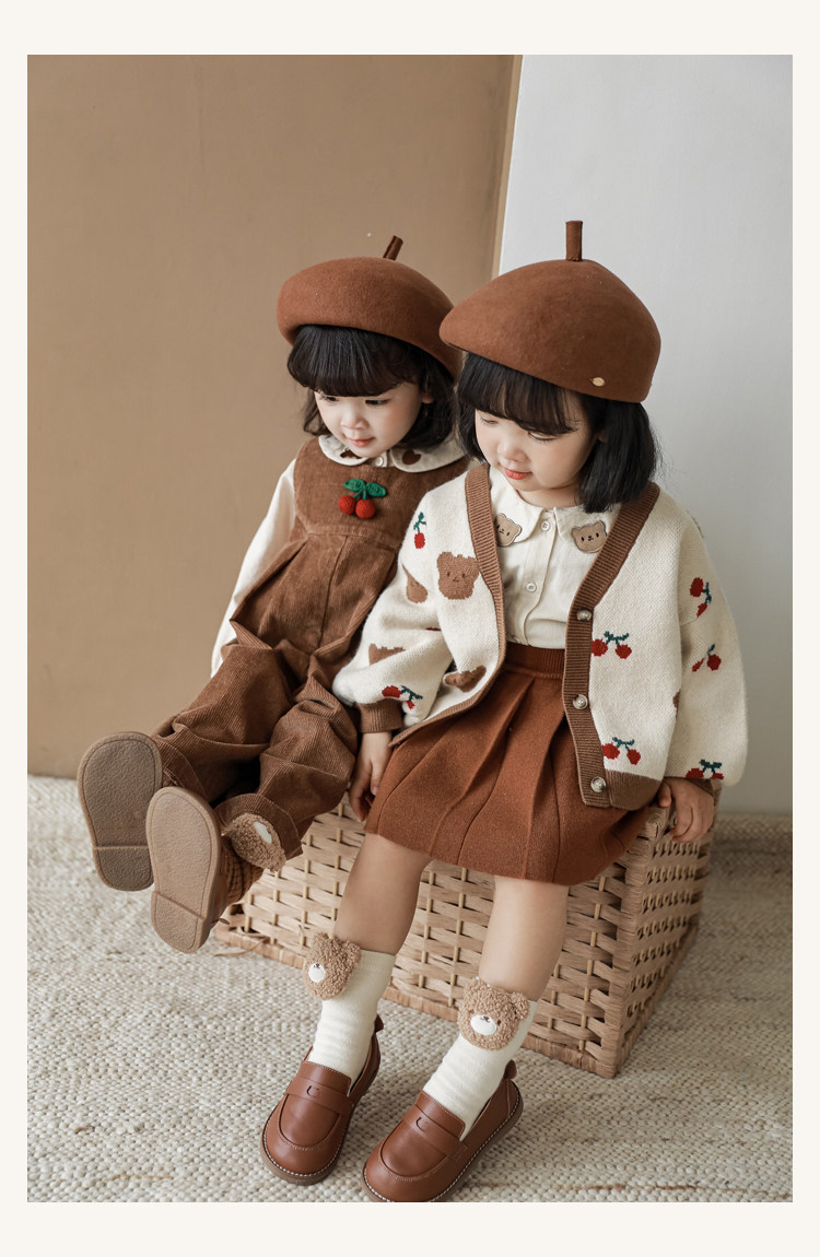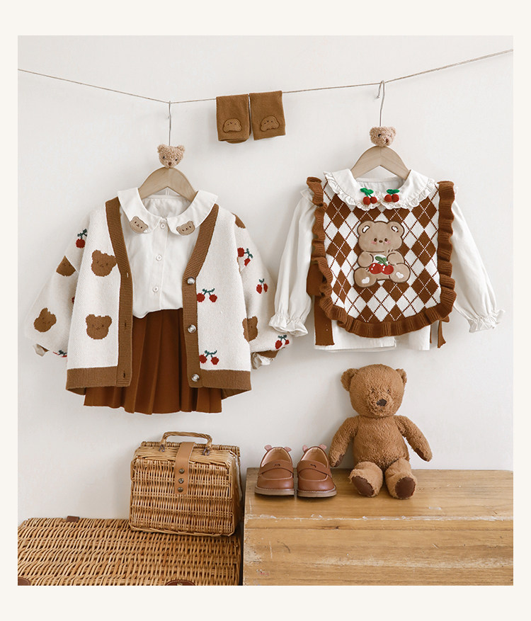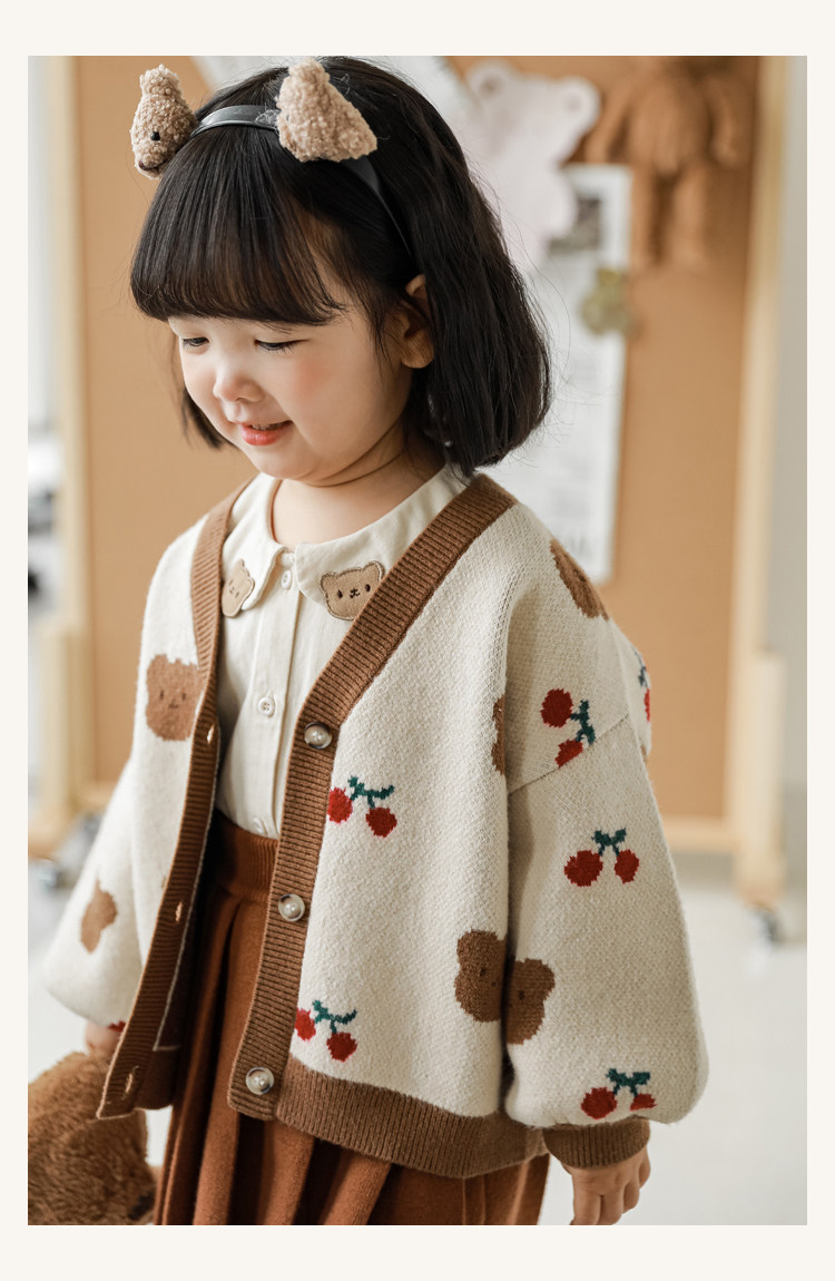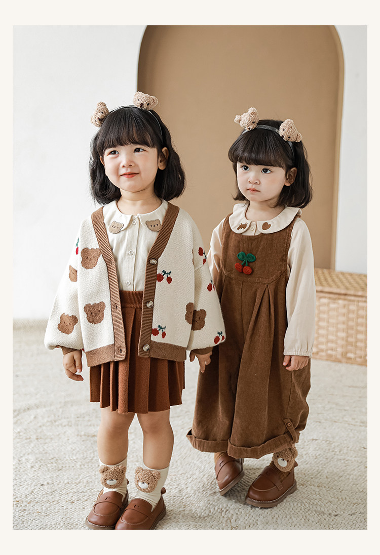 Wurib 소녀의 복고풍 니트 카디건 세트 귀여운 체리 곰 재킷 어린이 가을 바지스토어 가기