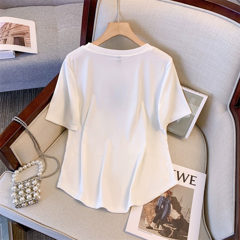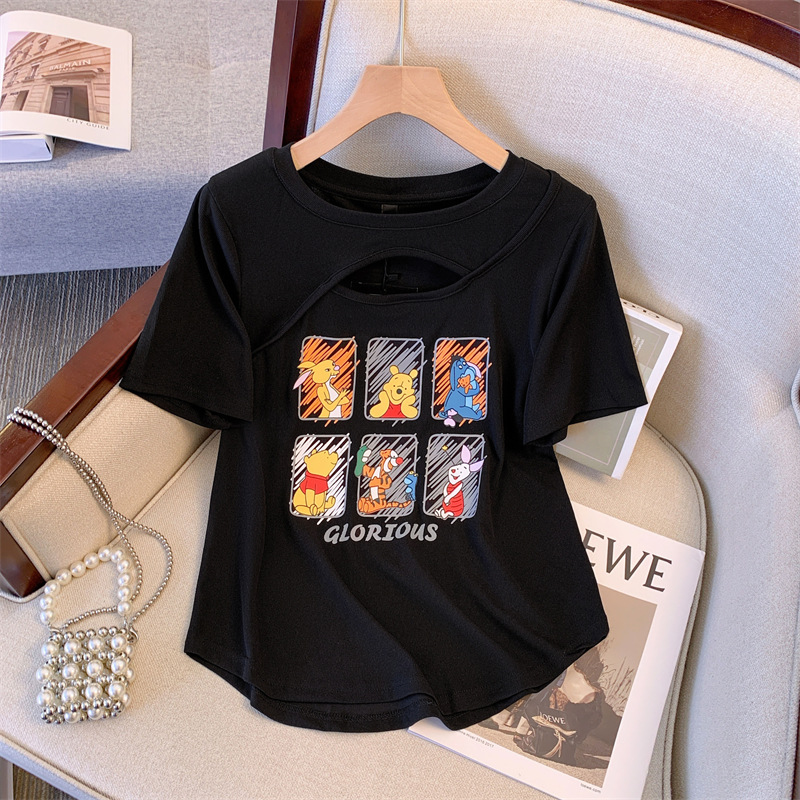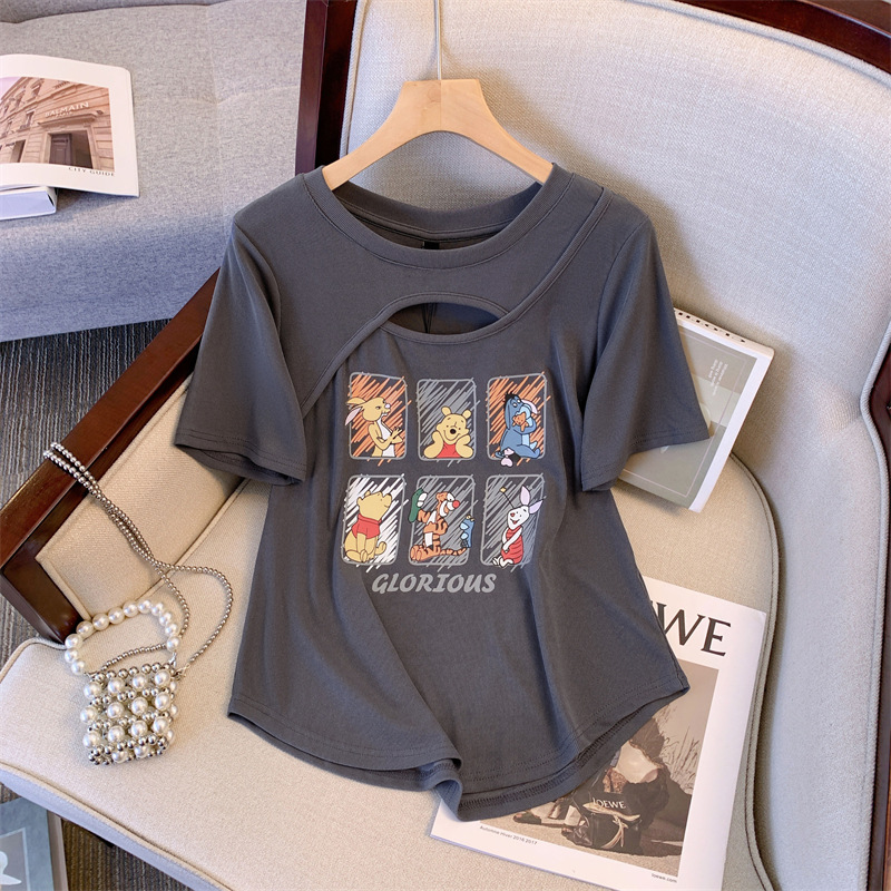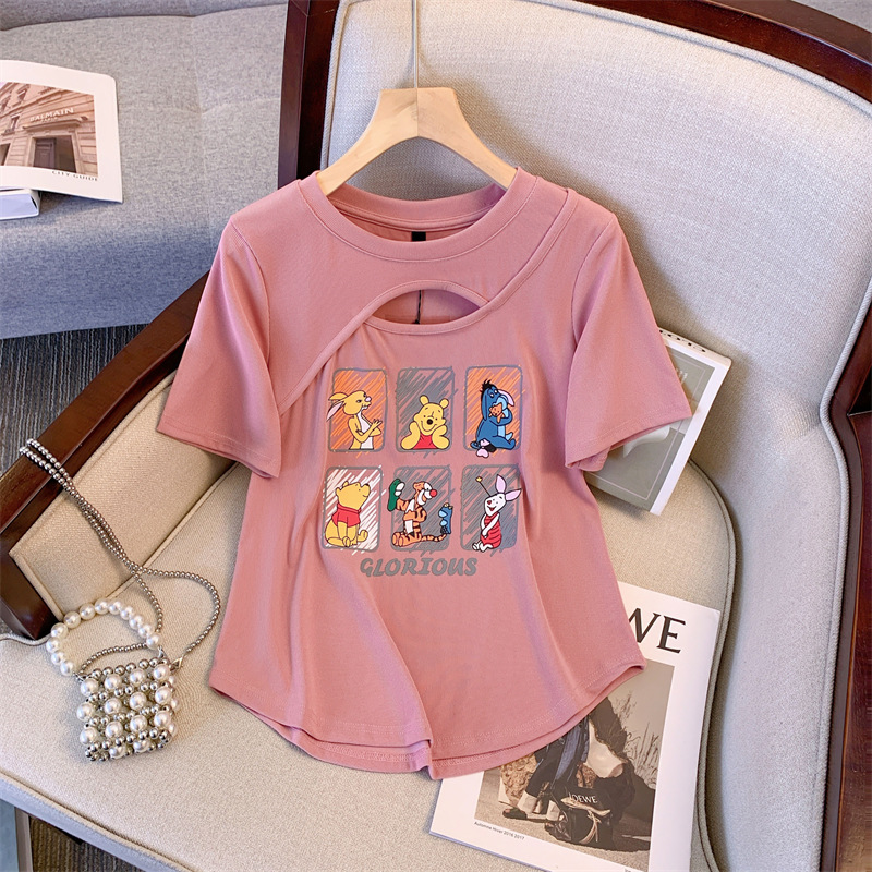 플러스 사이즈 여자의 여름 새로운 어깨 반팔 티셔츠 여자의 통통녀 살 커버 슬리밍 중공 디자인 틈새 탑