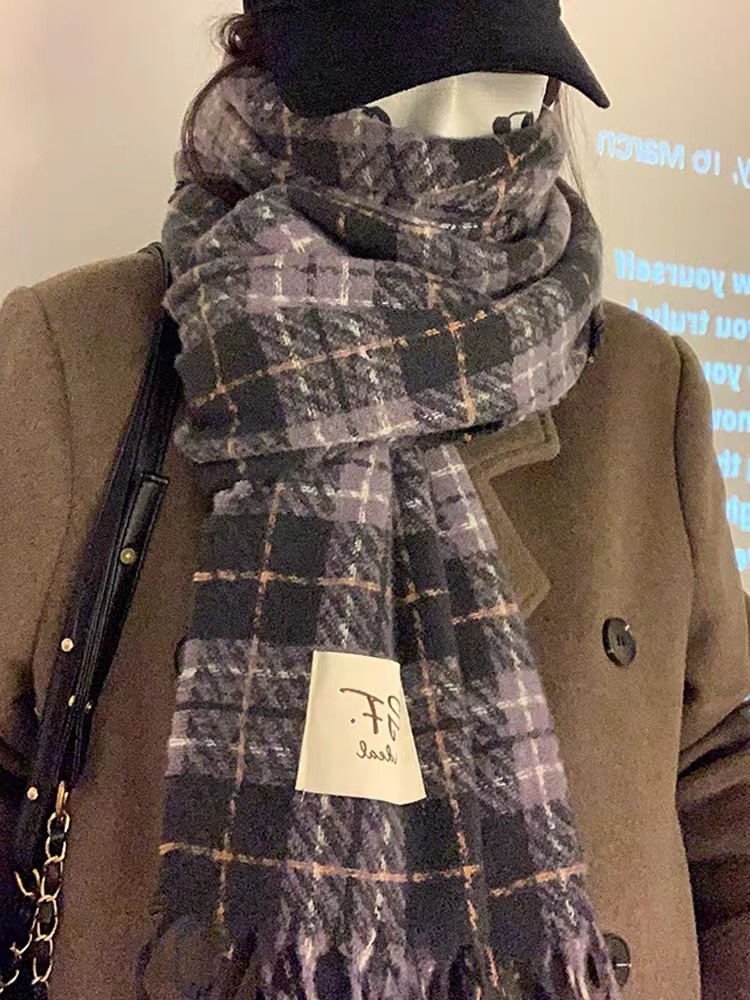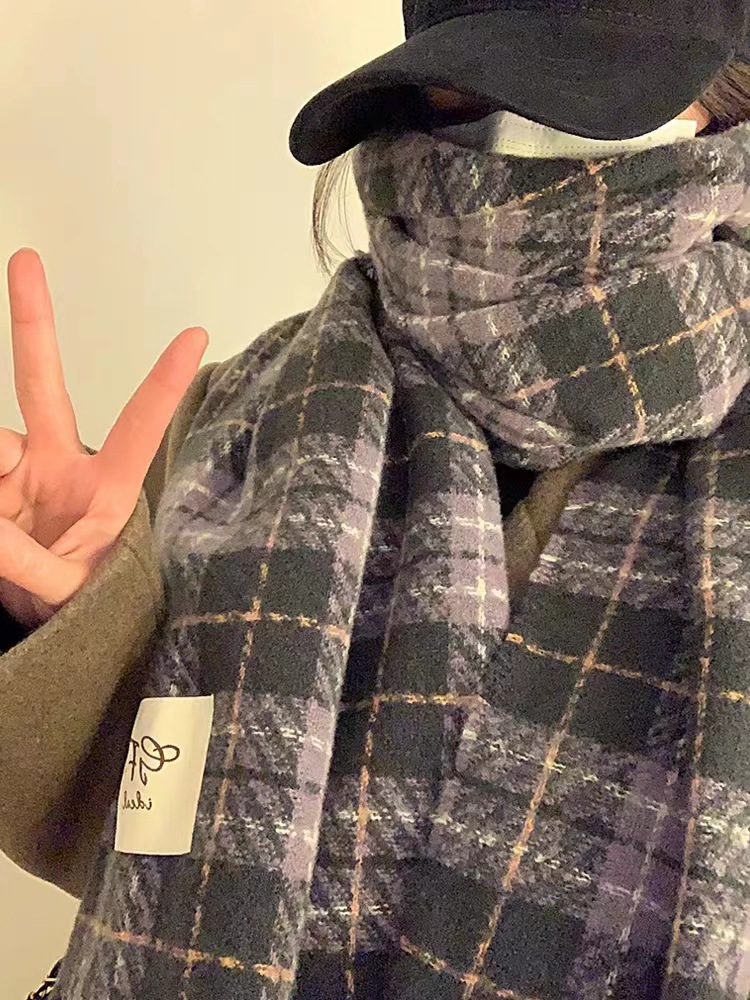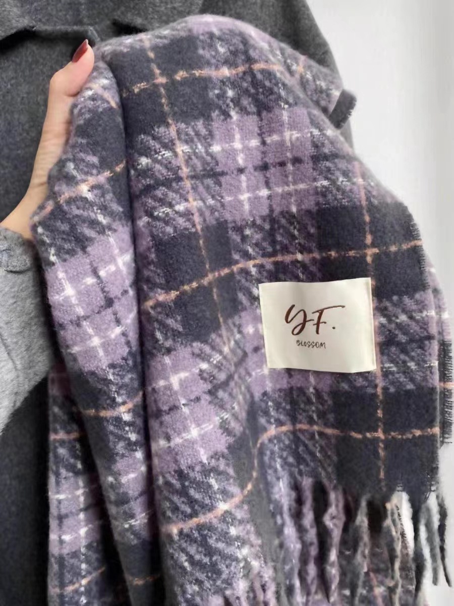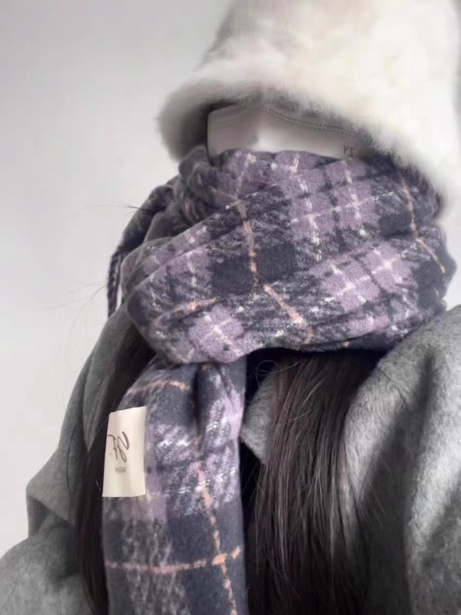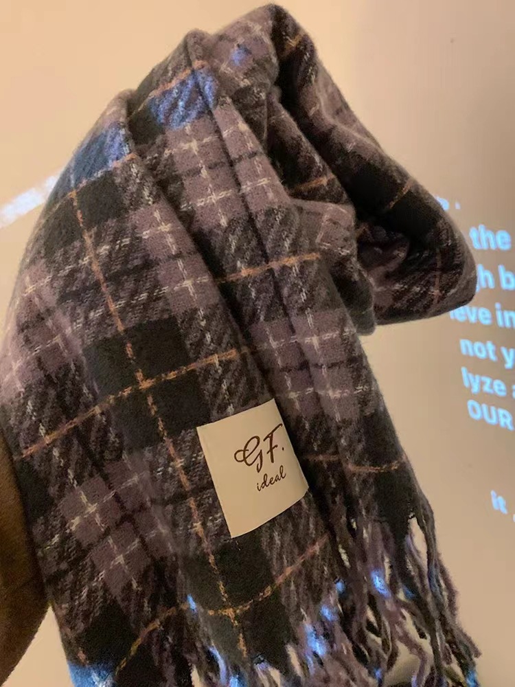 한국 스타일 신상품 타로 퍼플 고급 스카프 여성용 가을과 겨울 모든 매치 숄 소프트 왁스 레트로 따뜻한 격자 무늬 스카프스토어 가기