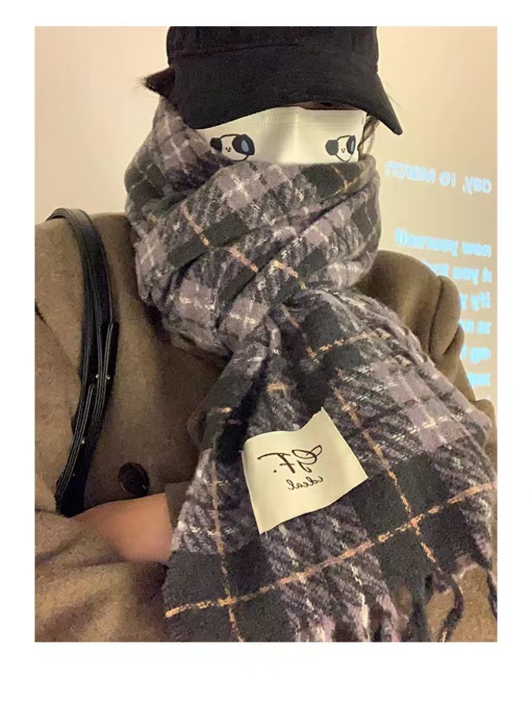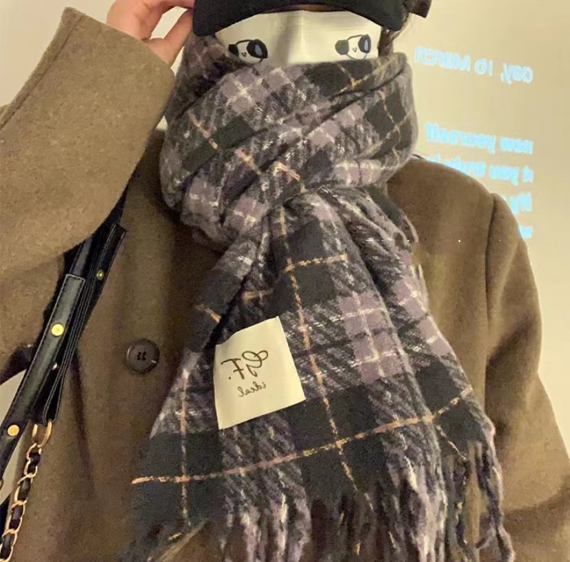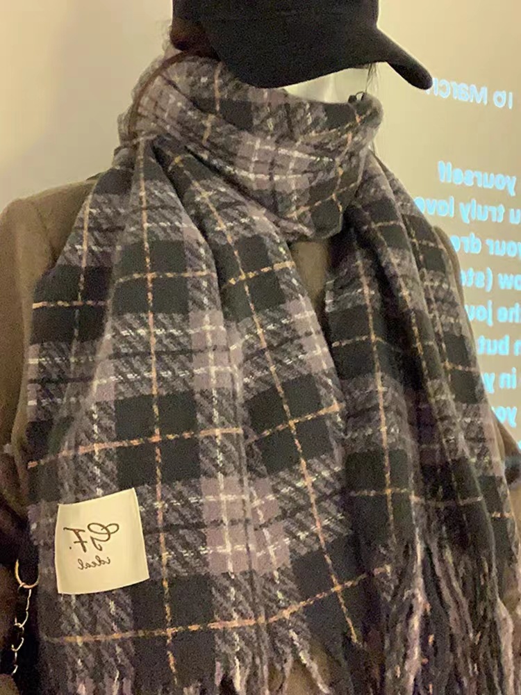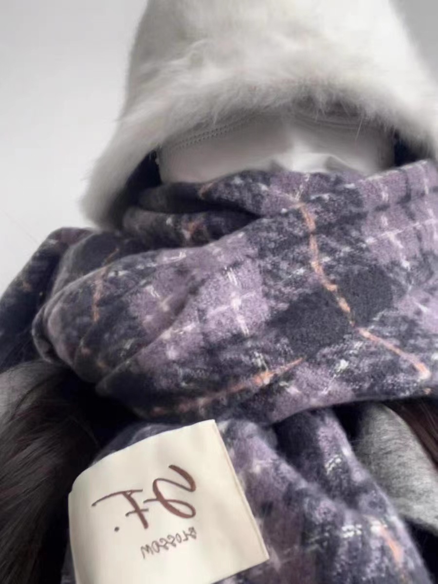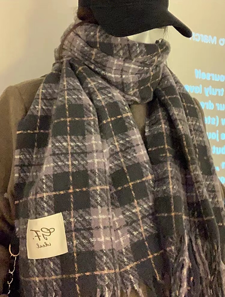 한국 스타일 신상품 타로 퍼플 고급 스카프 여성용 가을과 겨울 모든 매치 숄 소프트 왁스 레트로 따뜻한 격자 무늬 스카프스토어 가기
