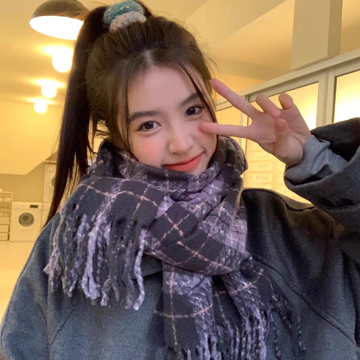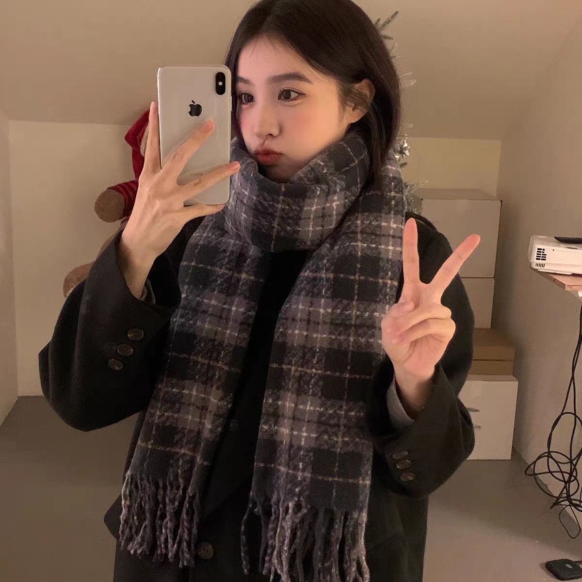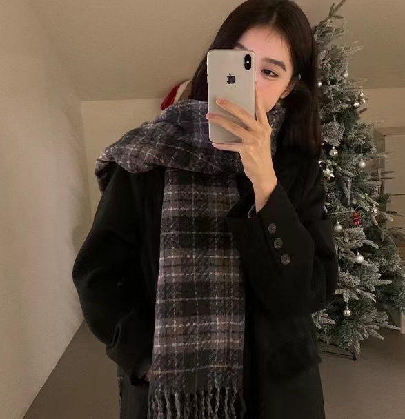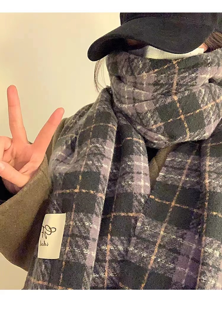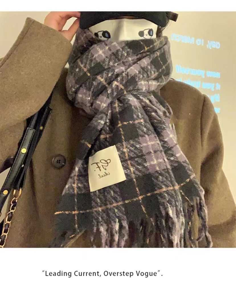 한국 스타일 신상품 타로 퍼플 고급 스카프 여성용 가을과 겨울 모든 매치 숄 소프트 왁스 레트로 따뜻한 격자 무늬 스카프스토어 가기
