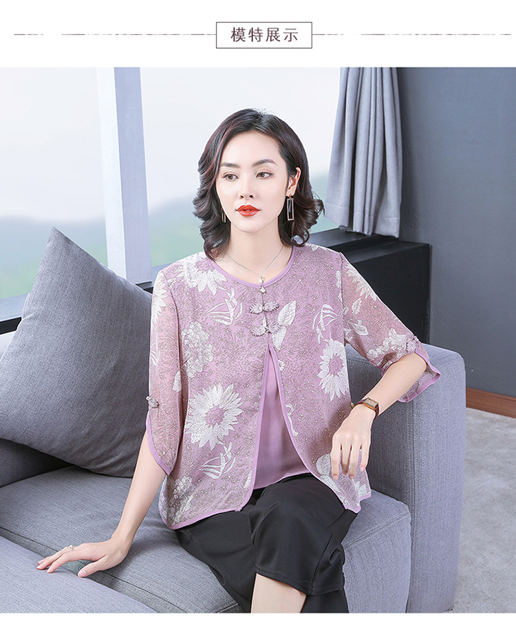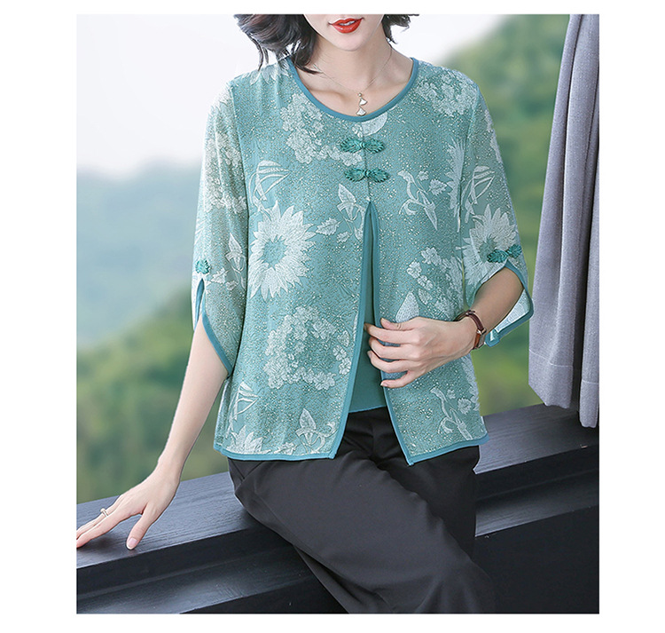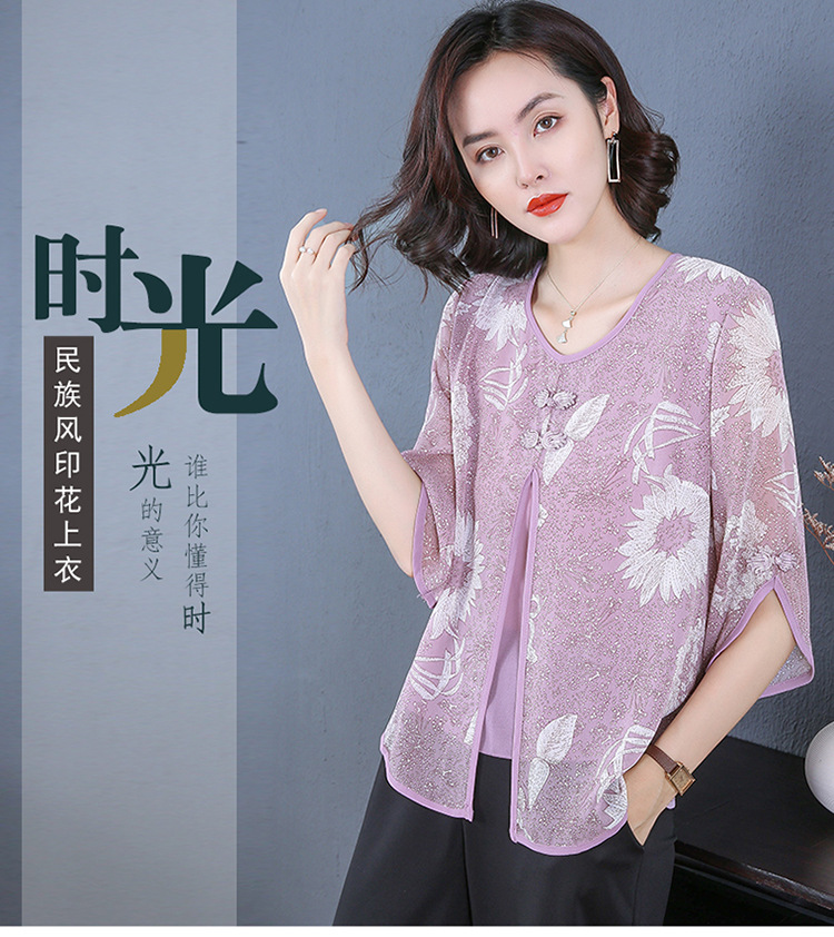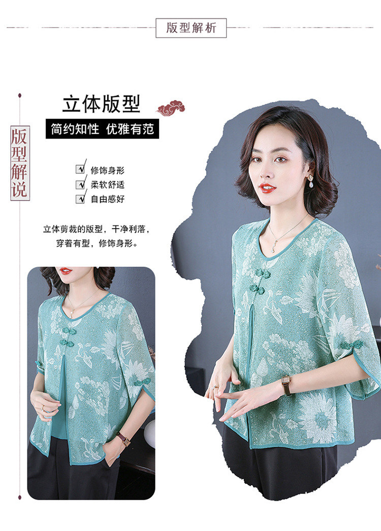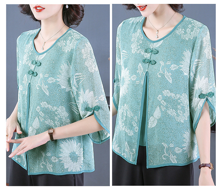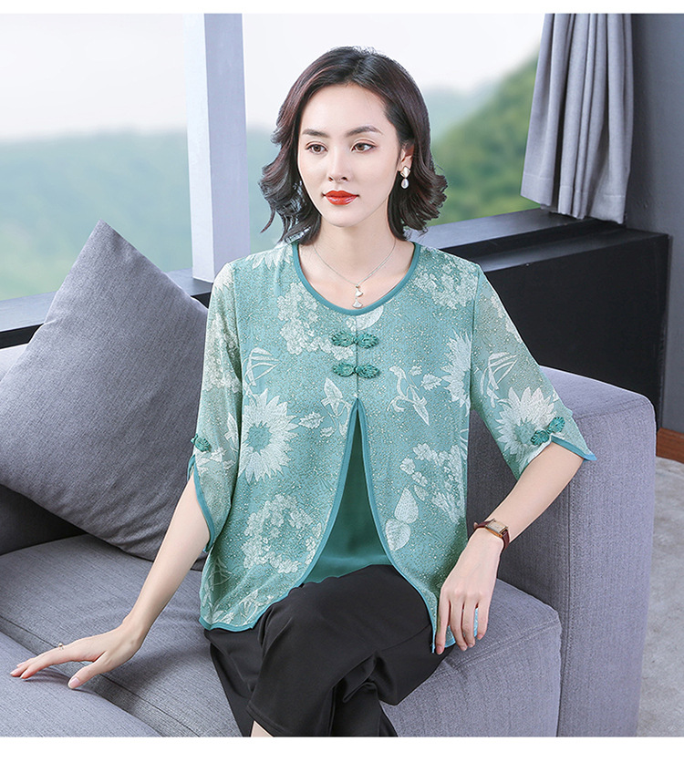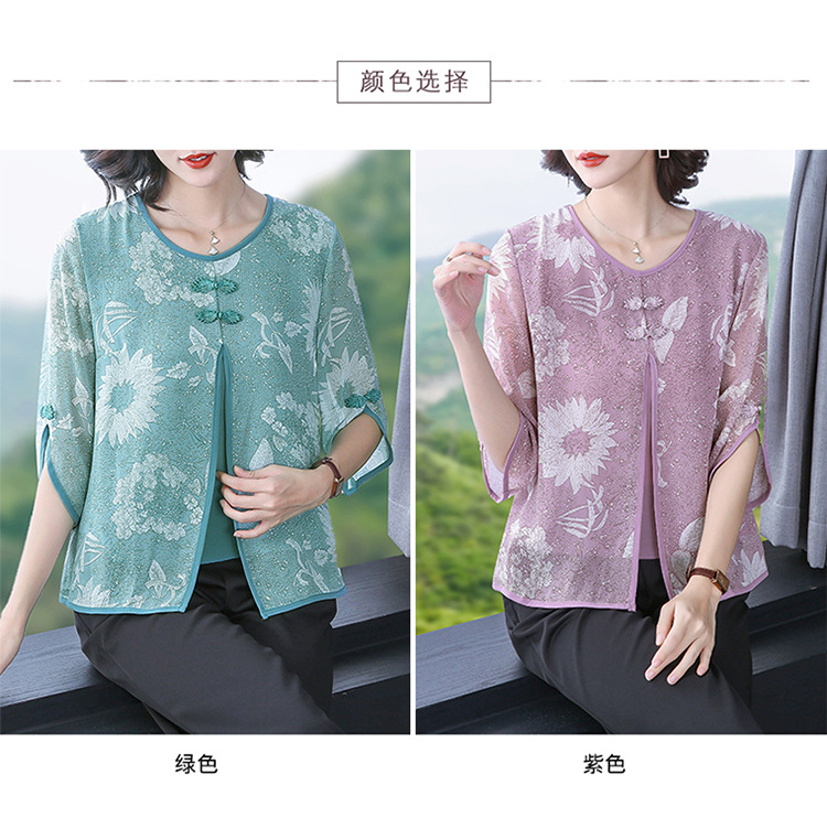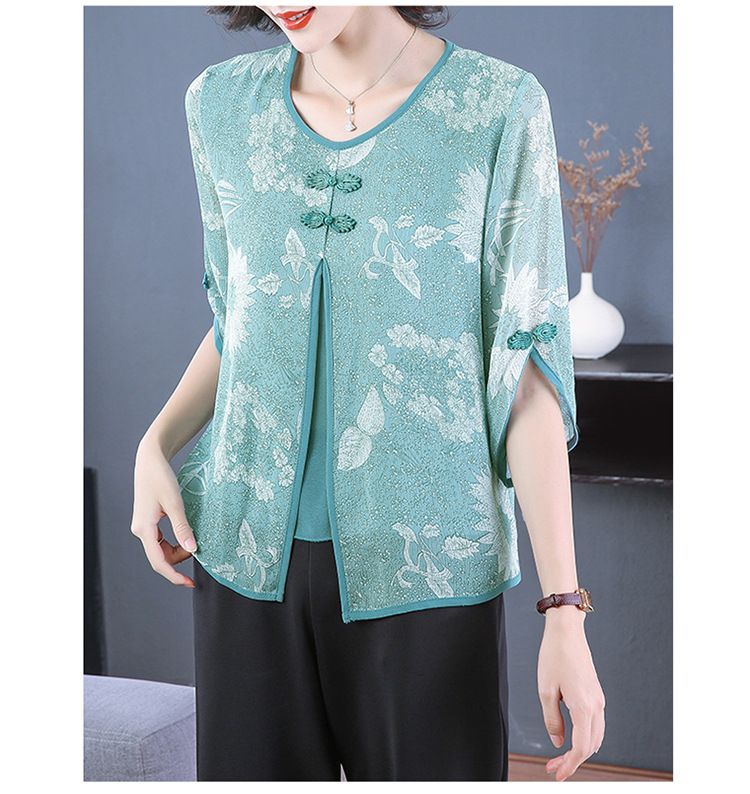 2023 여름 새로운 스타일 쉬폰 셔츠 우아한 인쇄 느슨한 새로운 중국 스타일 우아한 라운드 넥 반 소매 가짜 투피스 탑