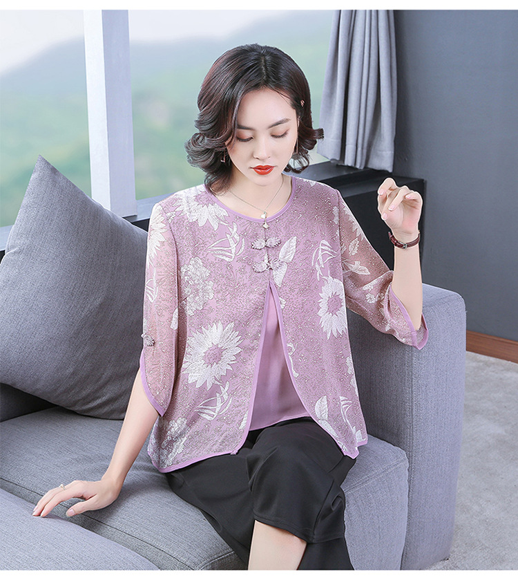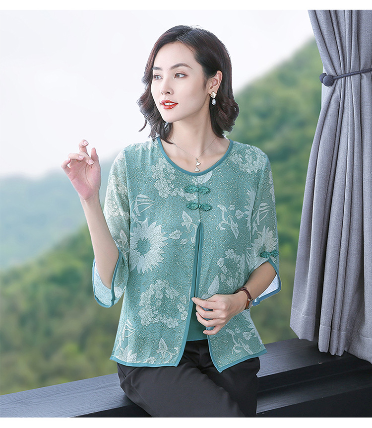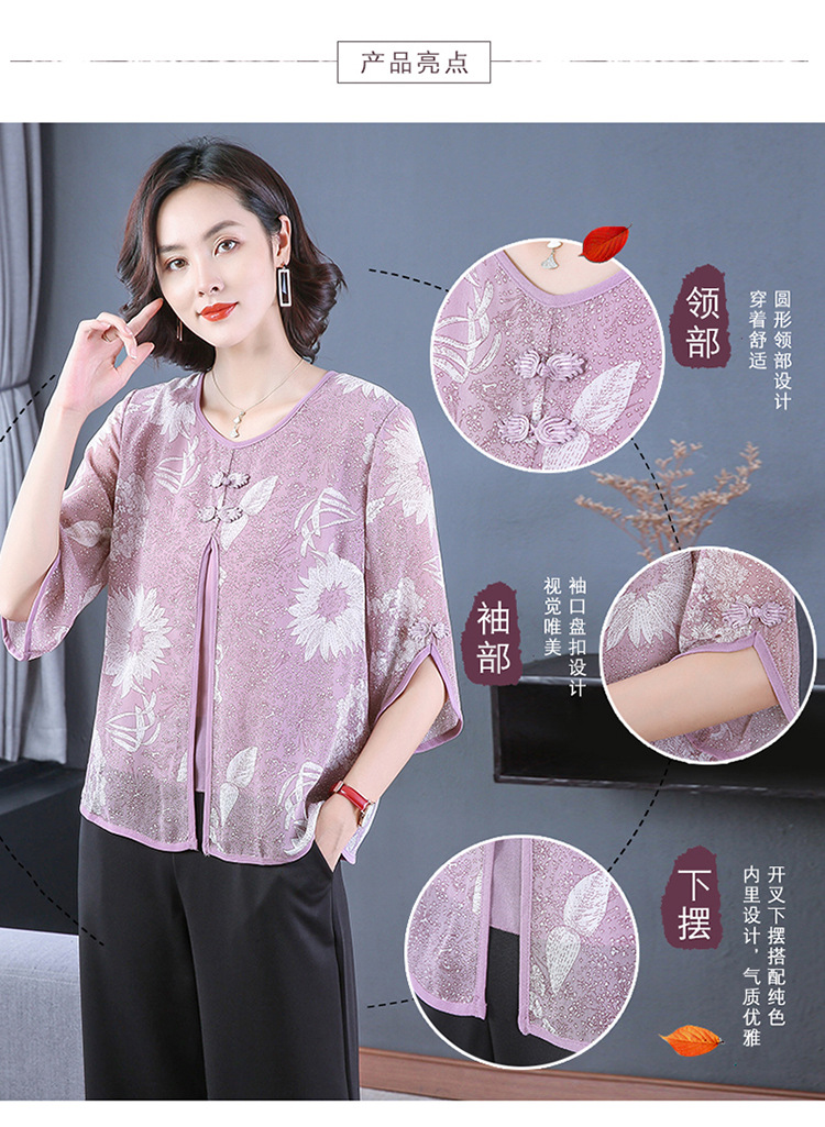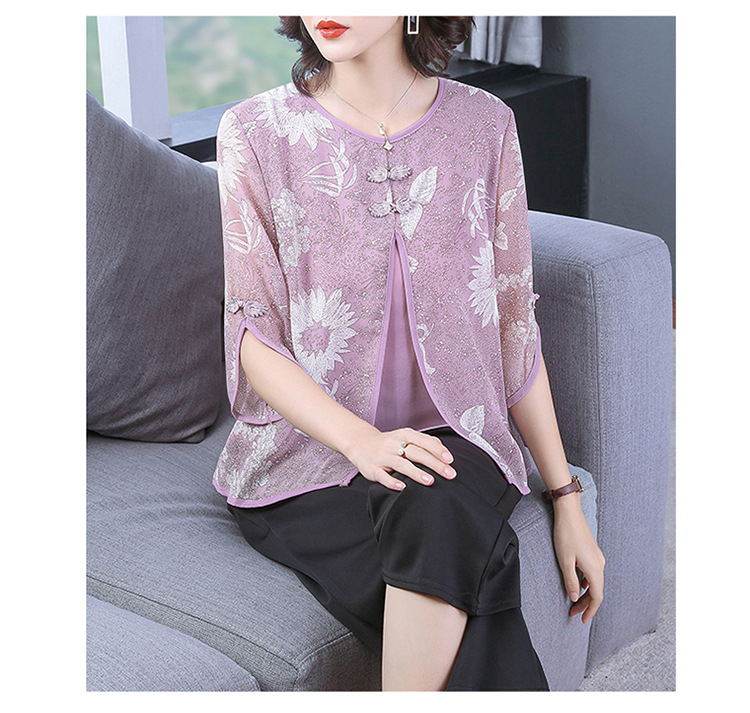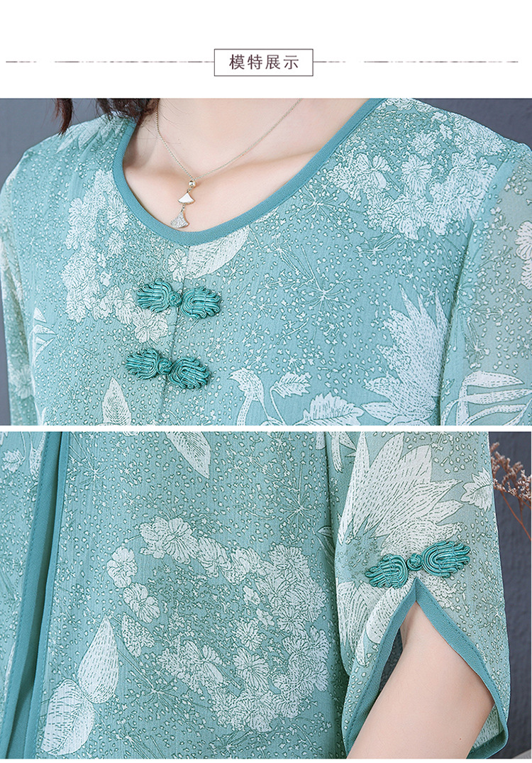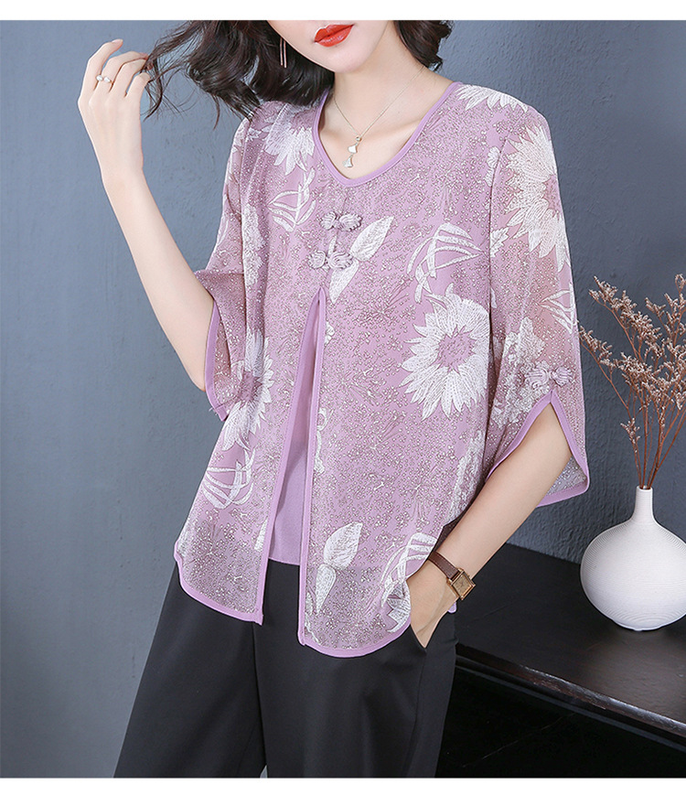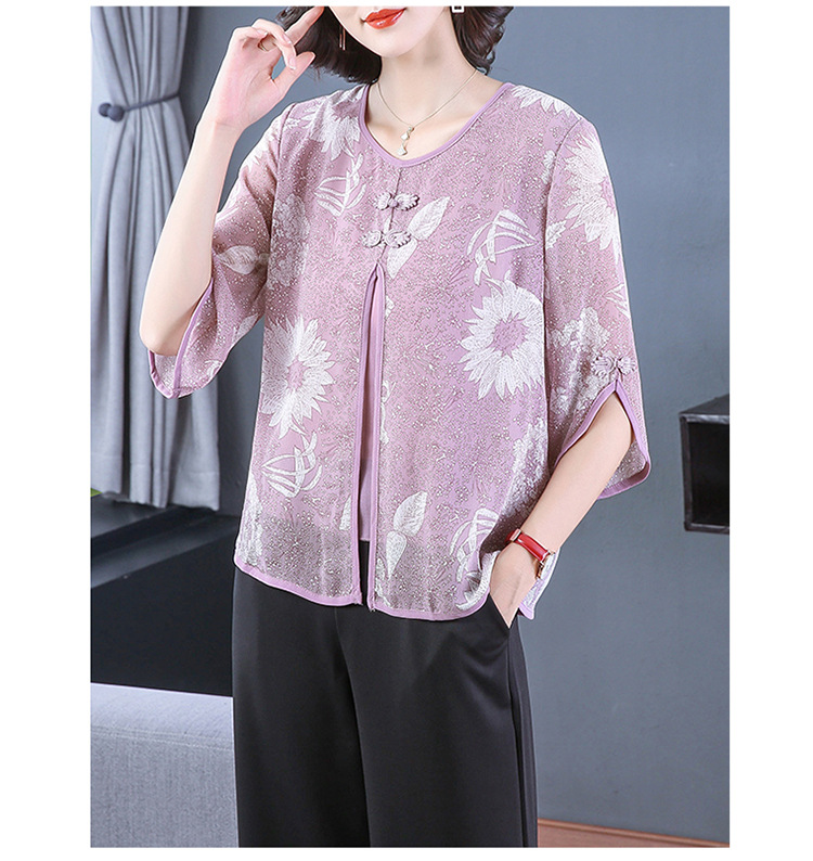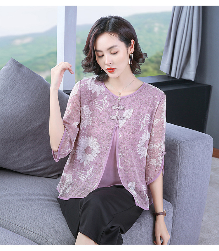2023 여름 새로운 스타일 쉬폰 셔츠 우아한 인쇄 느슨한 새로운 중국 스타일 우아한 라운드 넥 반 소매 가짜 투피스 탑