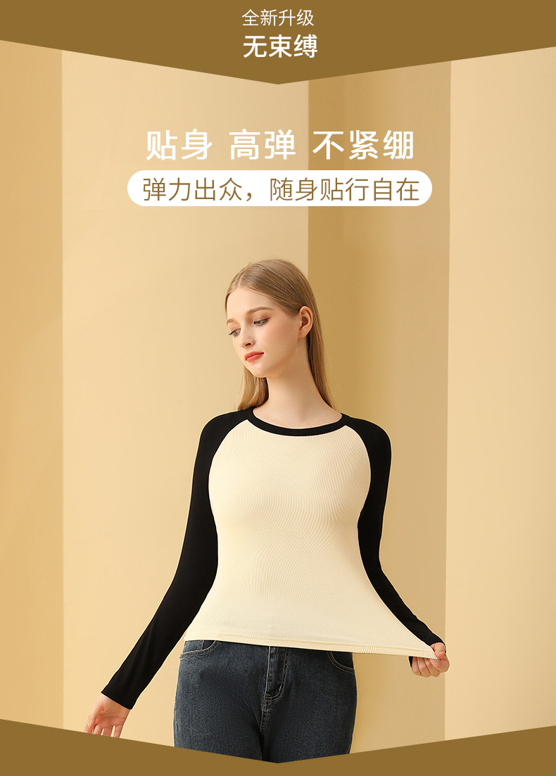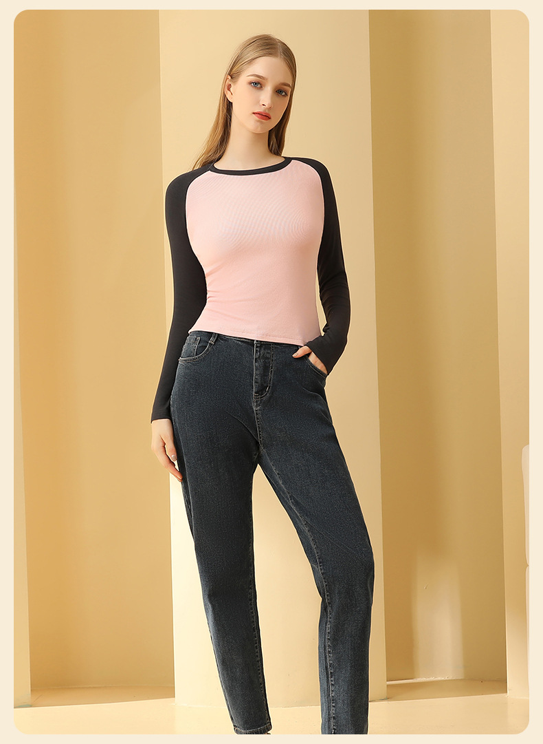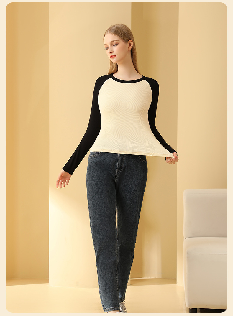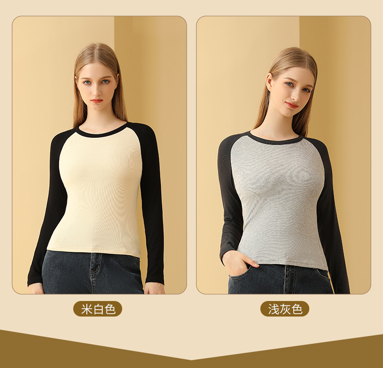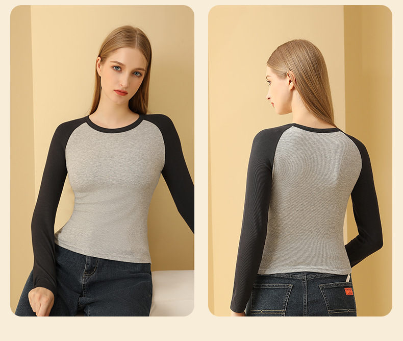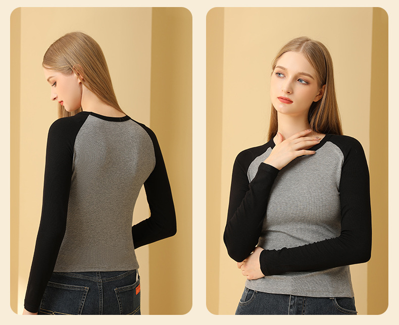 새로운 봄 가을 배색 스티치 이너 레이어드 셔츠 여성용 조루시 동일 스타일 래글런 긴팔 티셔츠 여성용 도매스토어 가기