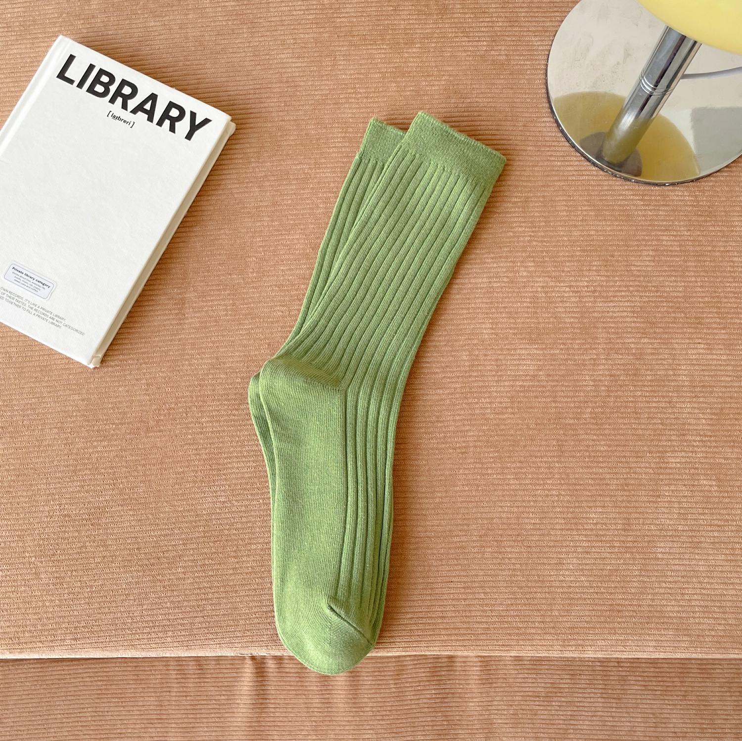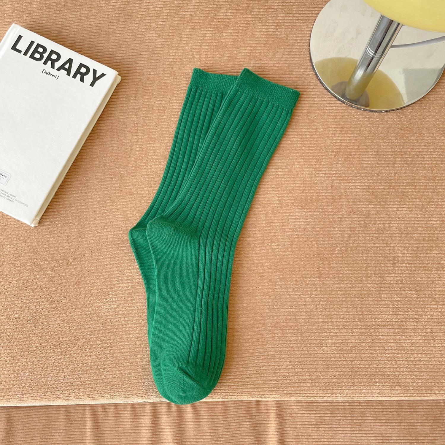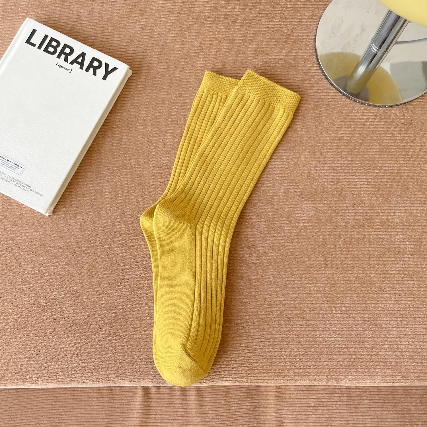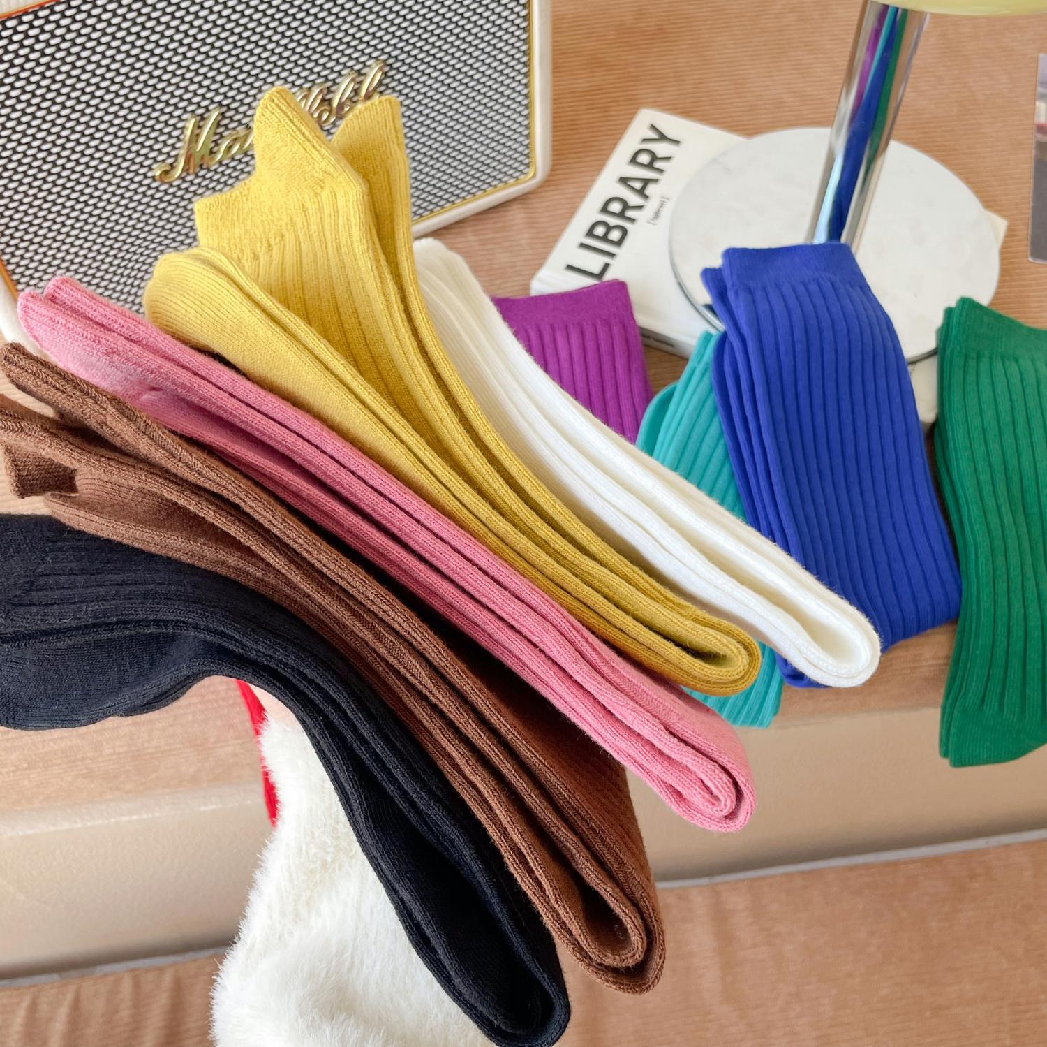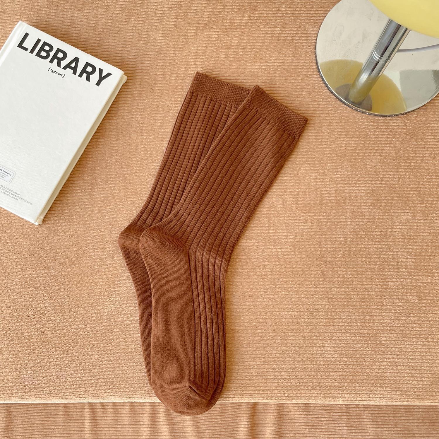 양말 여성용 순면 미드 튜브 면 양말 한국식 인스 타 그램 스타일 트렌디 솔리드 컬러 더블 니들 가을과 겨울을위한 여성용 세로 스트립 스택 양말스토어 가기