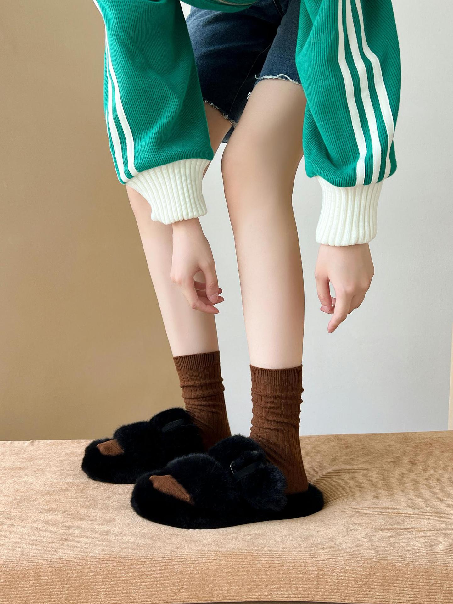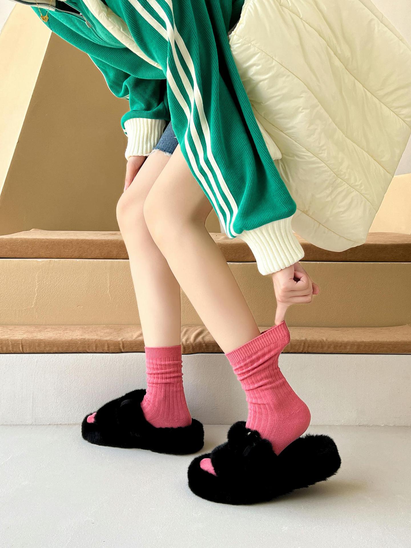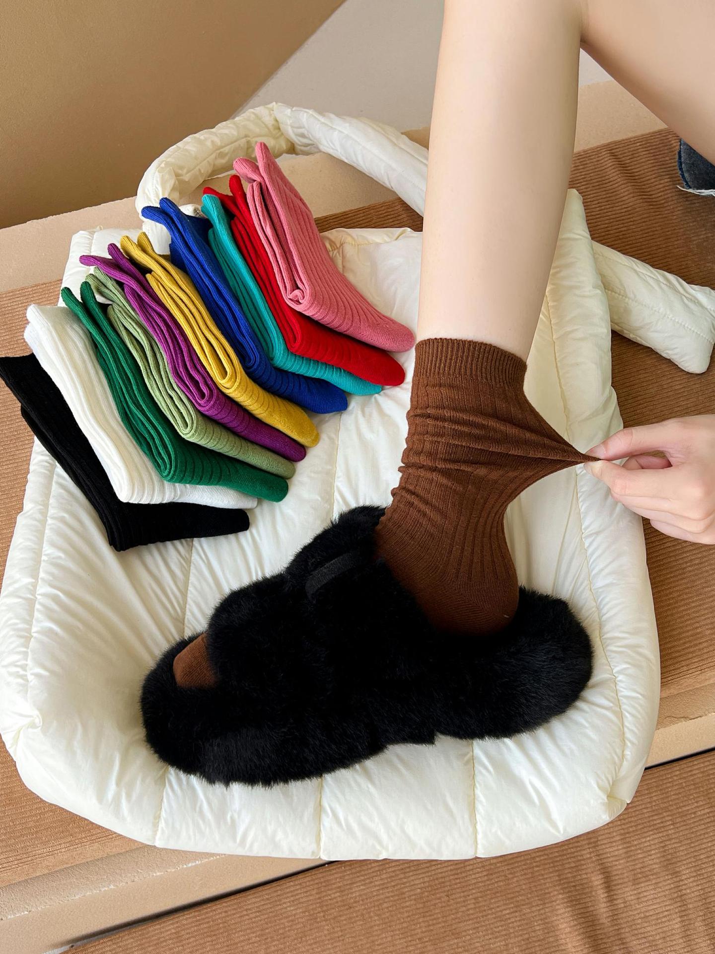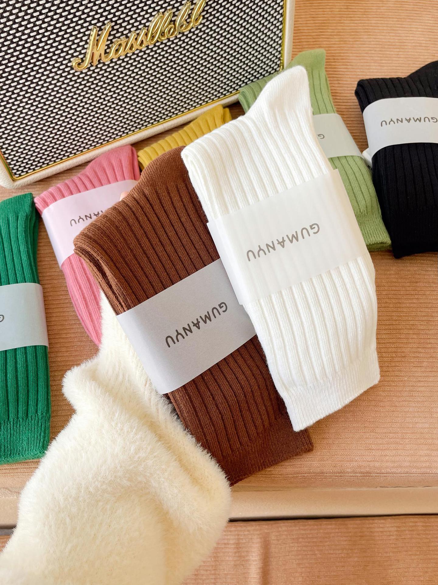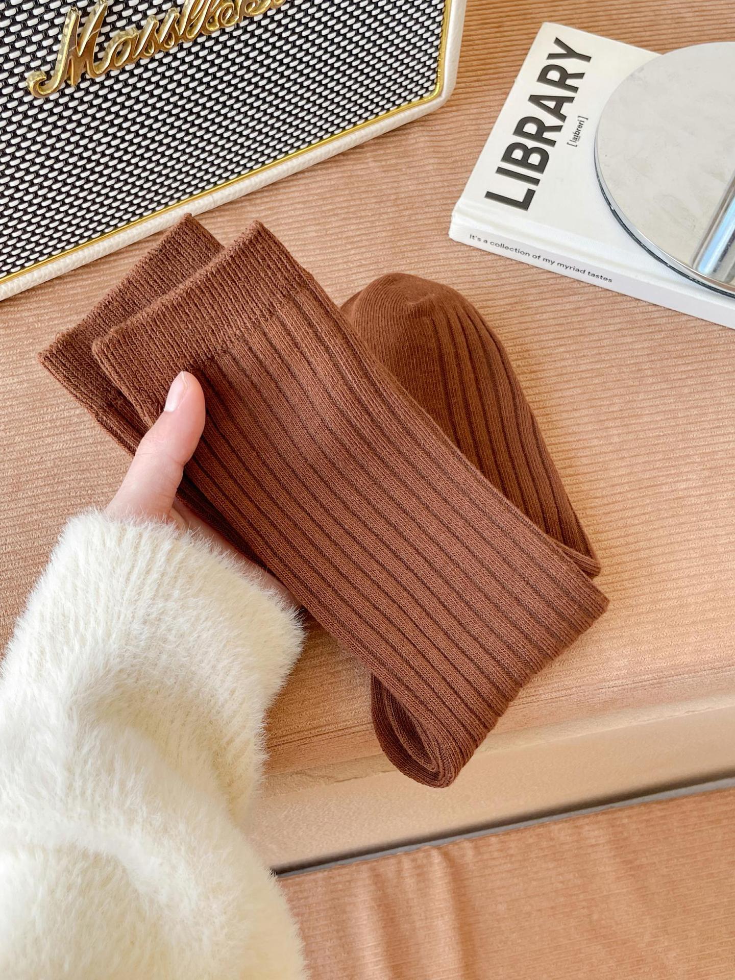 양말 여성용 순면 미드 튜브 면 양말 한국식 인스 타 그램 스타일 트렌디 솔리드 컬러 더블 니들 가을과 겨울을위한 여성용 세로 스트립 스택 양말스토어 가기