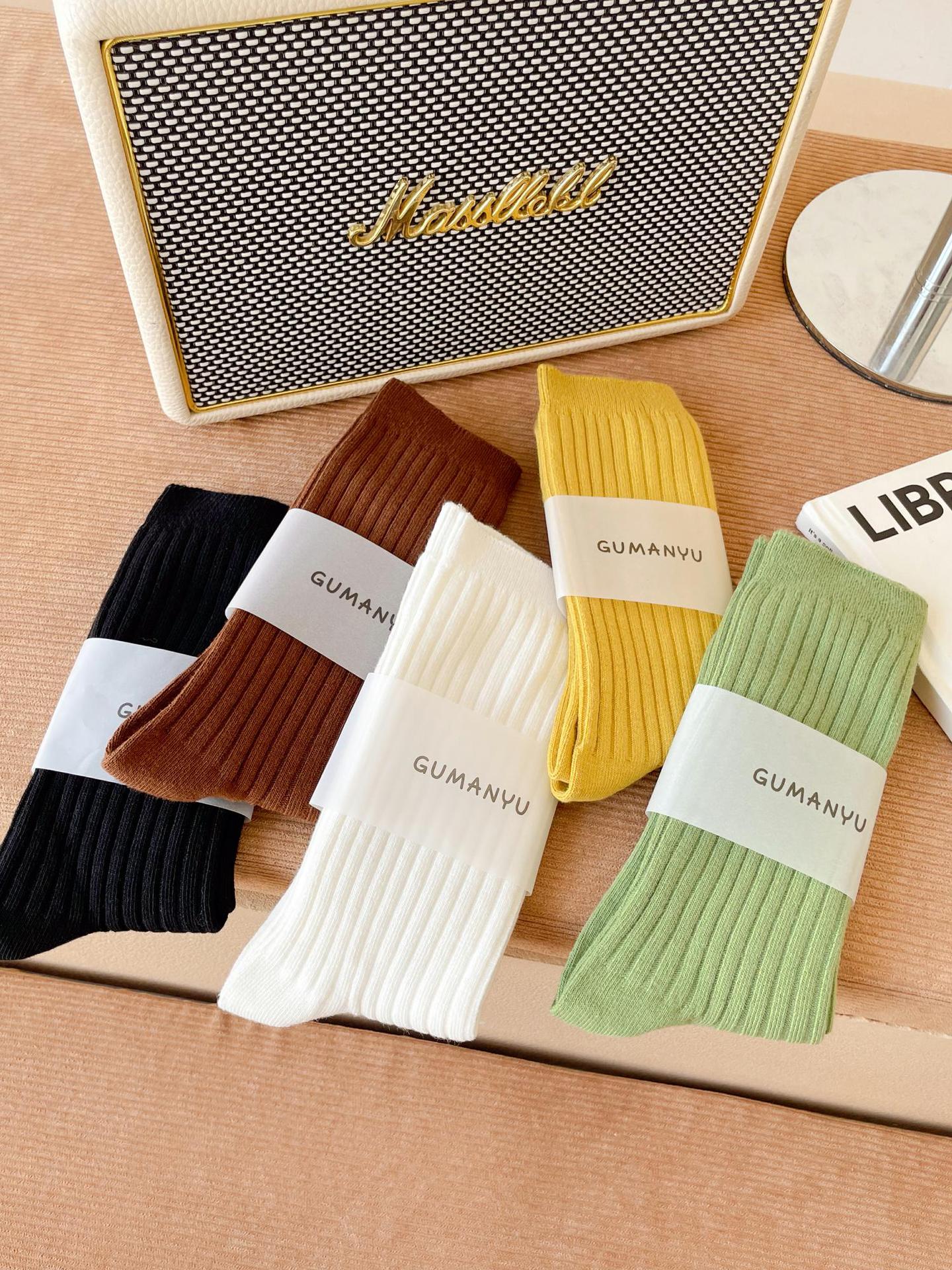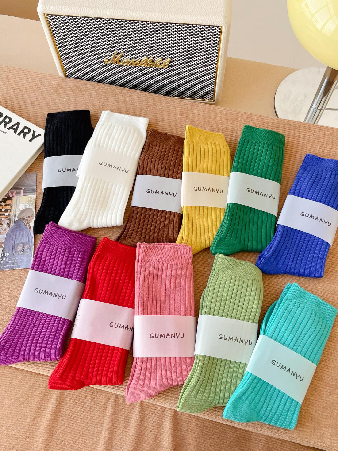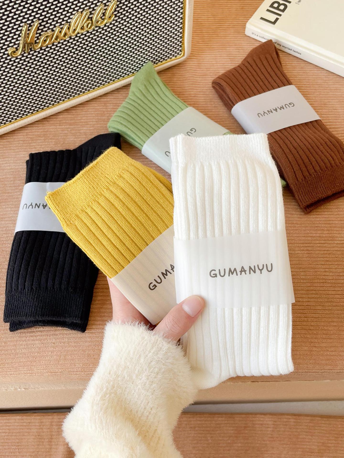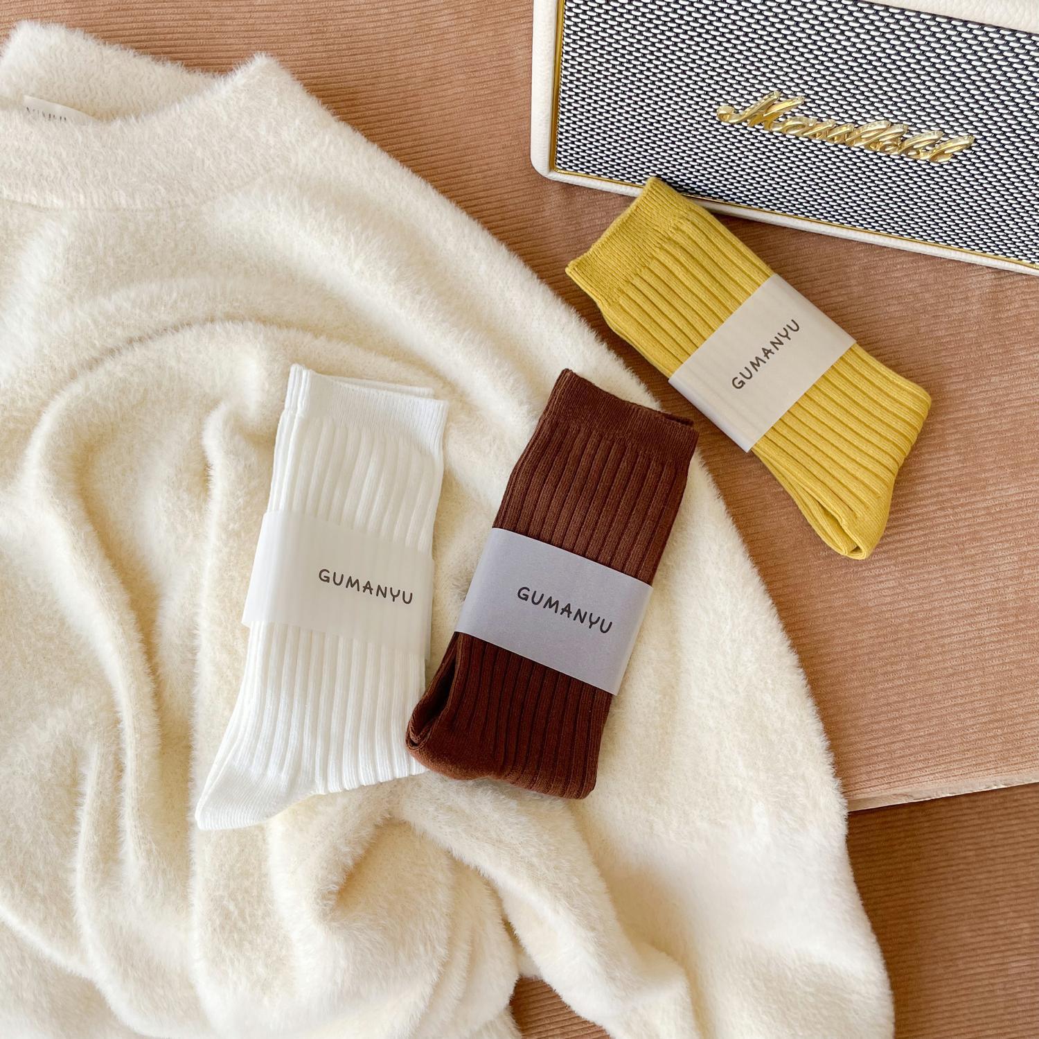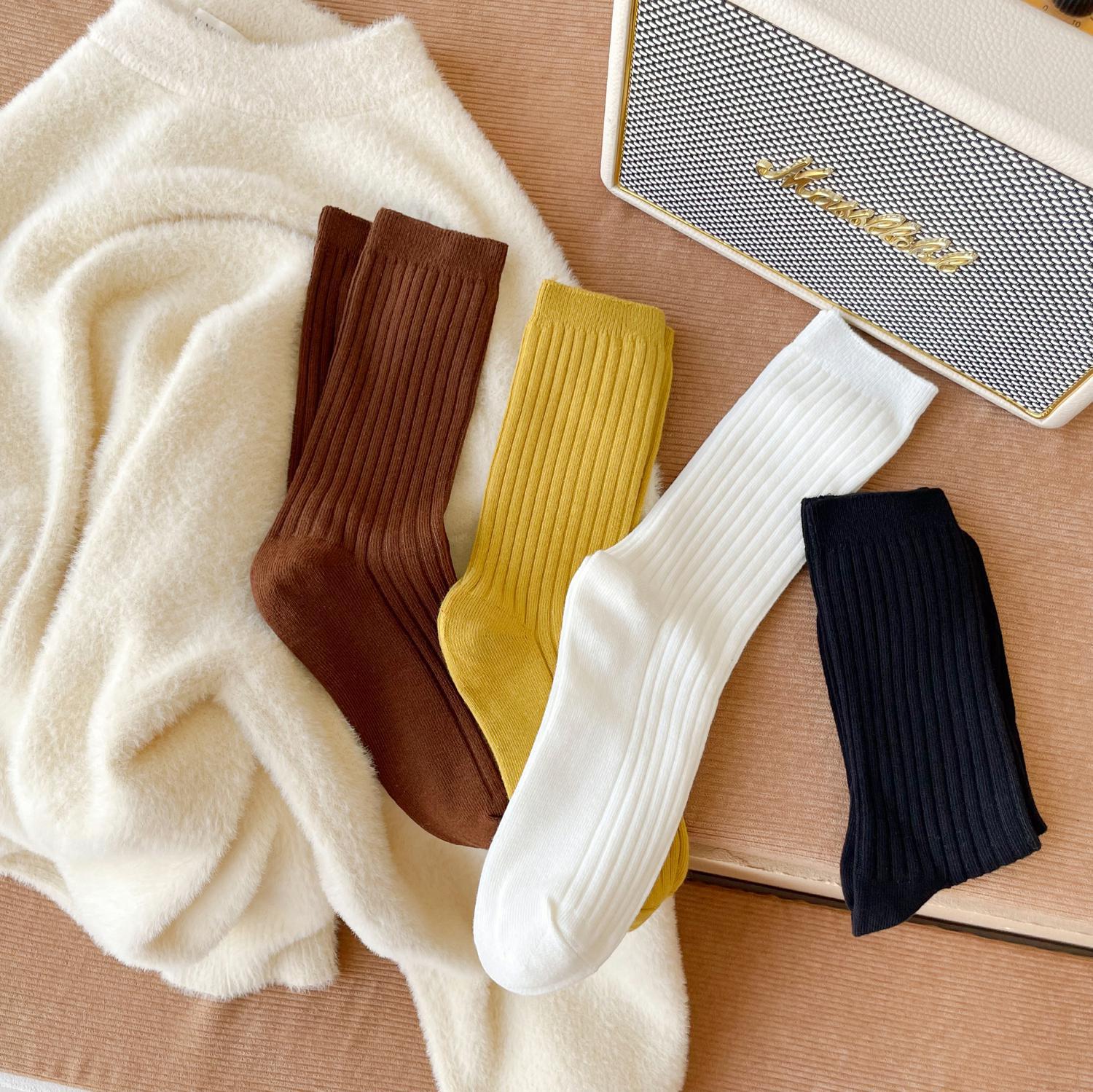 양말 여성용 순면 미드 튜브 면 양말 한국식 인스 타 그램 스타일 트렌디 솔리드 컬러 더블 니들 가을과 겨울을위한 여성용 세로 스트립 스택 양말