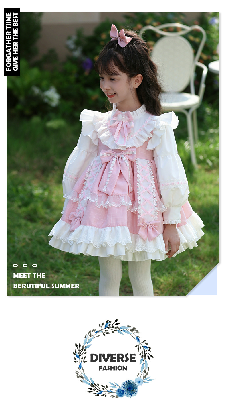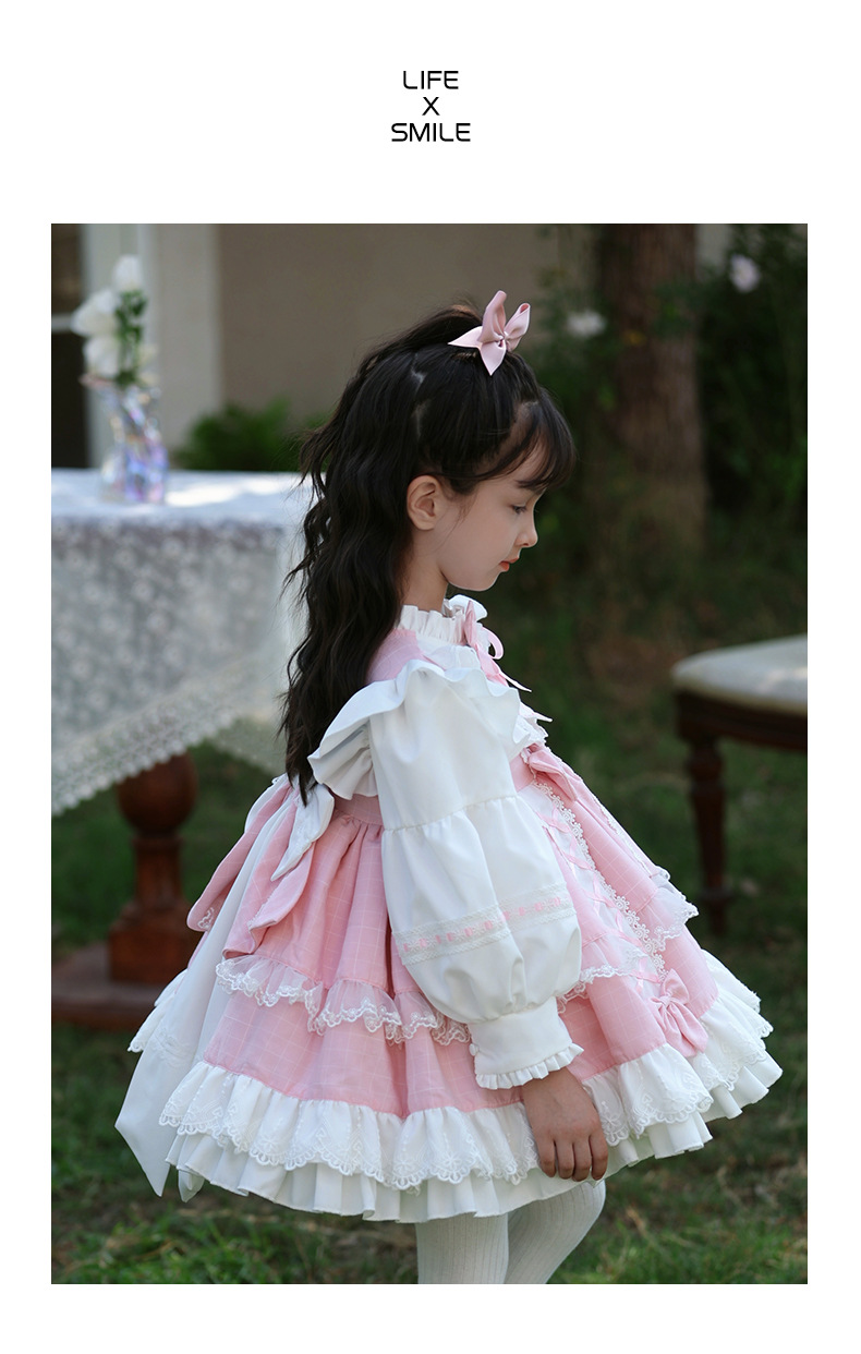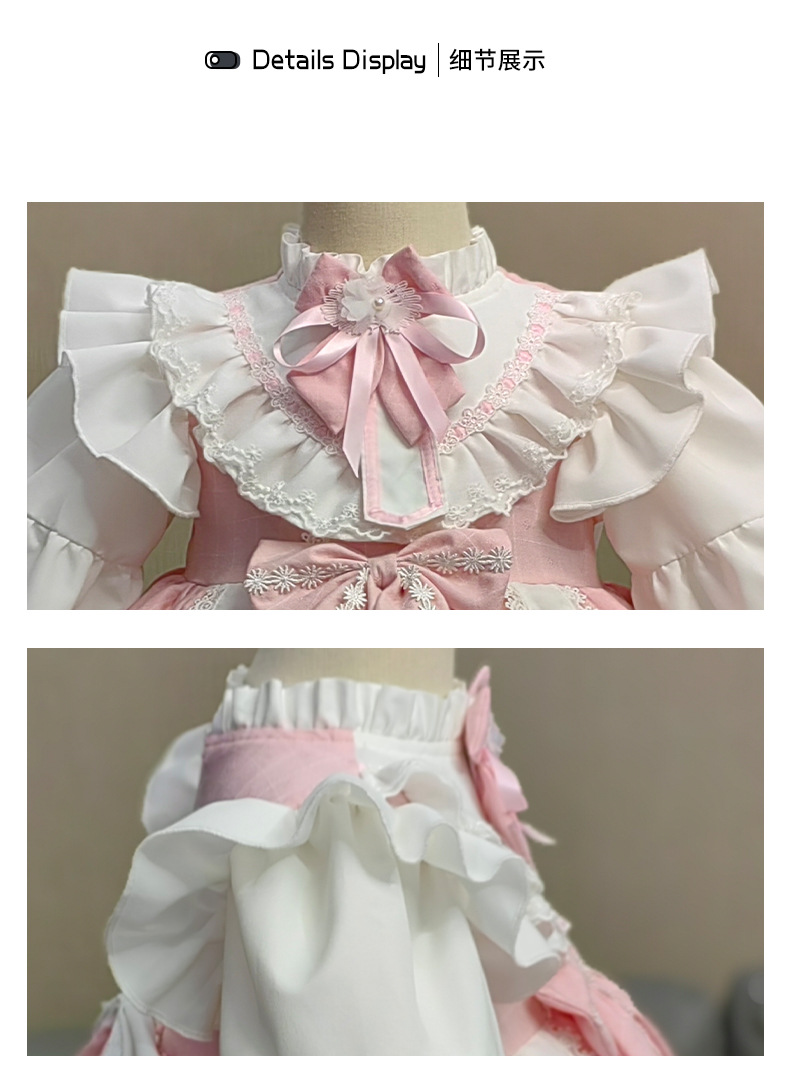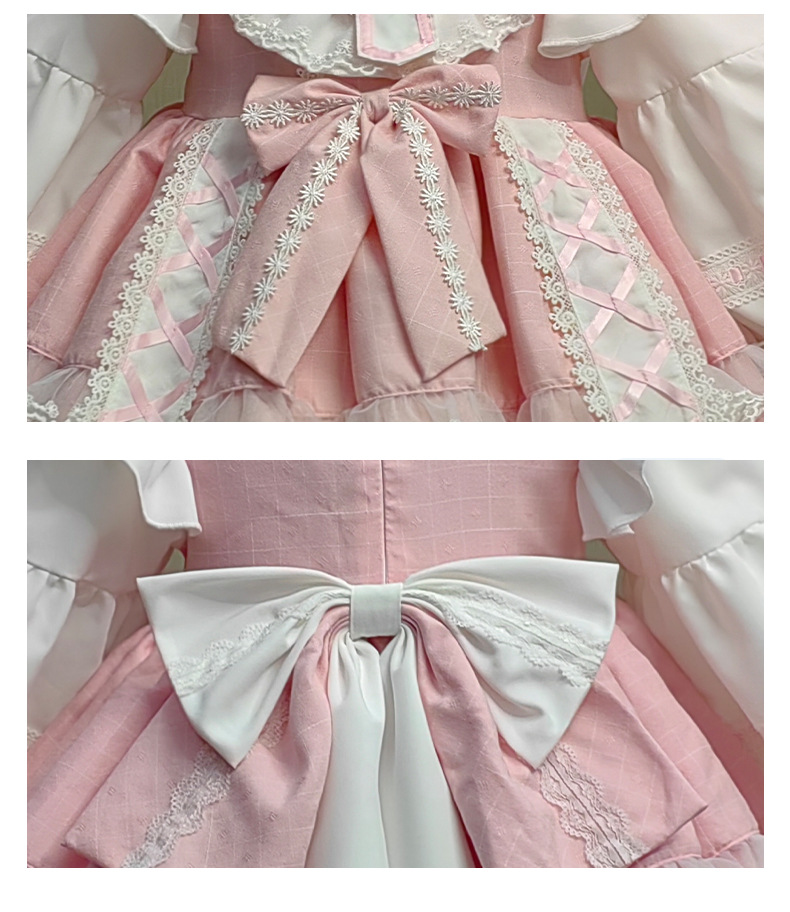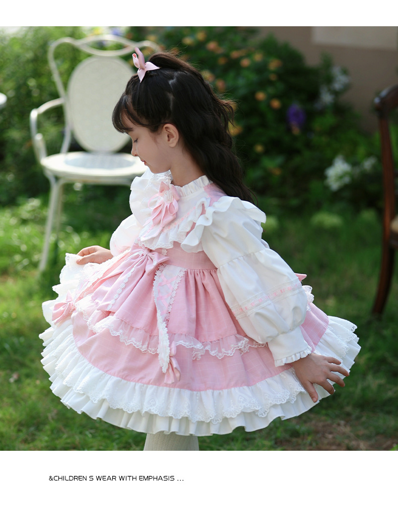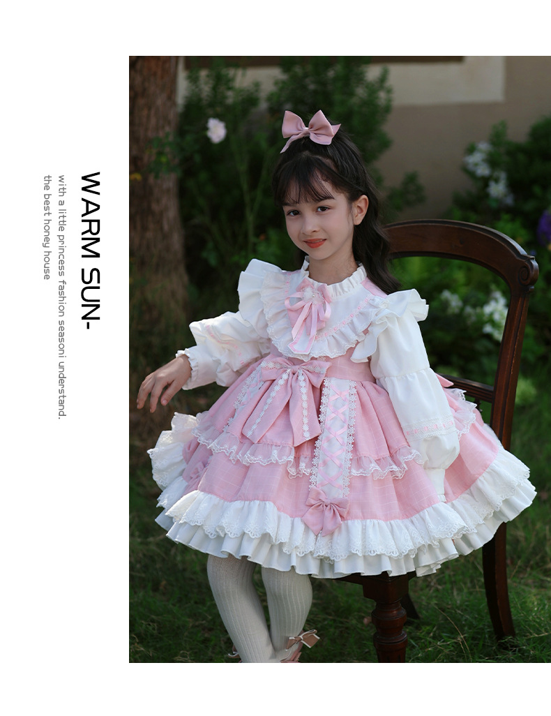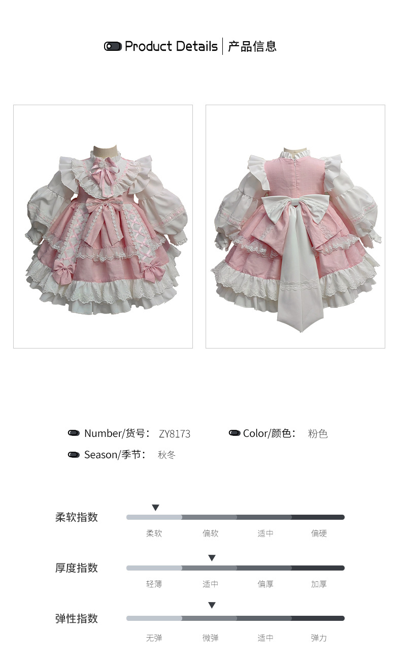 此款衣服贵在面料是订做的棉,里面都附了称的,这样的好处是让棉的衣服洗了也不会皱,花边和几个手工大蝴蝶结也很耗资!