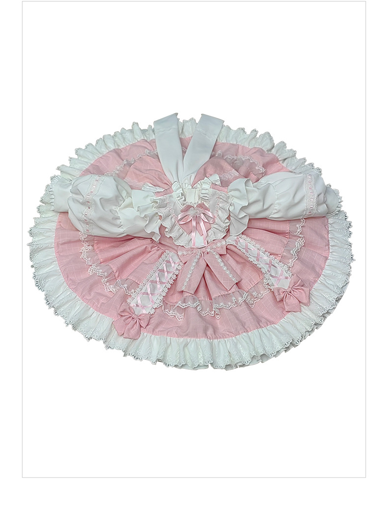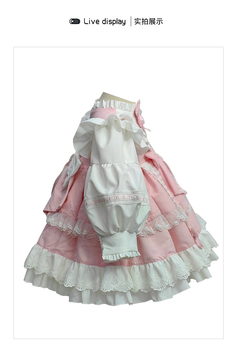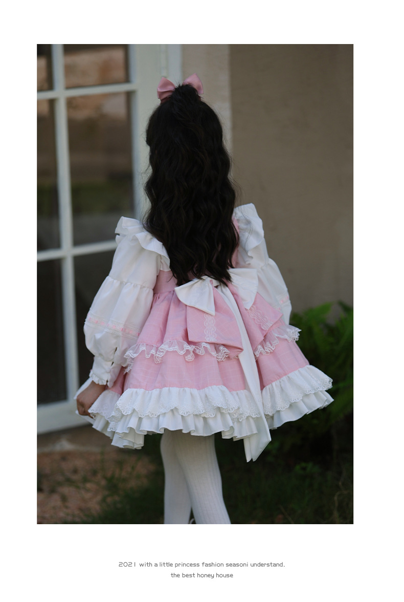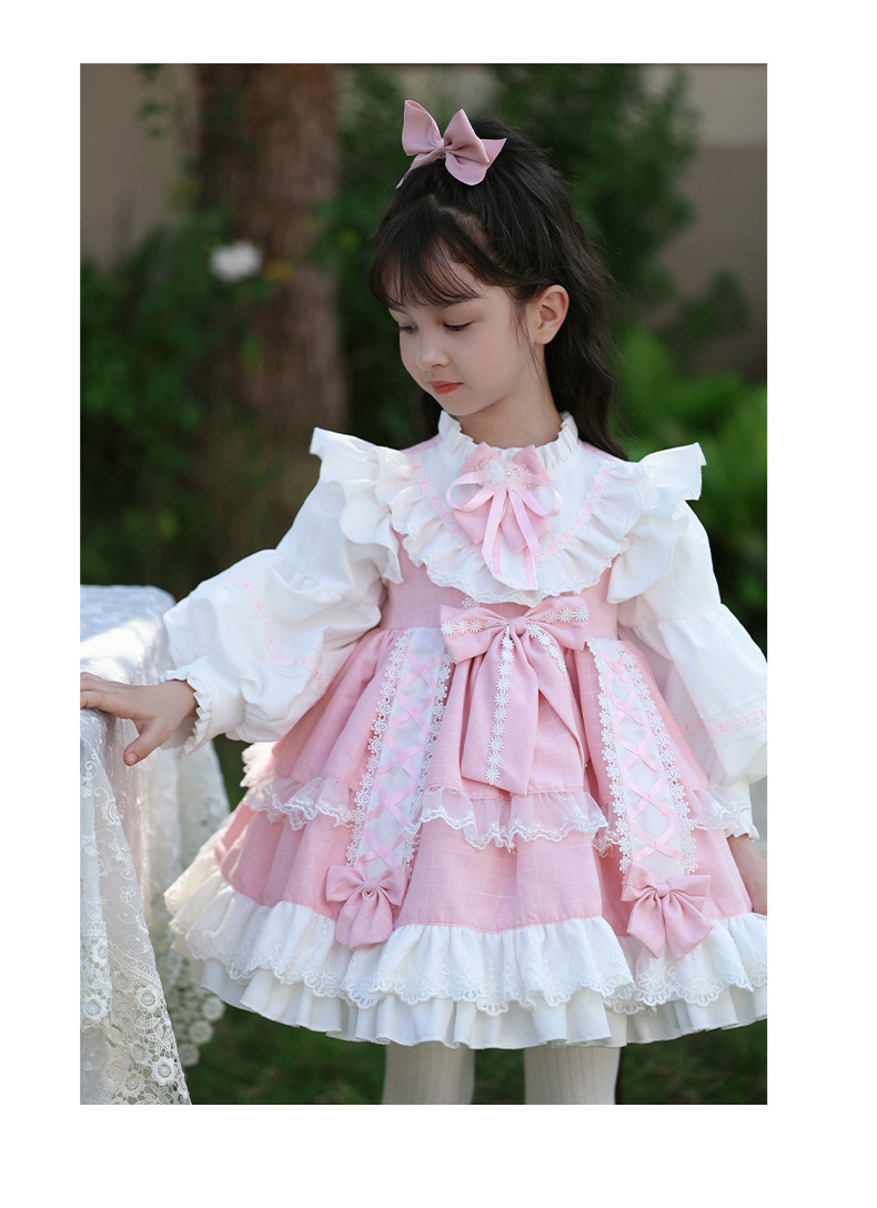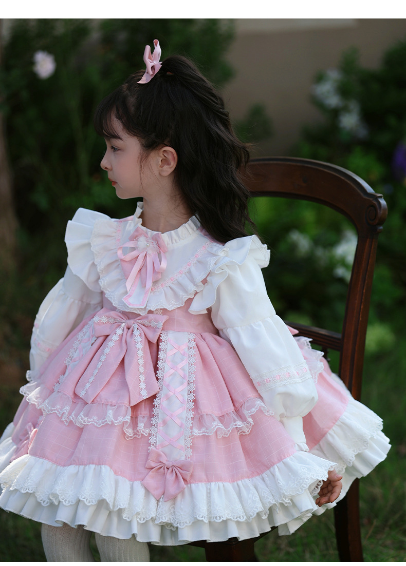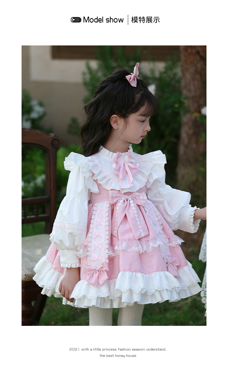 此款衣服贵在面料是订做的棉,里面都附了称的,这样的好处是让棉的衣服洗了也不会皱,花边和几个手工大蝴蝶结也很耗资!