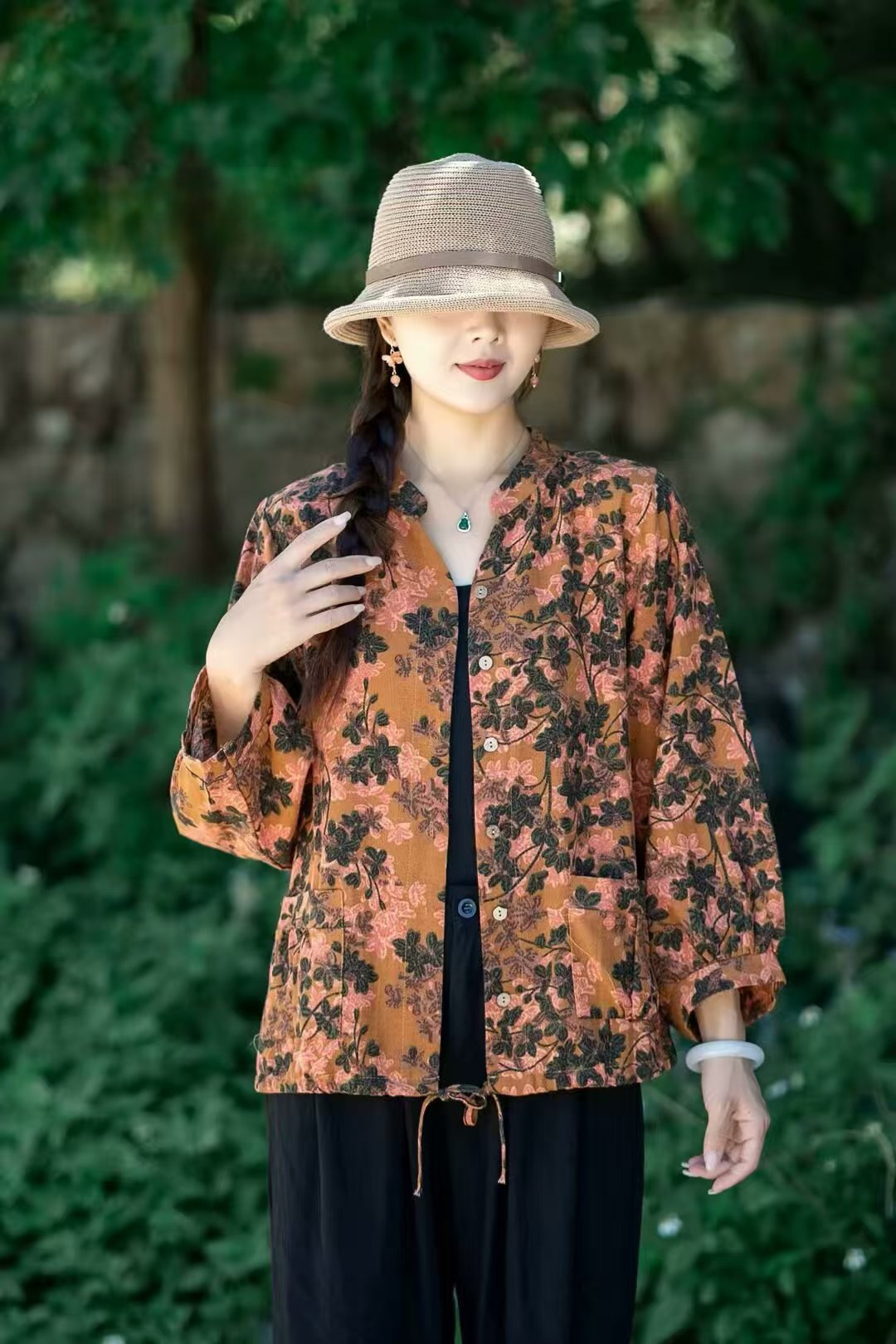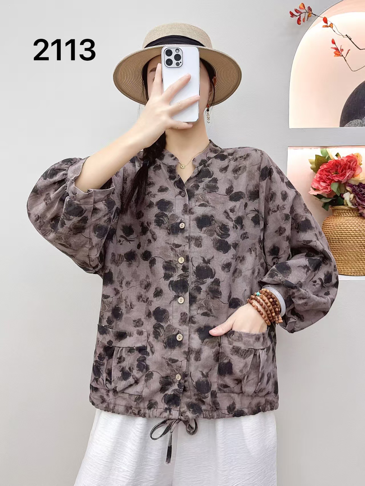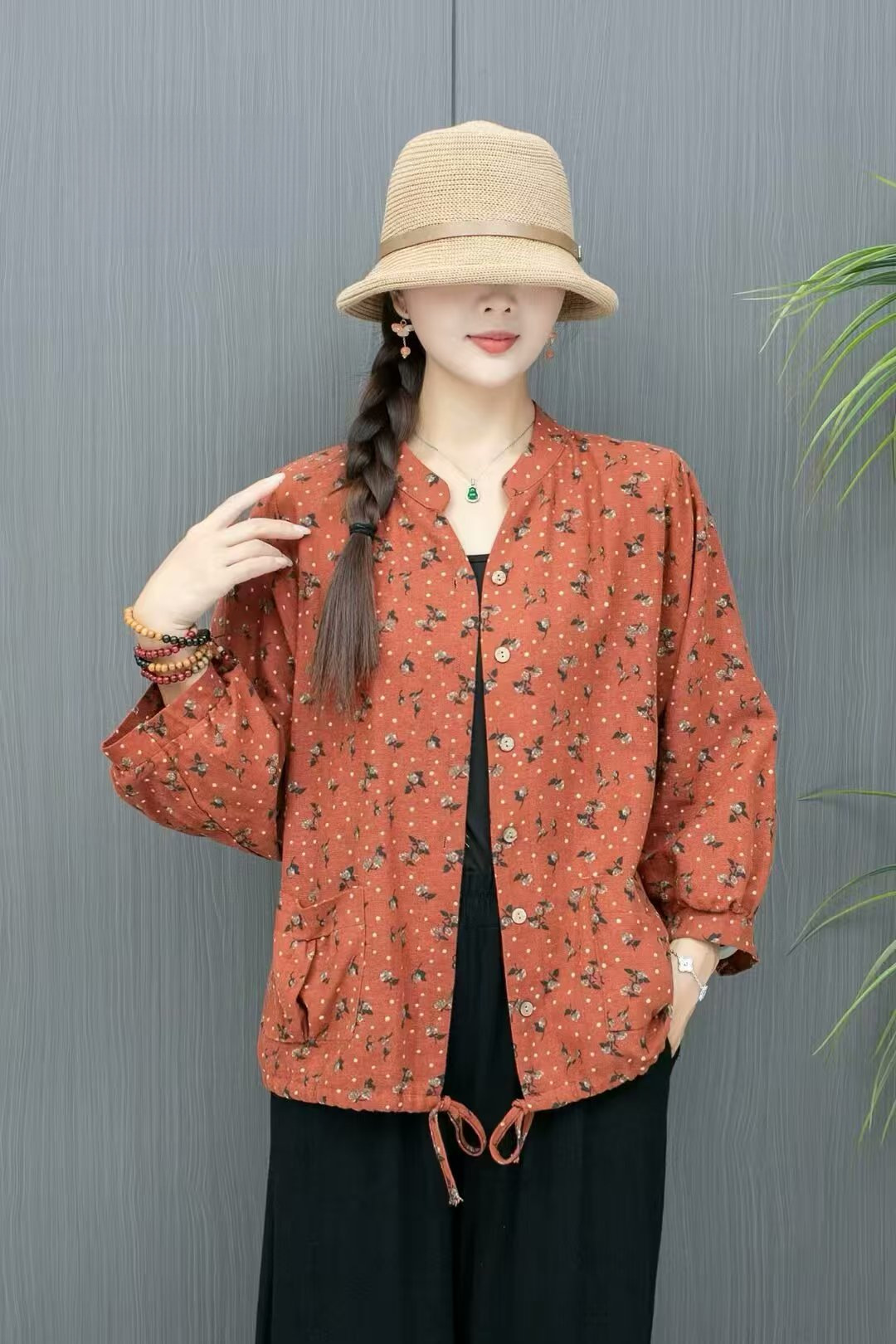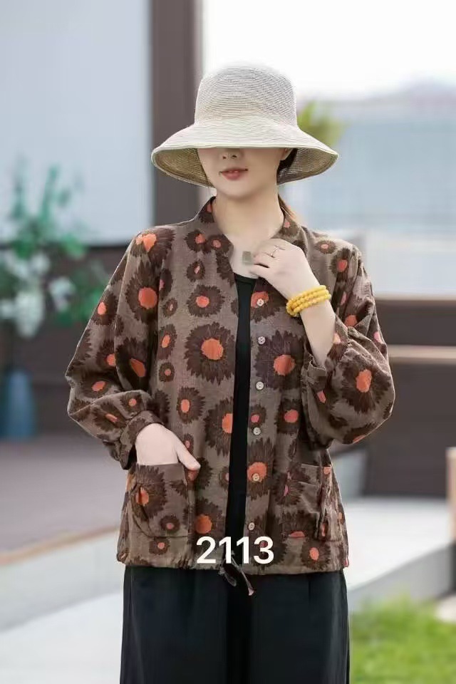 秋季新款水洗棉麻衬衫外套女宽松大码文艺复古中国风女式印花开衫 RMB:27.00