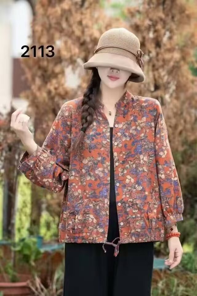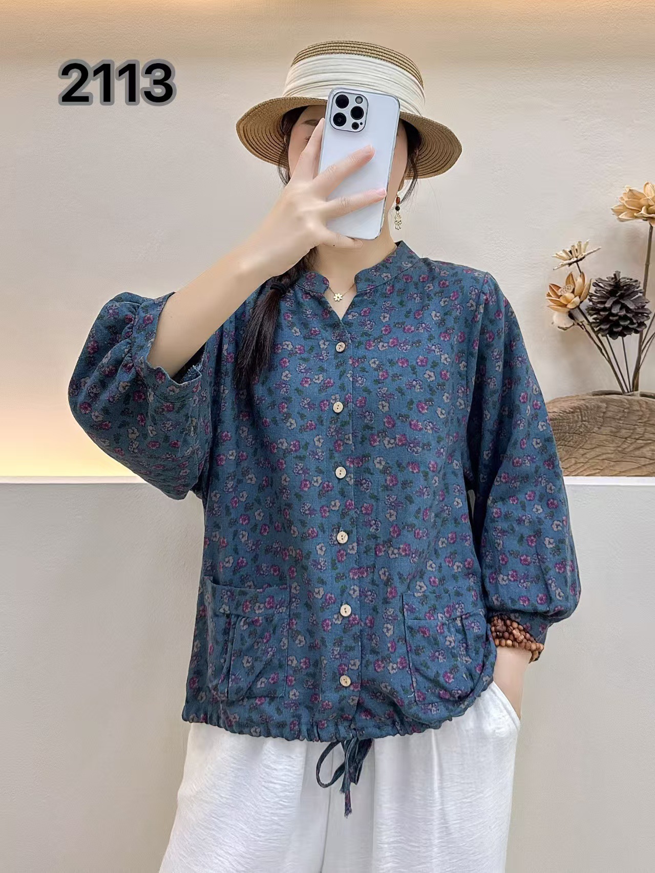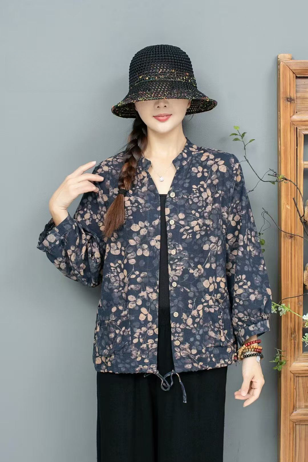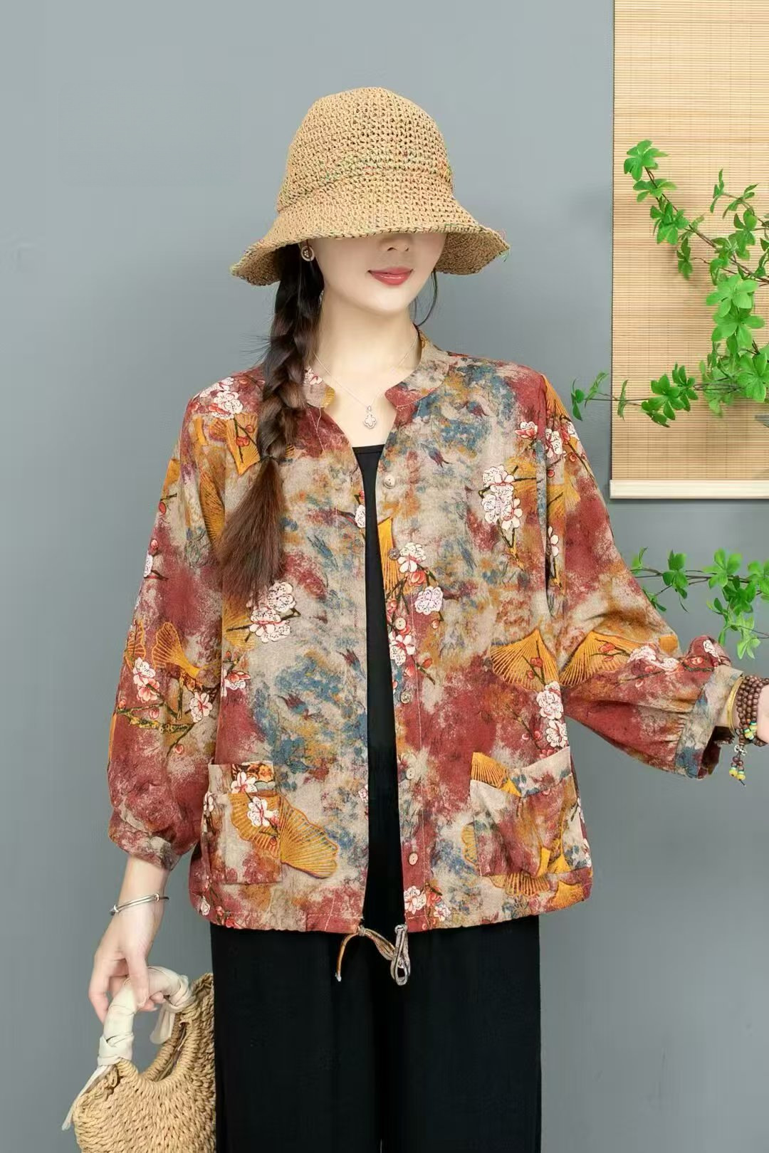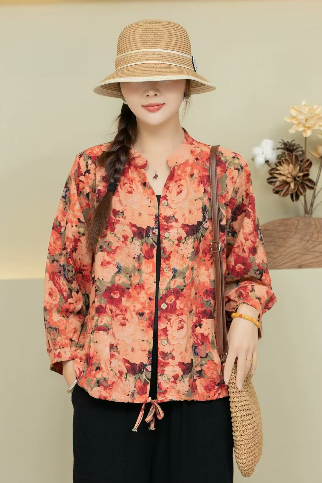 秋季新款水洗棉麻衬衫外套女宽松大码文艺复古中国风女式印花开衫 RMB:27.00
